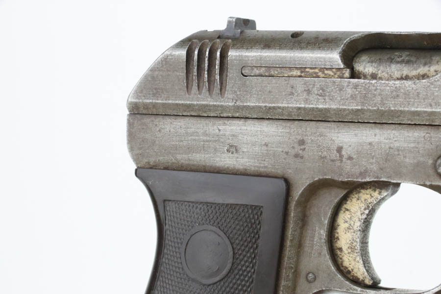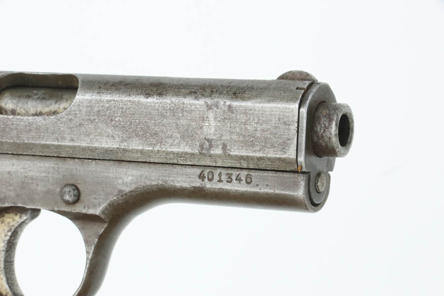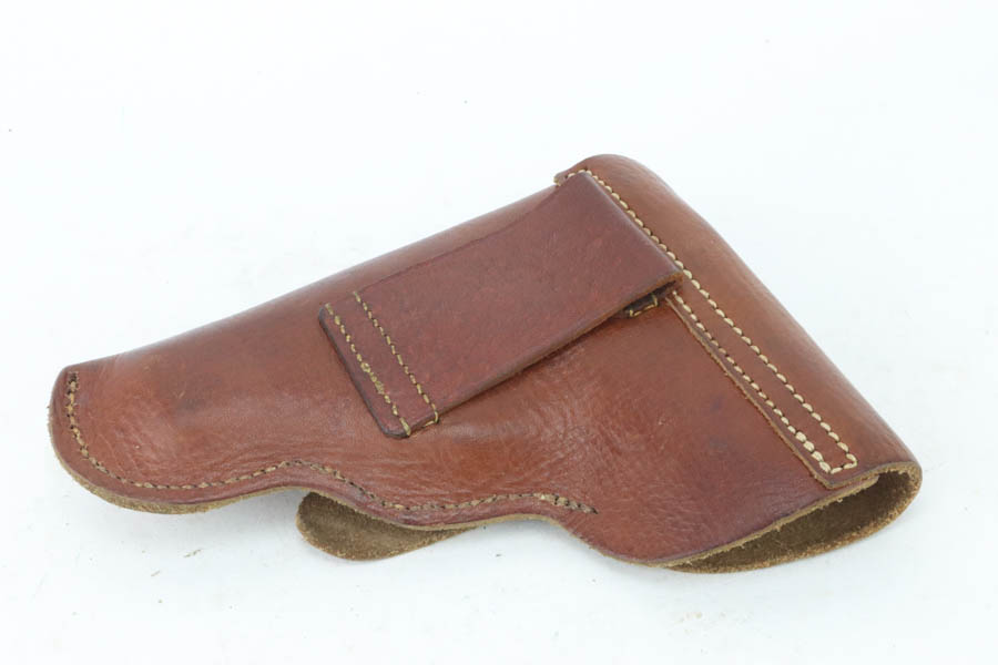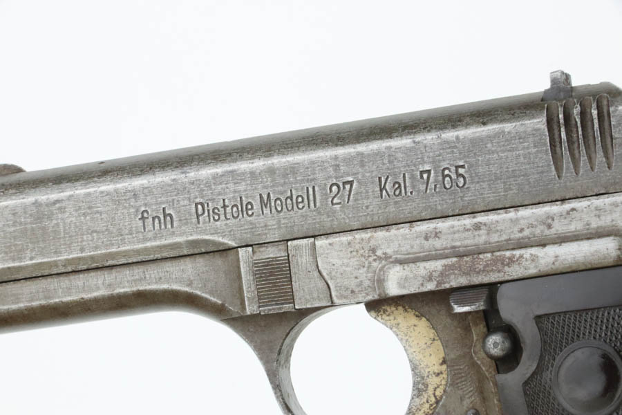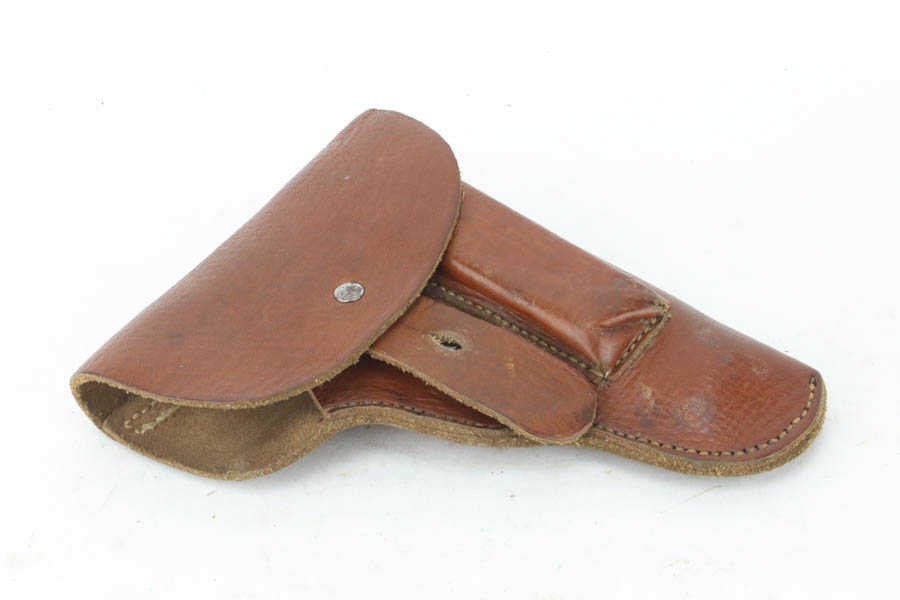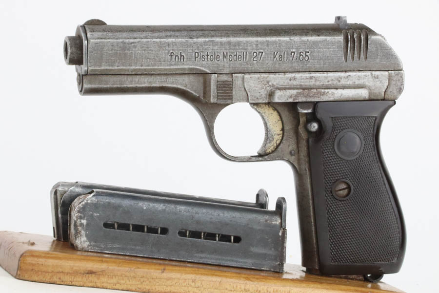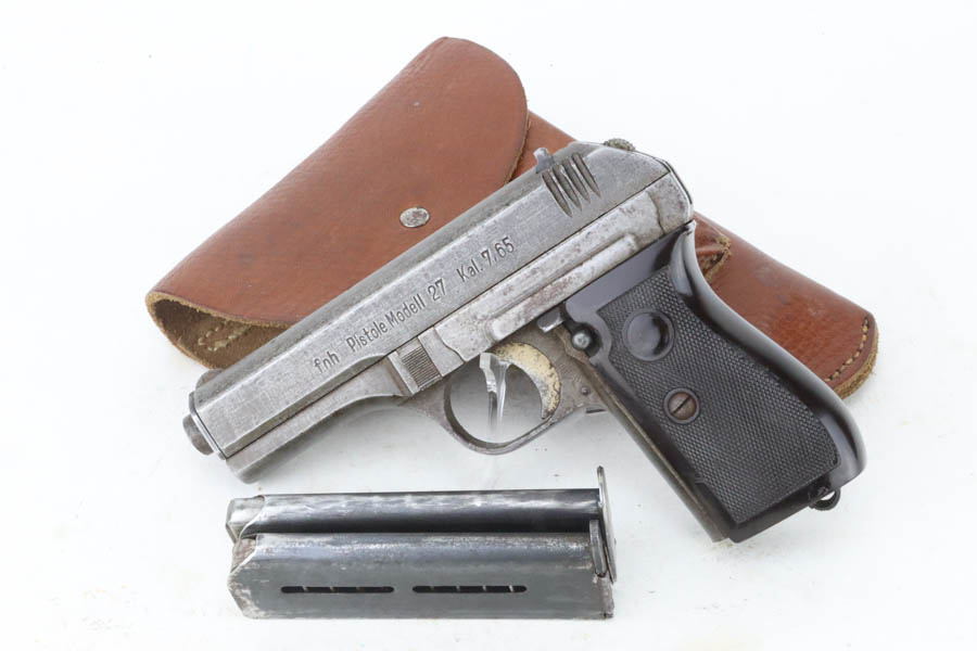 8/1/24 – This is a late-war CZ 27 issued to the Nazi military during WW2. All matching, “Waffen 76” proofed, and has a late-war phosphate finish. It comes as a rig with one proper magazine, an un-marked tan leather holster, and a spare magazine that looks like it actually belongs to an Astra. These phosphate finishes are a bit difficult to rate, but we estimate it has retained roughly 80%. There is obvious thinning and light spotty oxidation throughout. Fitted with a proper late-war bakelite grip – no chips or cracks. Near-mint bore.