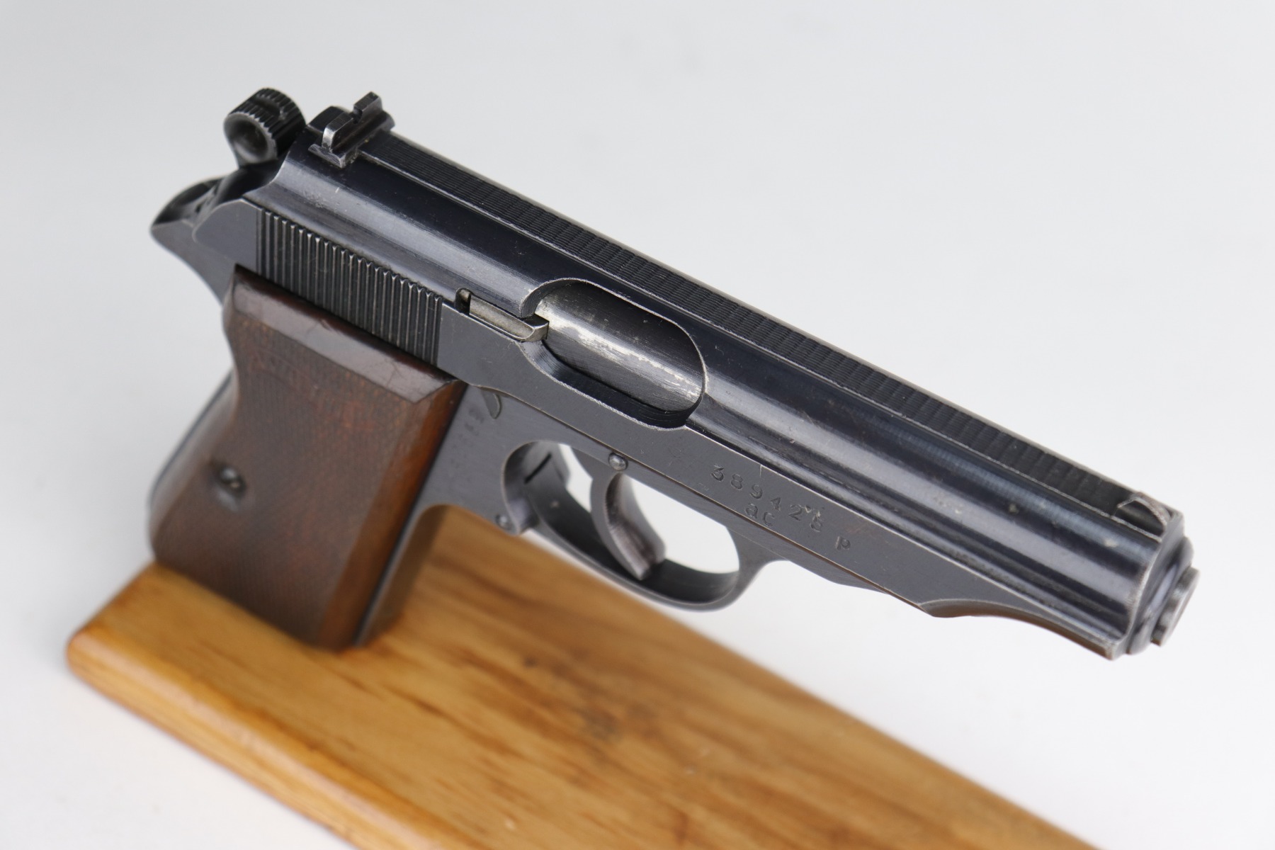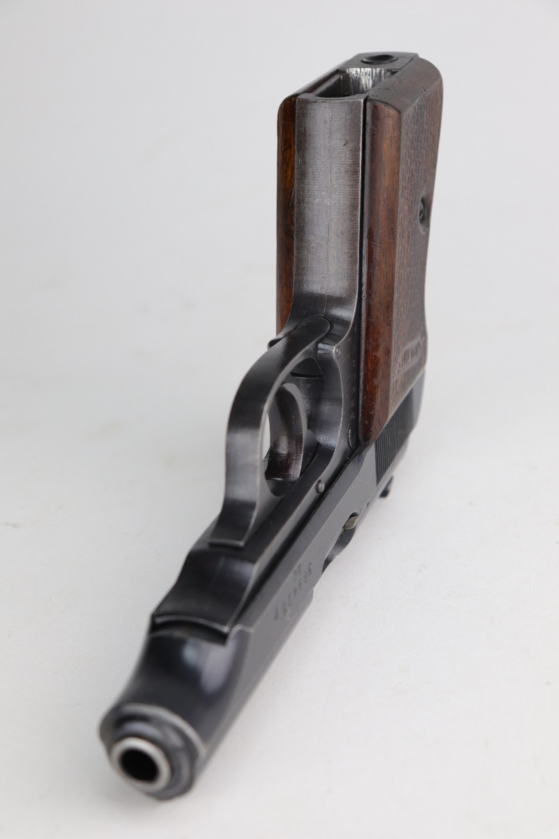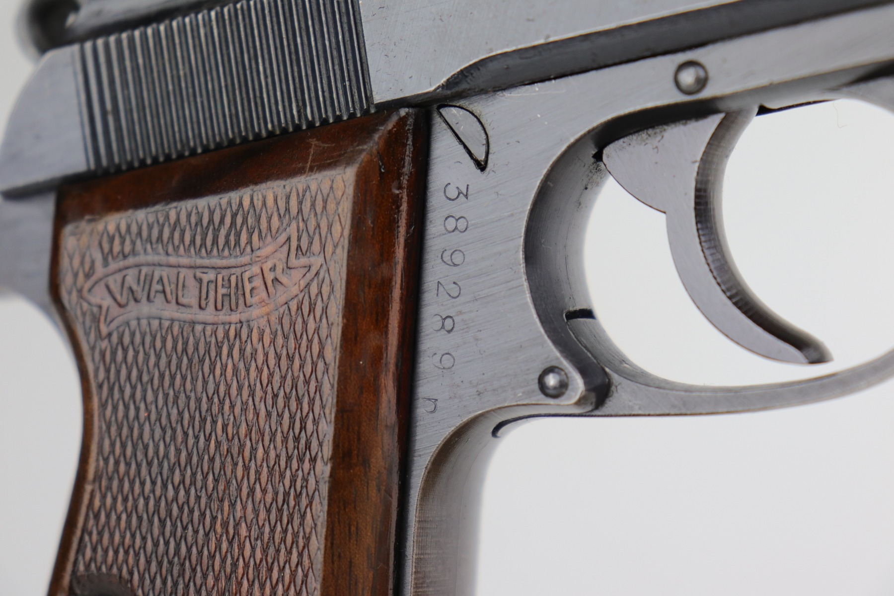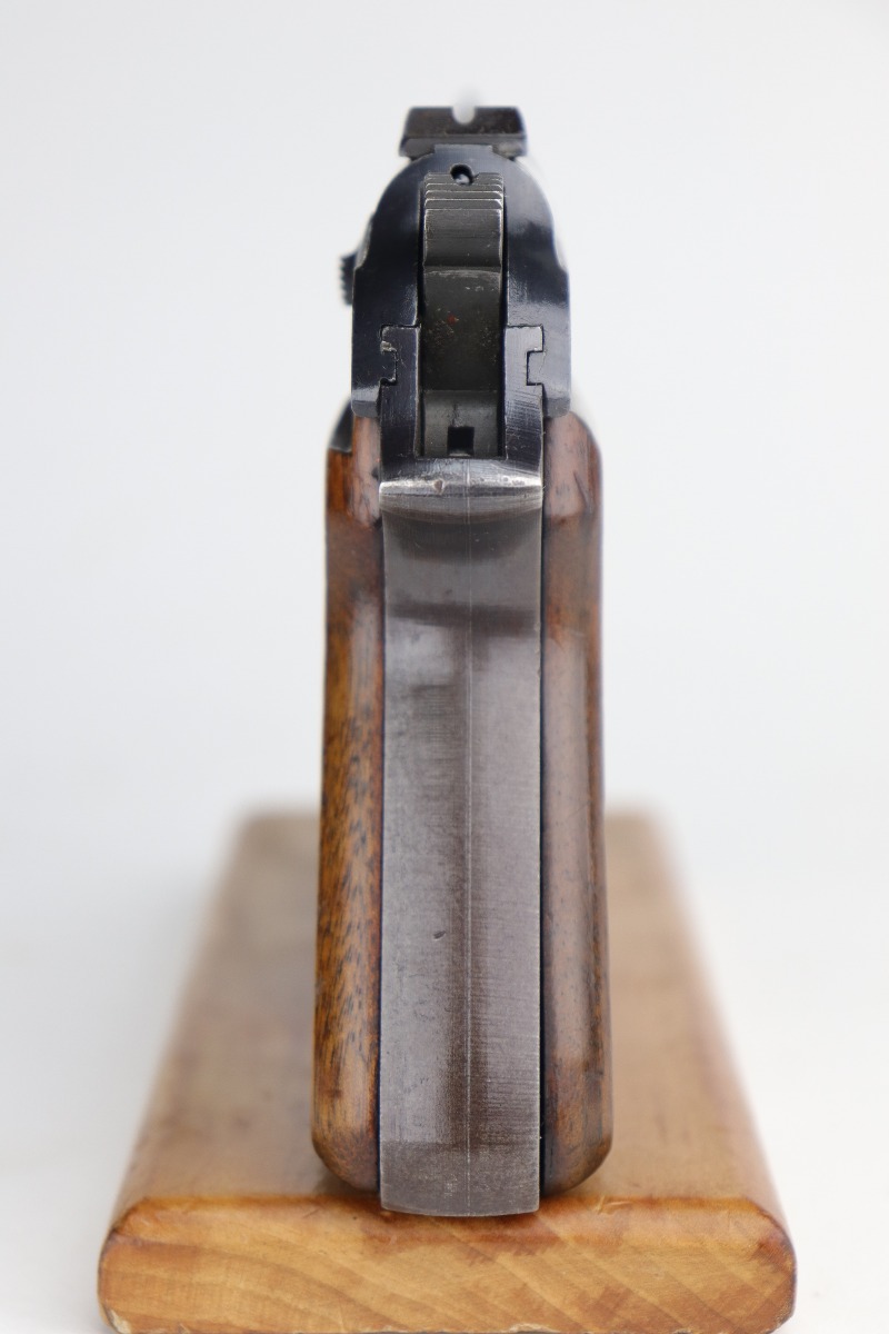 12/22/20 – This is a very nice example of an end-of-war, GI-assembled PP rig. This is a known and documented variation where the slide and frame are mismatched, no slide legend, and were assembled by GI’s at the end of the war. This particular gun is in the correct serial range for this variation. The rig comes with two correct magazines and a nice Akah-marked holster. The gun has retained about 92-93% of its original finish. There is thinning and patina on the straps. Very light wear around the muzzle and a few spots of wear along the right side of the slide. Very light scratch on the left side of the frame. It has late-war wooden Walther grips. The bore is excellent – shiny with strong rifling.