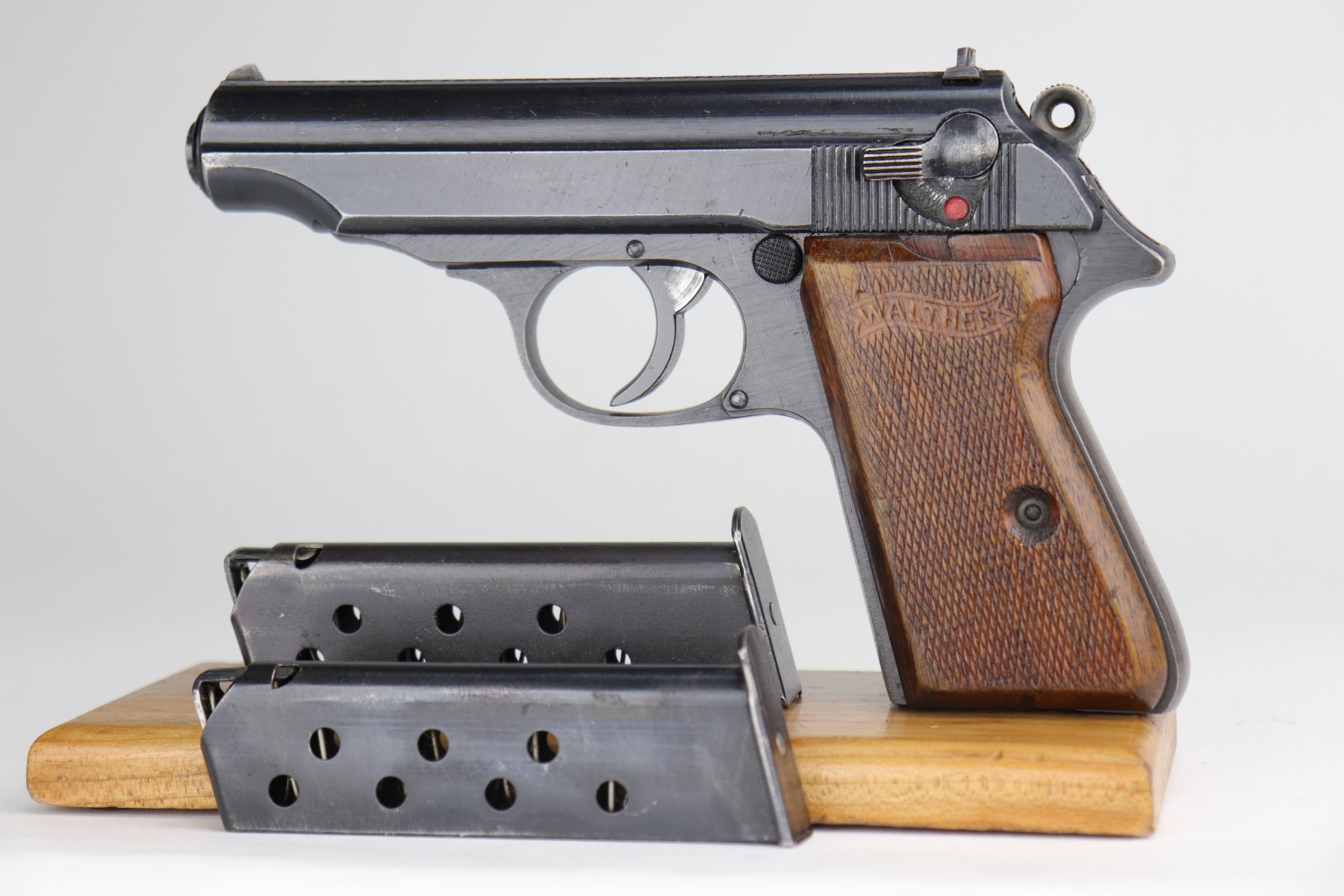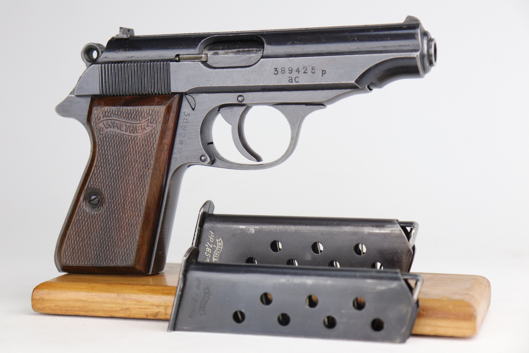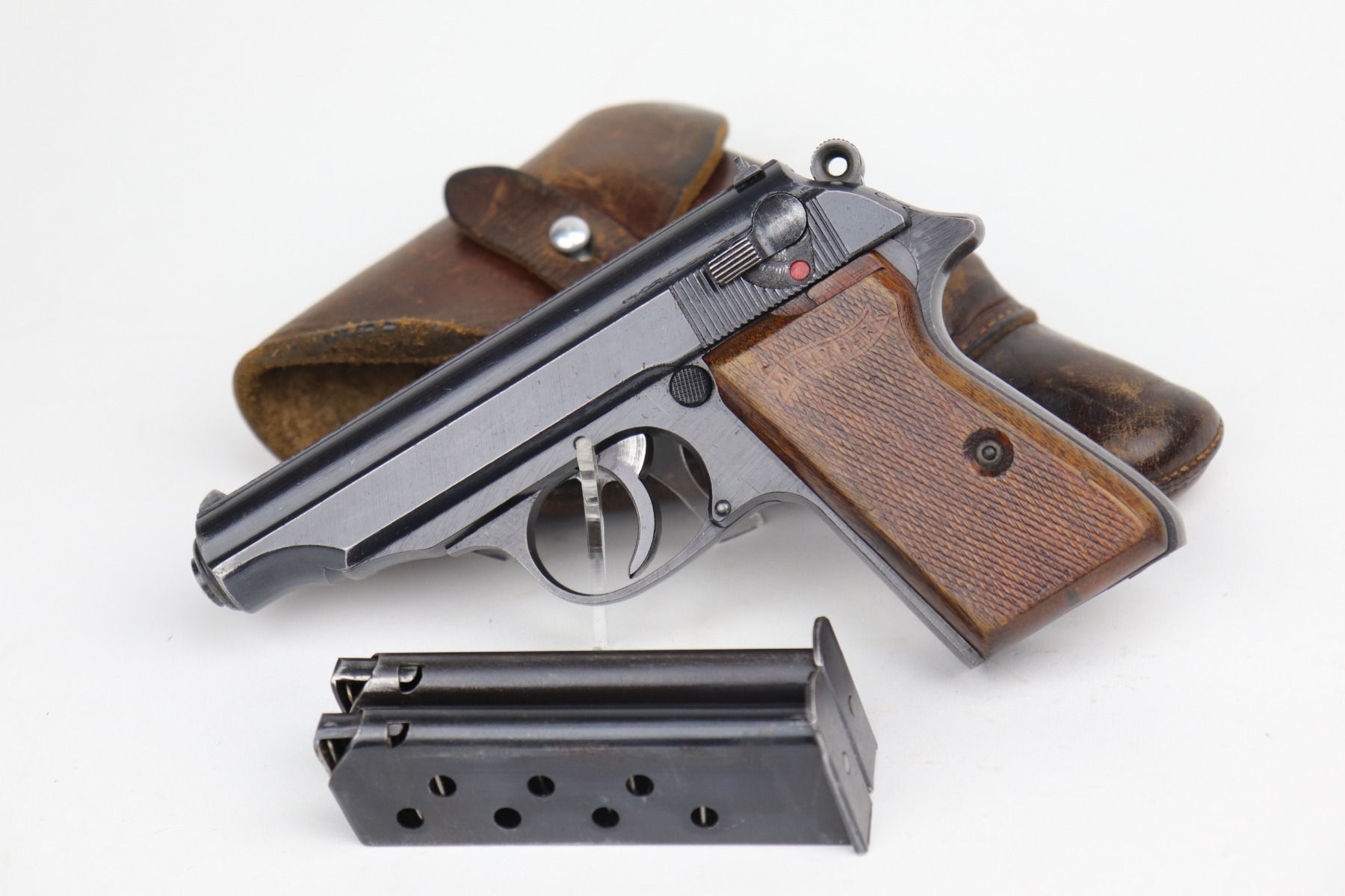 12/22/20 – This is a very nice example of an end-of-war, GI-assembled PP rig. This is a known and documented variation where the slide and frame are mismatched, no slide legend, and were assembled by GI’s at the end of the war. This particular gun is in the correct serial range for this variation. The rig comes with two correct magazines and a nice Akah-marked holster. The gun has retained about 92-93% of its original finish. There is thinning and patina on the straps. Very light wear around the muzzle and a few spots of wear along the right side of the slide. Very light scratch on the left side of the frame. It has late-war wooden Walther grips. The bore is excellent – shiny with strong rifling.