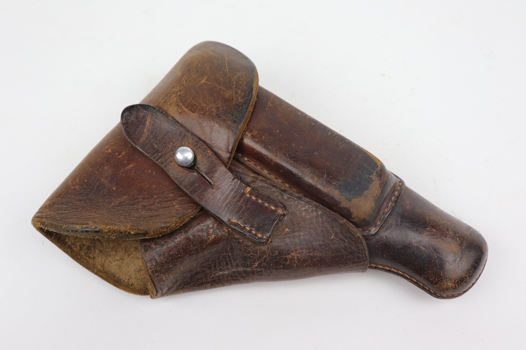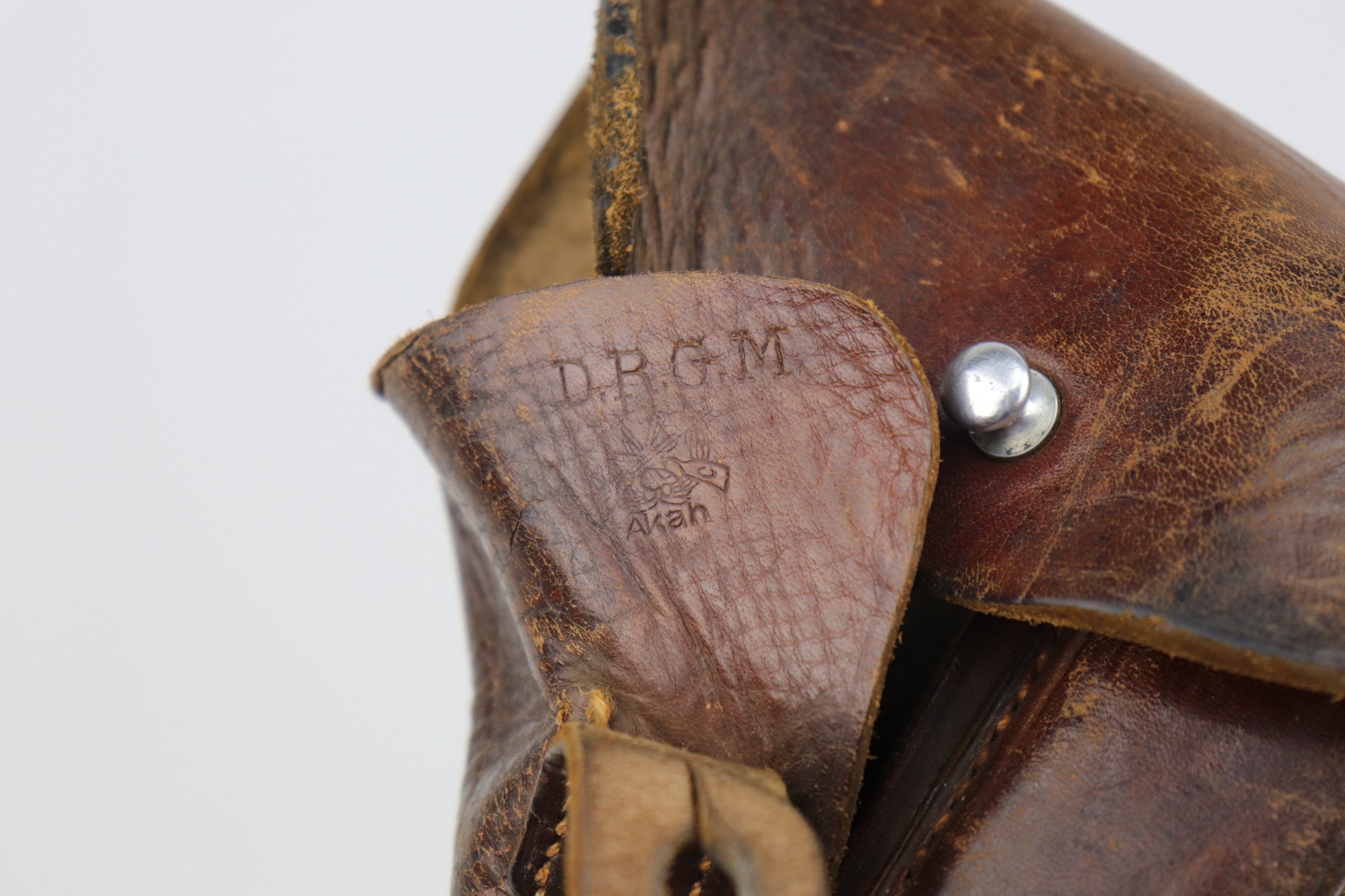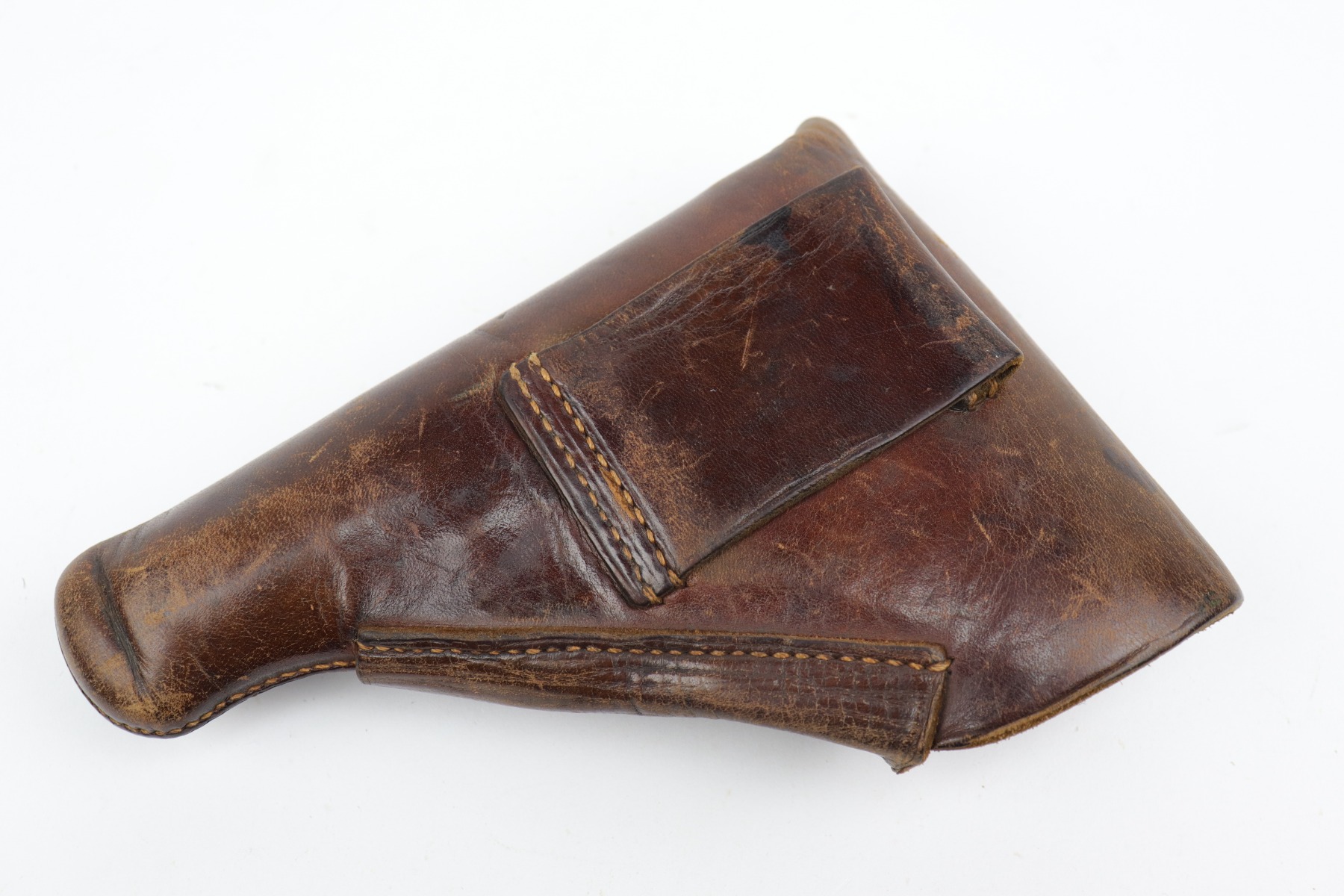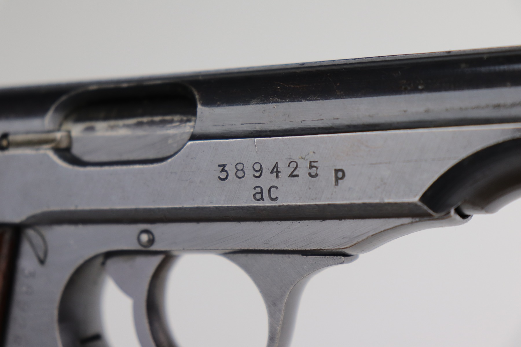 12/22/20 – This is a very nice example of an end-of-war, GI-assembled PP rig. This is a known and documented variation where the slide and frame are mismatched, no slide legend, and were assembled by GI’s at the end of the war. This particular gun is in the correct serial range for this variation. The rig comes with two correct magazines and a nice Akah-marked holster. The gun has retained about 92-93% of its original finish. There is thinning and patina on the straps. Very light wear around the muzzle and a few spots of wear along the right side of the slide. Very light scratch on the left side of the frame. It has late-war wooden Walther grips. The bore is excellent – shiny with strong rifling.