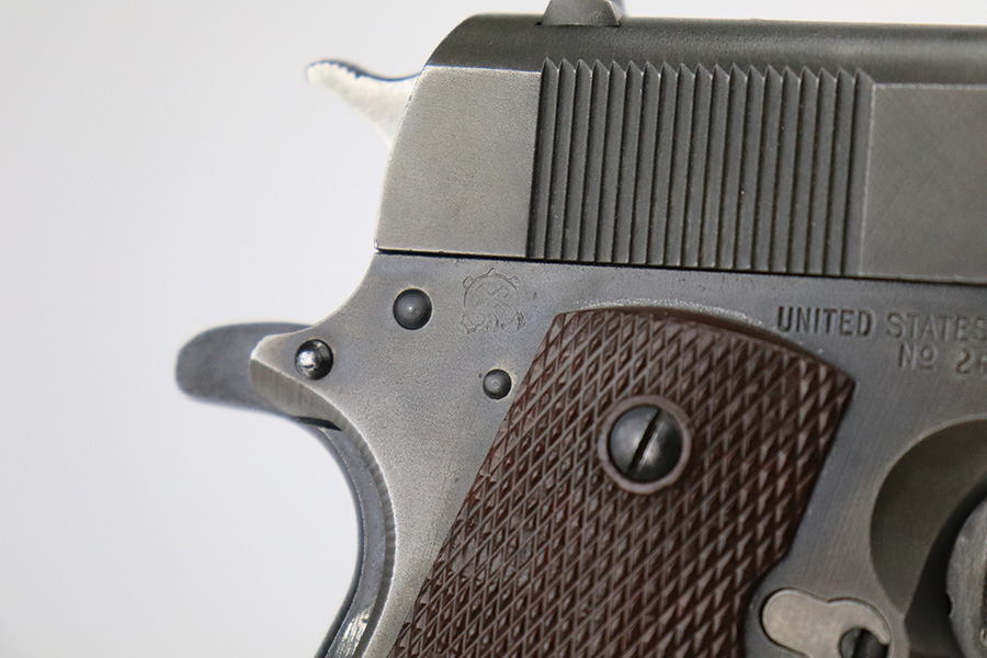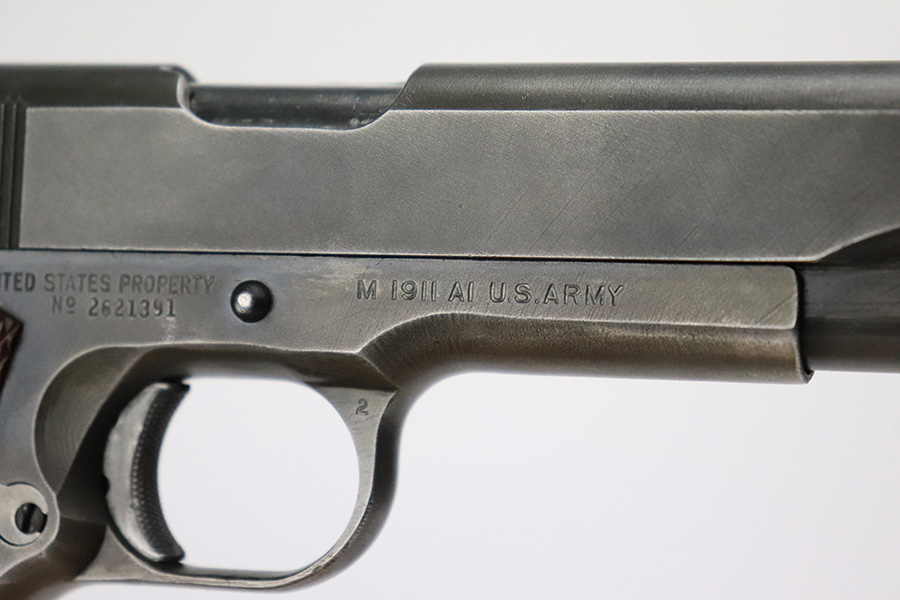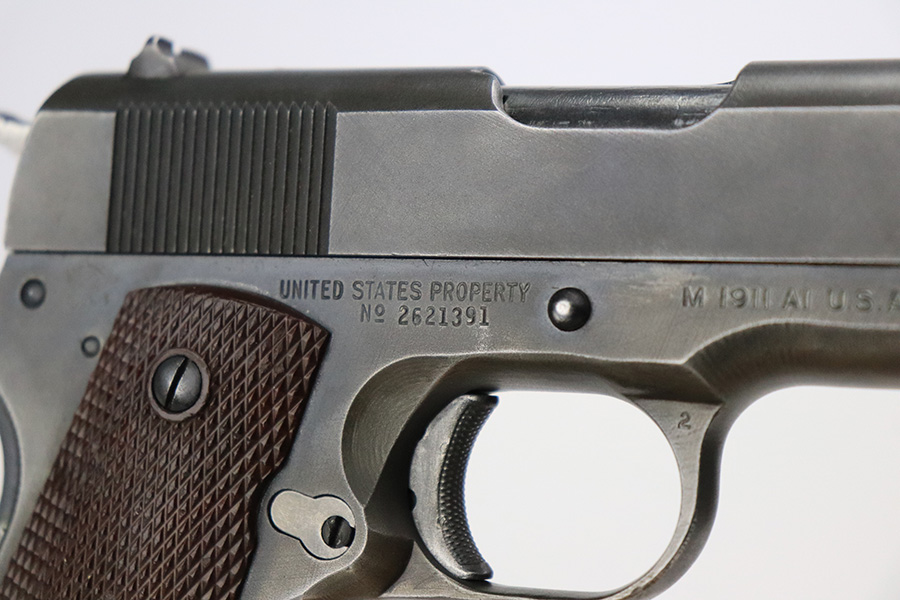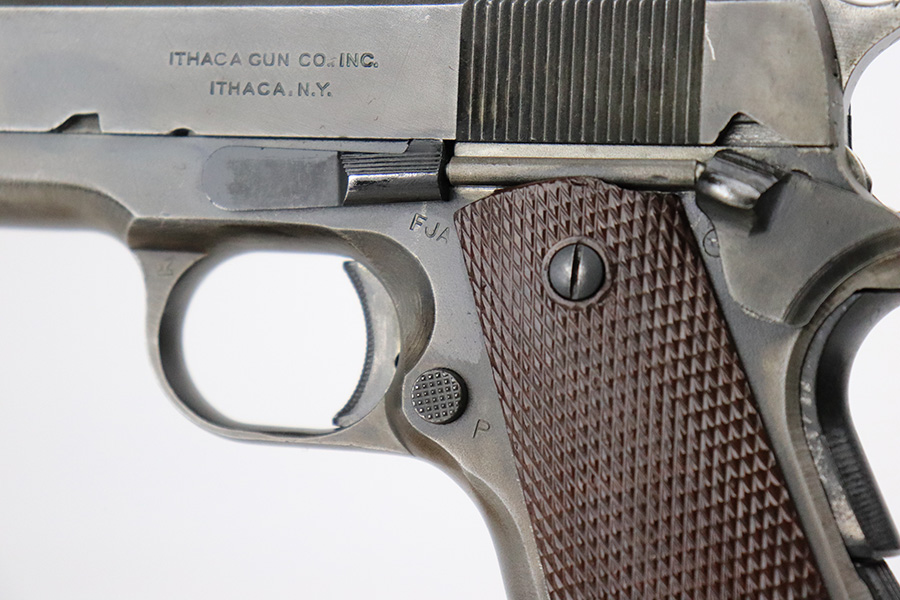 7/17/22 – This is a very nice example of a late-war Ithaca Model 1911A1 issued to the US military toward the end of the war, in 1945. It is “United States Property” marked, has a cross-canon military cartouche on the right side of the frame, and has the proper “FJA” inspector initials. Also has a proper Flannery barrel. Overall, the gun has retained about 80% of its original finish. There is general thinning throughout, but the finish loss is most noticeable on the front strap. Minor wear on some of the high edges and some minor discoloration on both sides of the slide. Comes with very nice period-correct plastic grips and an “S” marked magazine. Excellent bore with strong rifling.