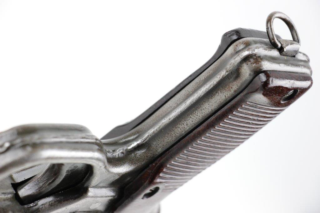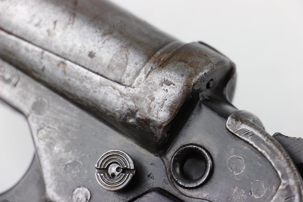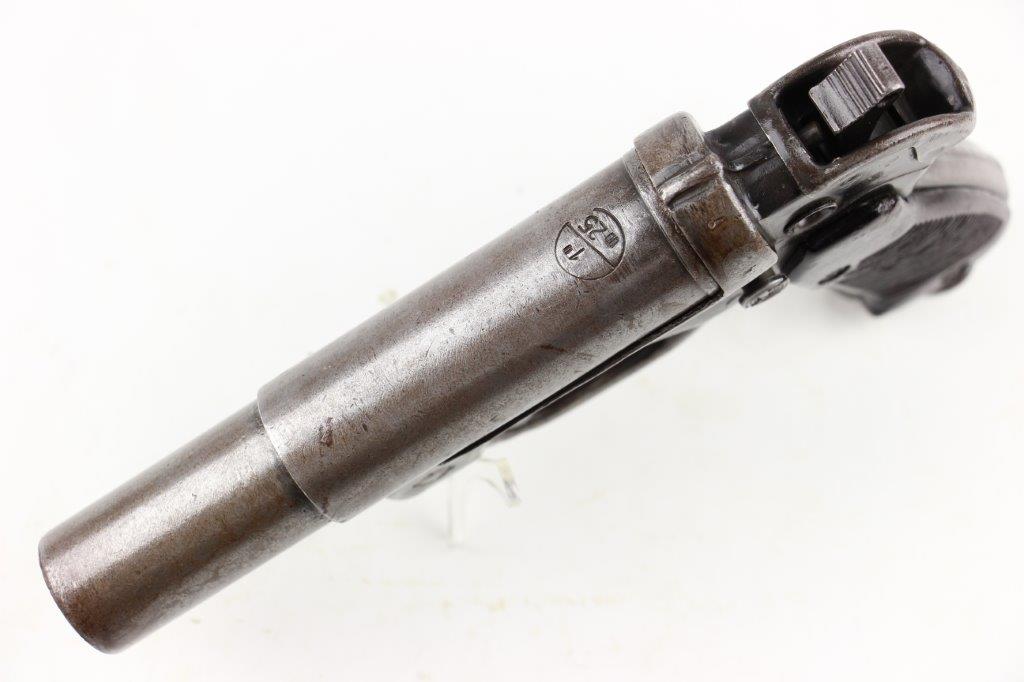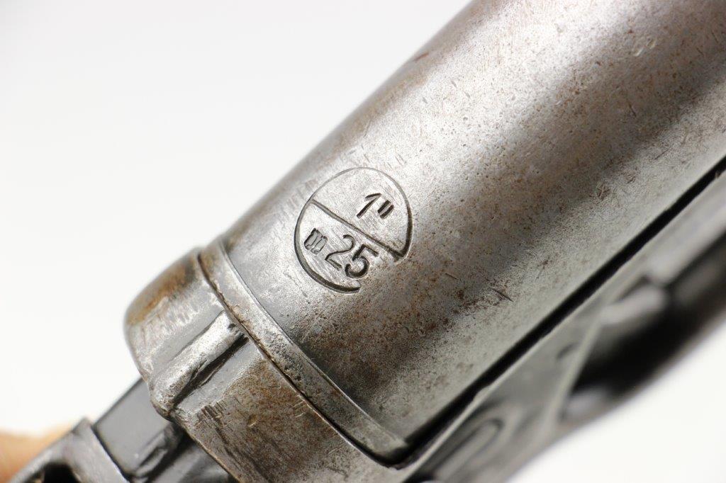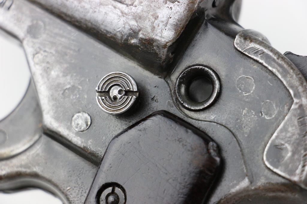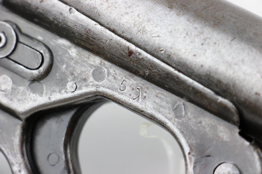 6/19/24 – This is an original, late WW2 production German LP42 Flare Pistol. The flare pistol has rough machining and is a classic late-war example. The finish is mostly missing throughout the barrel and side profiles of the frame. Overall around 35% of the bluing is intact, but these later wartime production pieces are known for thin finishes. The flare pistol is mechanically sound with no issues. The grips are original and in great condition with mild handling wear. Worth noting; one of the grip panels is black while the other is a dark reddish-brown (likely left the factory this way, again a late-war production indicator). The barrel and frame are matching numbered. The bore has light patina but is in good overall condition. Comes with a reproduction leather holster.