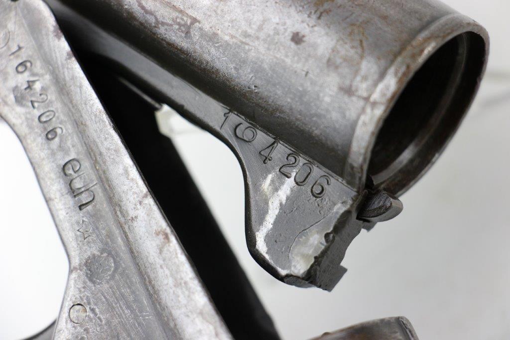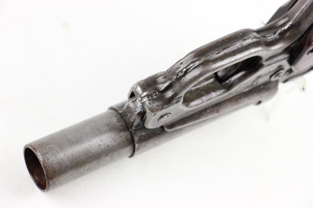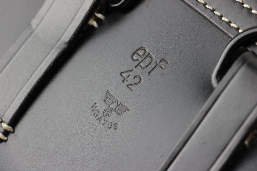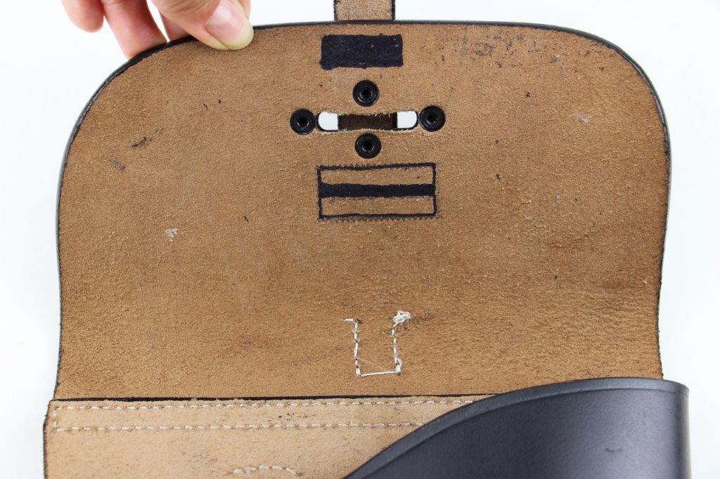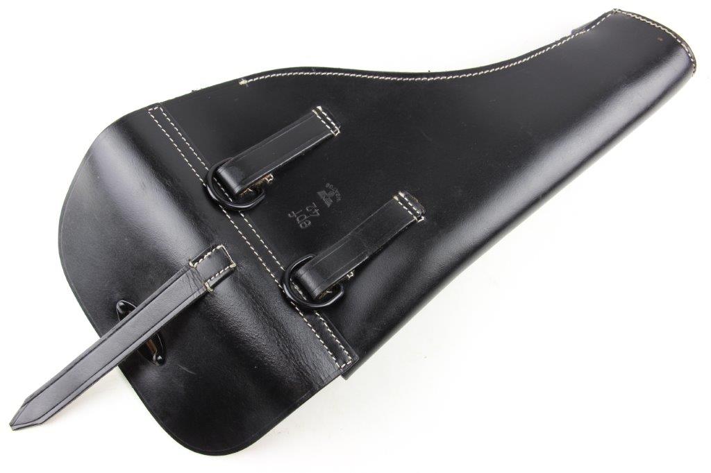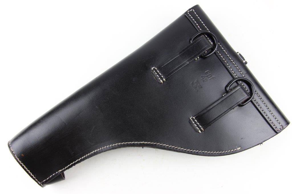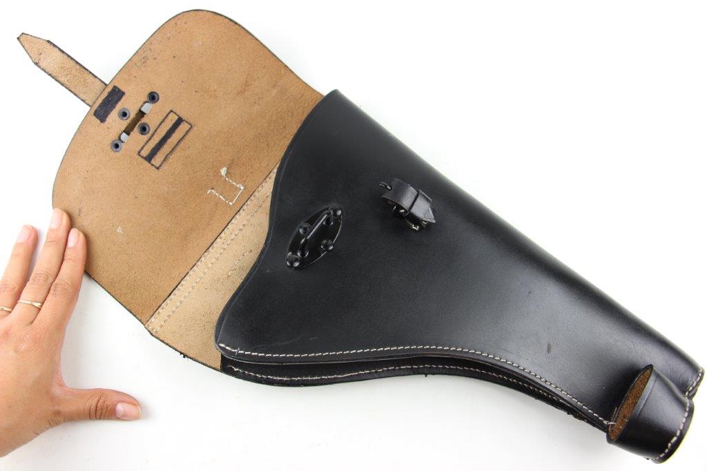 6/19/24 – This is an original, late WW2 production German LP42 Flare Pistol. The flare pistol has rough machining and is a classic late-war example. The finish is mostly missing throughout the barrel and side profiles of the frame. Overall around 35% of the bluing is intact, but these later wartime production pieces are known for thin finishes. The flare pistol is mechanically sound with no issues. The grips are original and in great condition with mild handling wear. Worth noting; one of the grip panels is black while the other is a dark reddish-brown (likely left the factory this way, again a late-war production indicator). The barrel and frame are matching numbered. The bore has light patina but is in good overall condition. Comes with a reproduction leather holster.