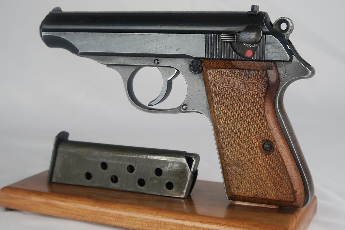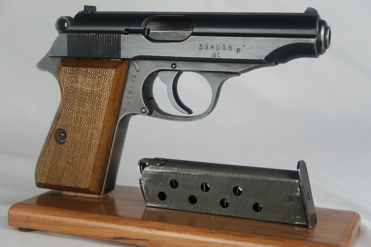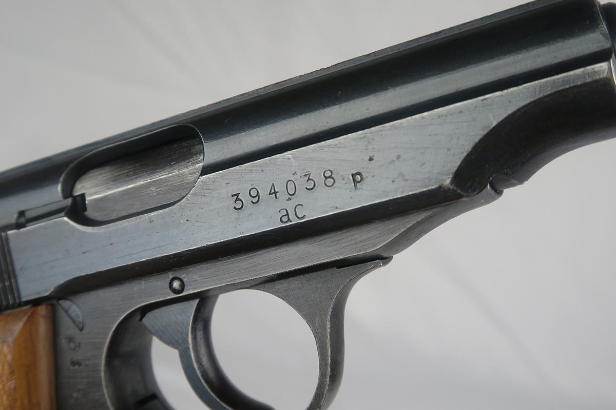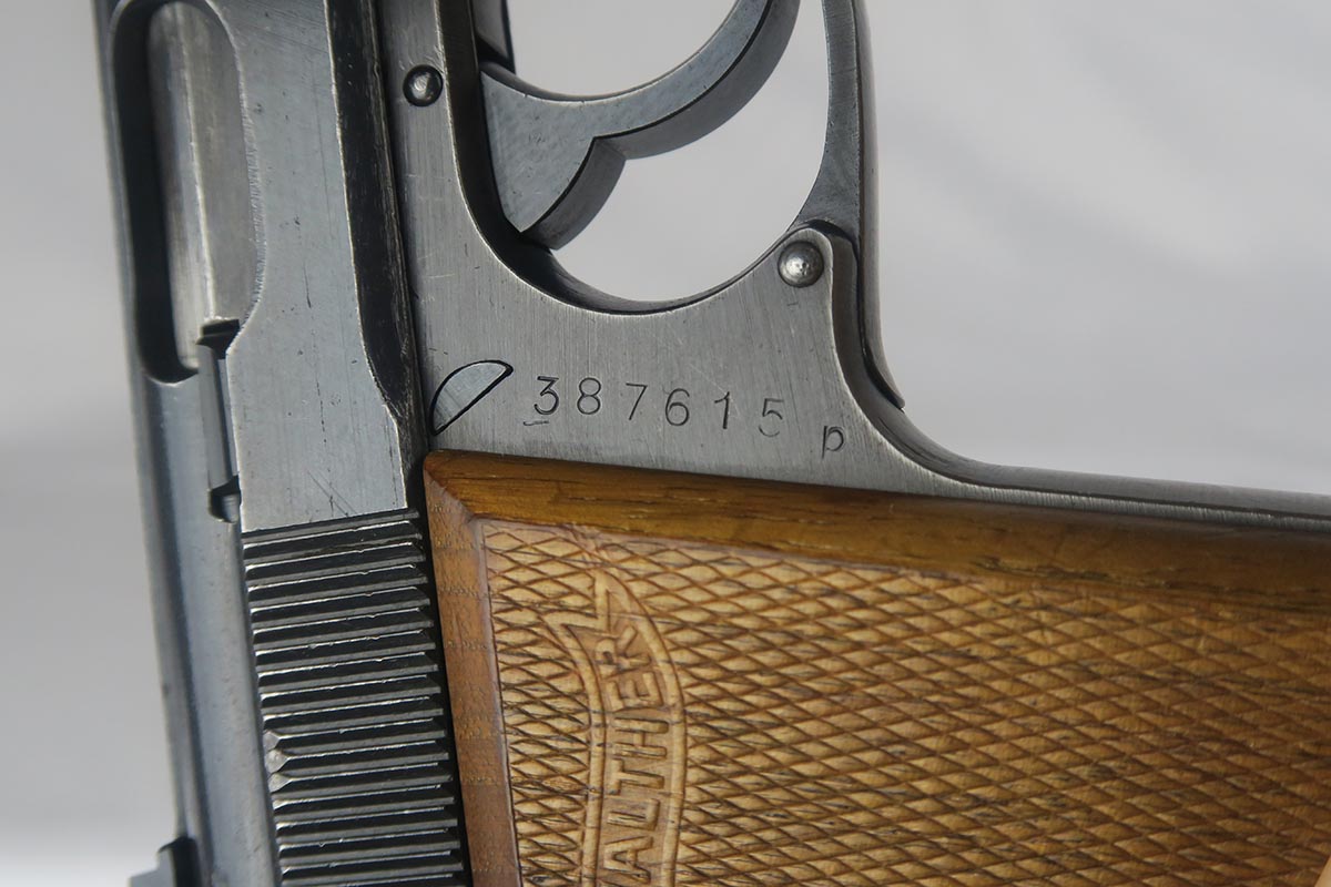 9/15/17 – This is a known and documented late-war Walther PP variation from 1945.  At the end of the war, corners were being cut to get firearms produced so pistols were put together from whatever parts were immediately available.  This led to mismatched pistols such as the one listed here, with ac on slide but no acceptance proofs on the slide or frame, and no slide legend on the right side of the pistol.  The finish is all original and rates at about 90%.  The slide is pretty nice but the front strap is thin.  Proper late-war wood grips and scarce ‘w’ marked magazine.  Excellent bore.