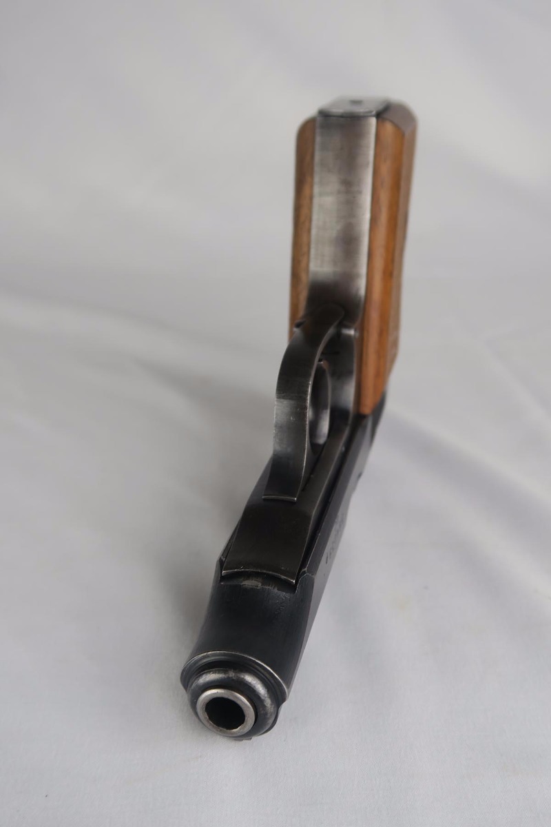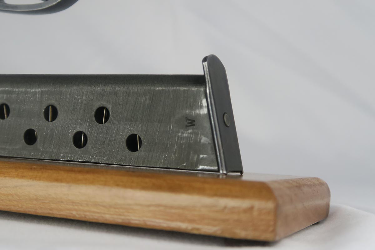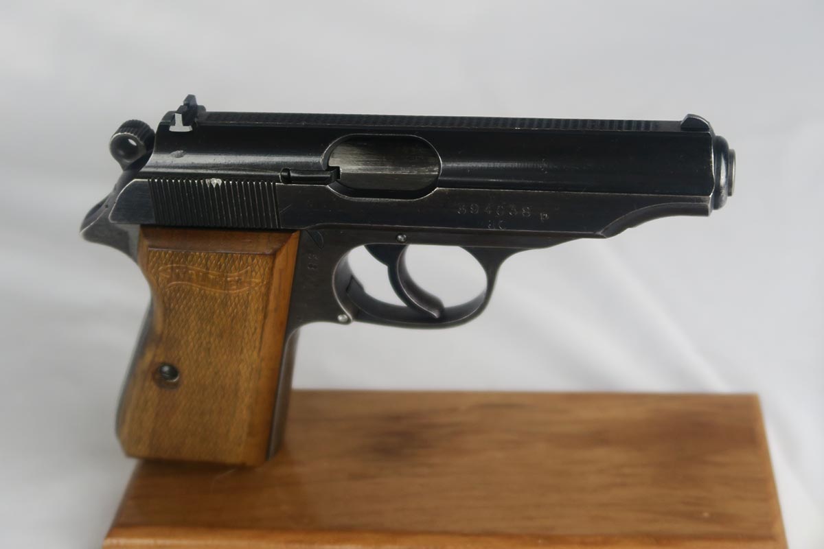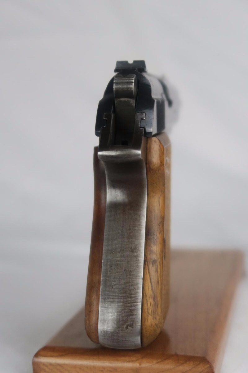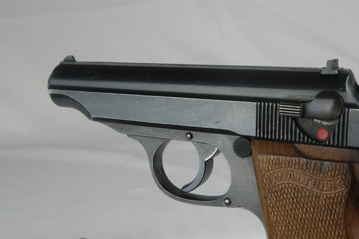 9/15/17 – This is a known and documented late-war Walther PP variation from 1945.  At the end of the war, corners were being cut to get firearms produced so pistols were put together from whatever parts were immediately available.  This led to mismatched pistols such as the one listed here, with ac on slide but no acceptance proofs on the slide or frame, and no slide legend on the right side of the pistol.  The finish is all original and rates at about 90%.  The slide is pretty nice but the front strap is thin.  Proper late-war wood grips and scarce ‘w’ marked magazine.  Excellent bore.