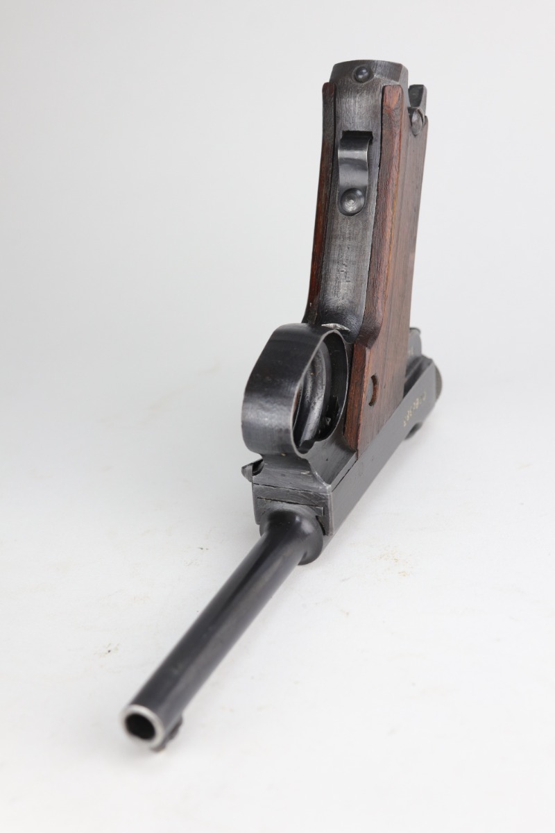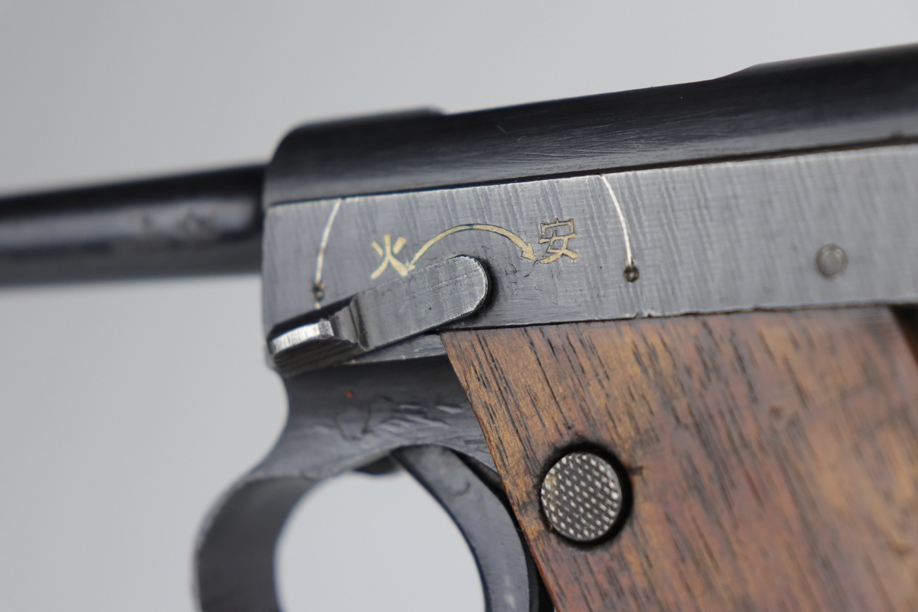 7/7/22 – This is an excellent example of a Nambu Type 14 issued to the Japanese military toward the end of the war, in February of 1945. It is all matching and comes with an original matching-numbered magazine. The gun has retained about 96% of its original finish. There is just some very minor thinning on the grip straps and a small area of minor pitting on the left side of the barrel. Comes with a set of matching-numbered late-war slab-side grips. The bore is mint.