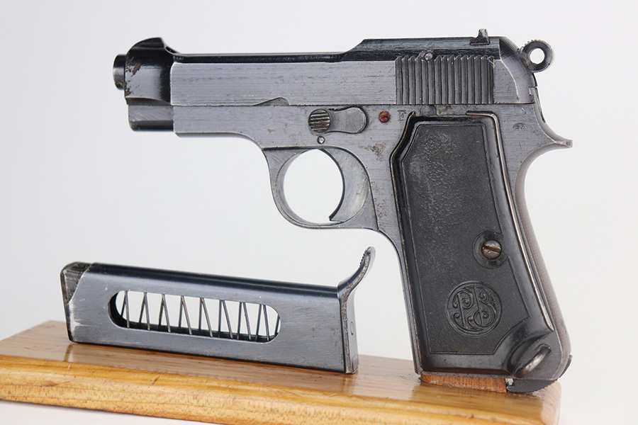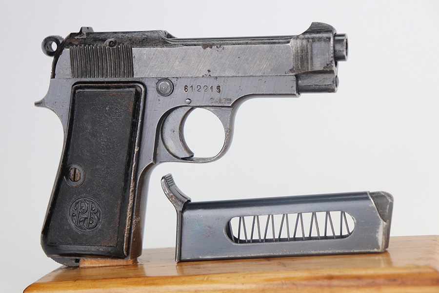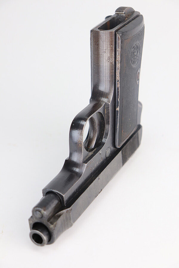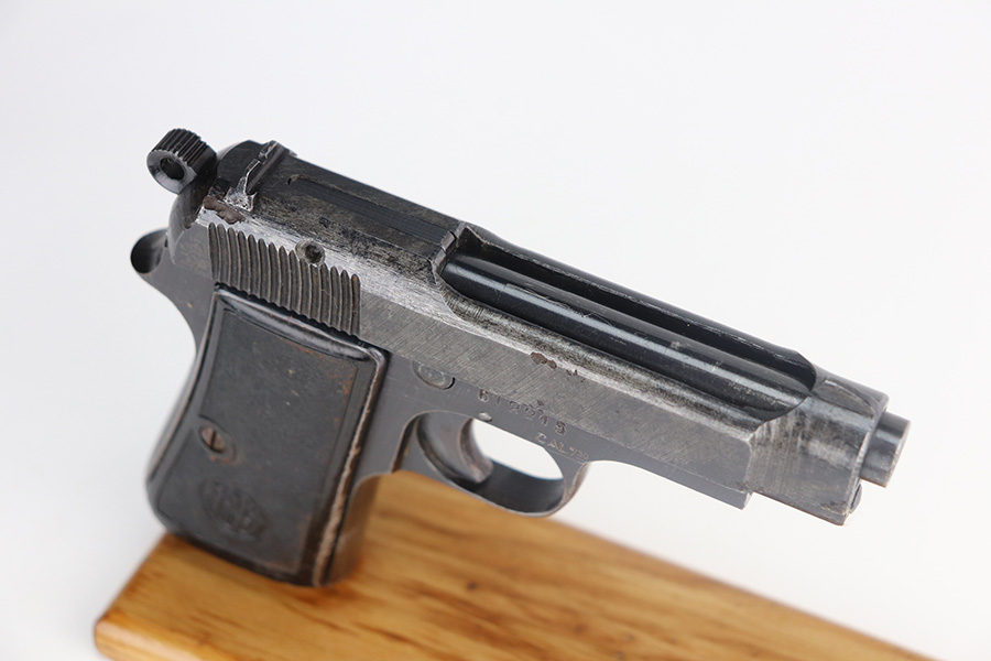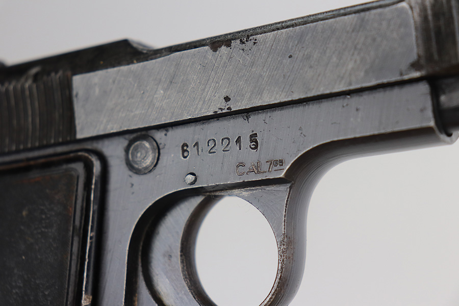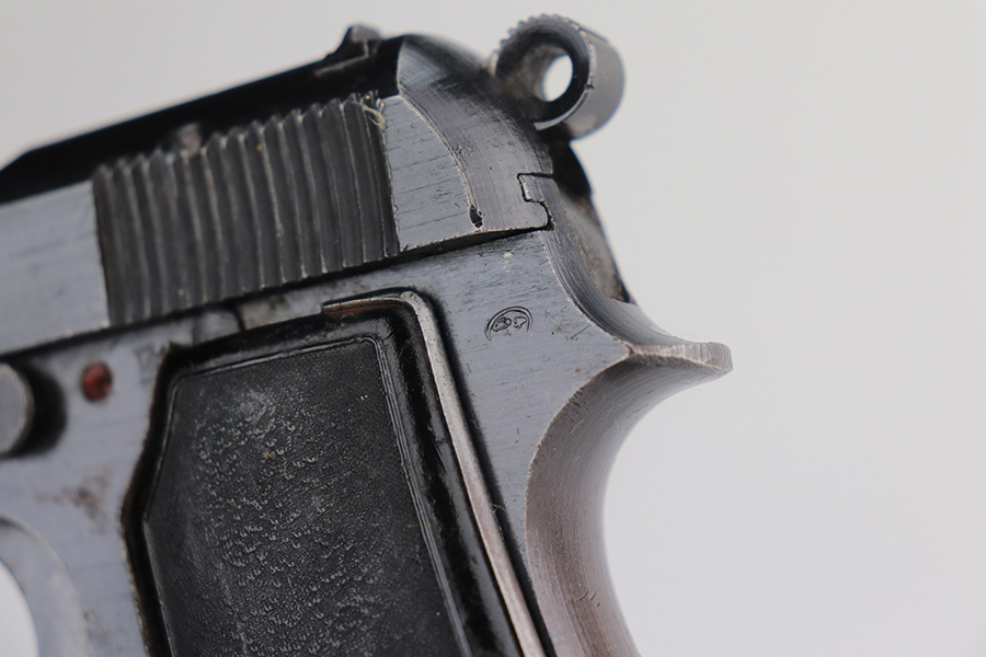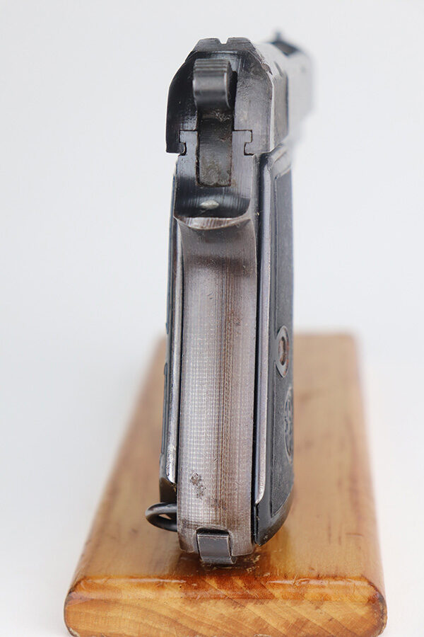 4/11/22 – This is a Beretta Model 1935 that was issued to the Nazi military near the end of WW2. The gun is matching but has no slide legend. It also has a “4UT” proof on the tang and “Cal 7.65” on the right side of the frame. It has retained roughly 65% of its original rough late-war finish. There is thinning on both straps and splotchy wear and discoloration on the whole right side of the slide. There are also areas of significant pitting around the muzzle, right side of the slide and frame, the straps, and on the magazine bottom. Patina on the straps. The grips are nice with pitting along the edges. Comes with a proper magazine. The bore is very nice and has strong rifling.