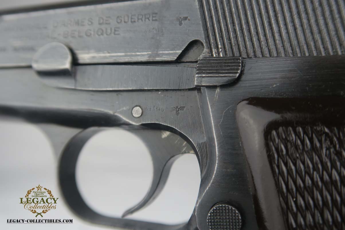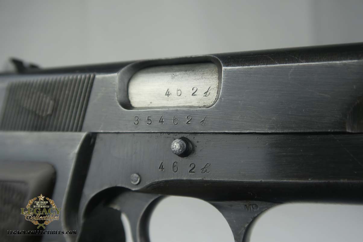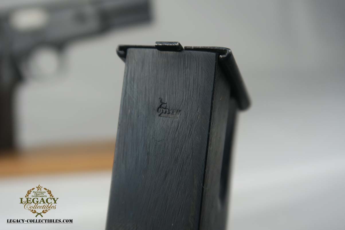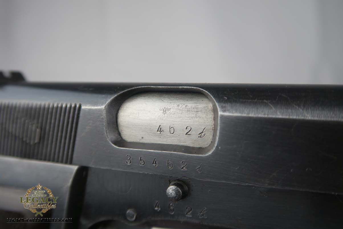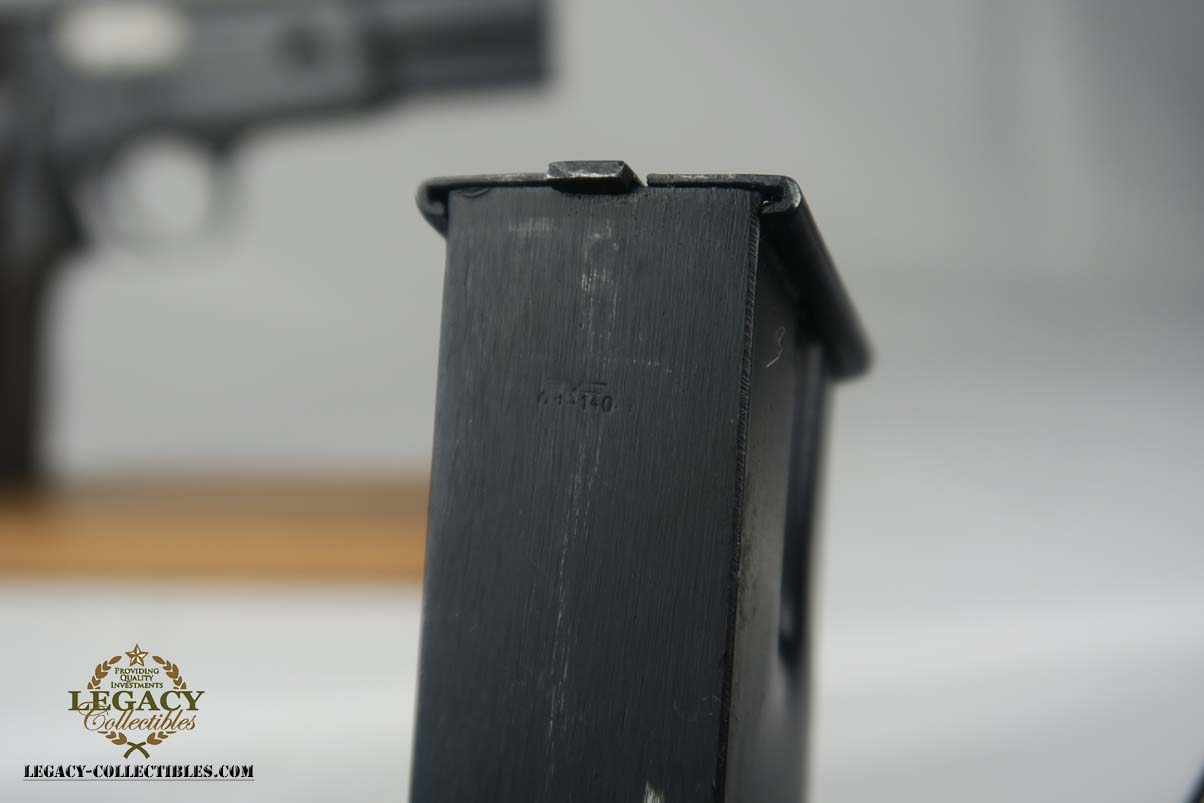 4/18/17 – This is a late-war Browning High Power rig, that is proofed for the German army and includes a holster and spare magazine. The dull military finish retains about 93-94% of its original finish, with some wear along the top of the left side of the slde (closer to the rear sight), and thinning on the straps. Serial dates to this pistol to around 1944. Included are two magazines that are both WaA140 proofed to match the proofs found on the pistol. The pistol also comes with a 1944 dated high power holster that is maker-marked and WaA866 proofed. The holster is in very good condition with no major issues, and strong leather. The pistol grips are correct, but the left panel does show a minor crack in it. Bore is excellent, shiny with strong rifling.