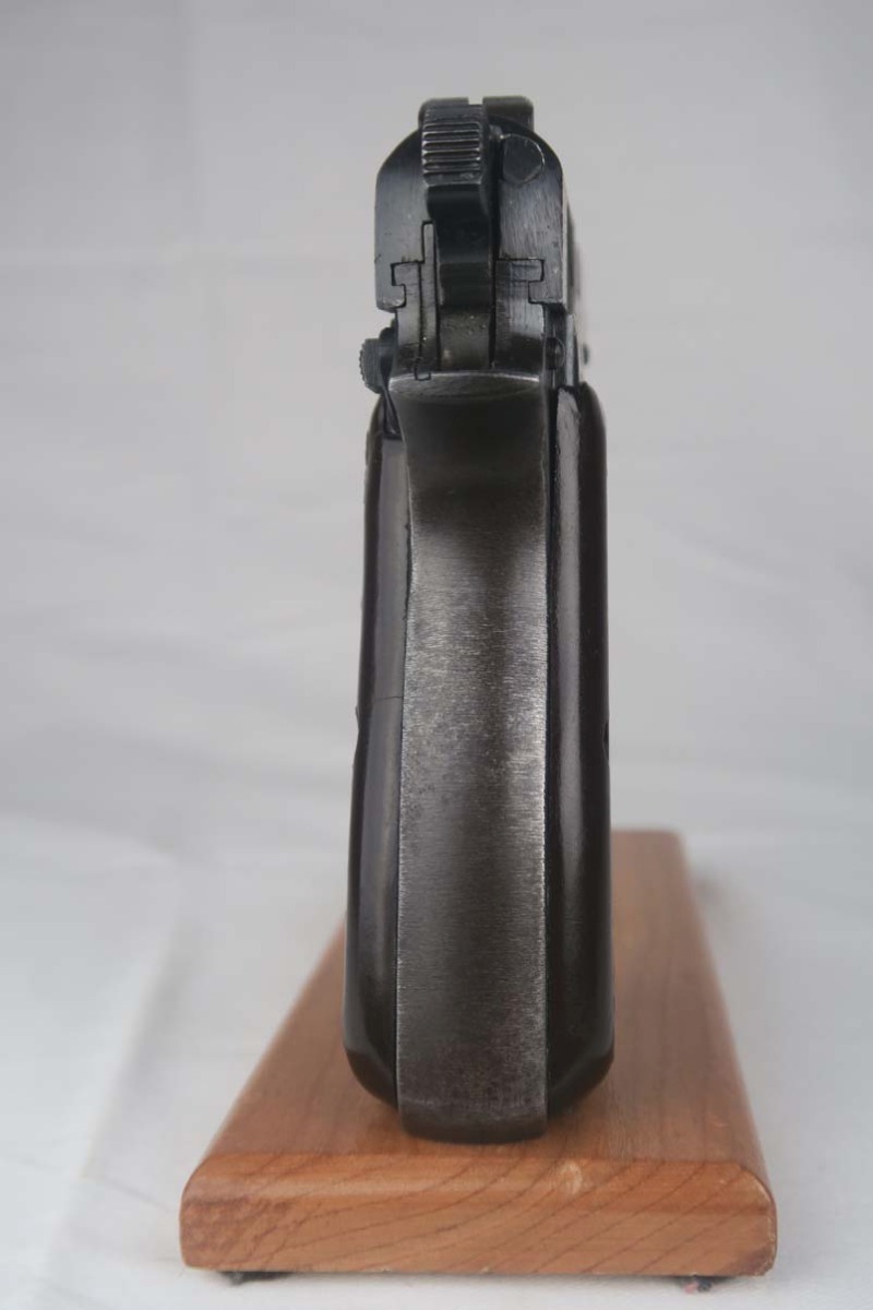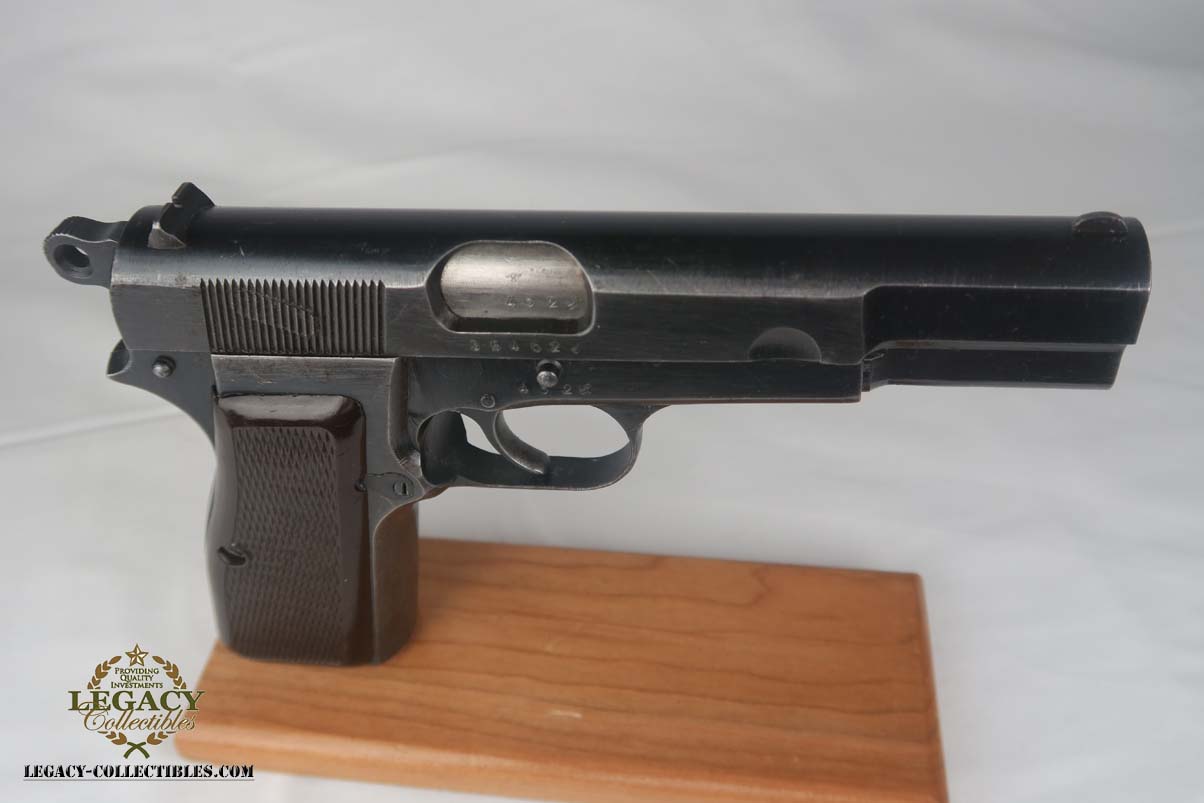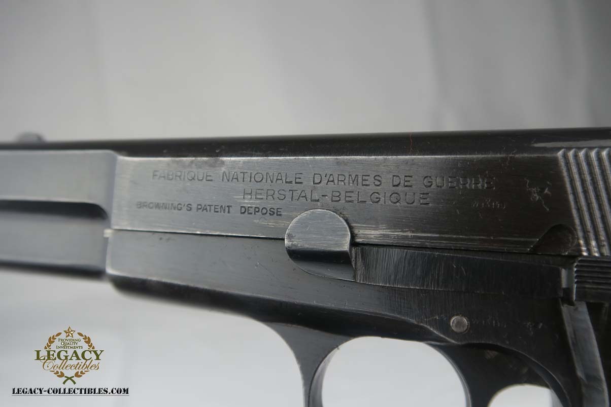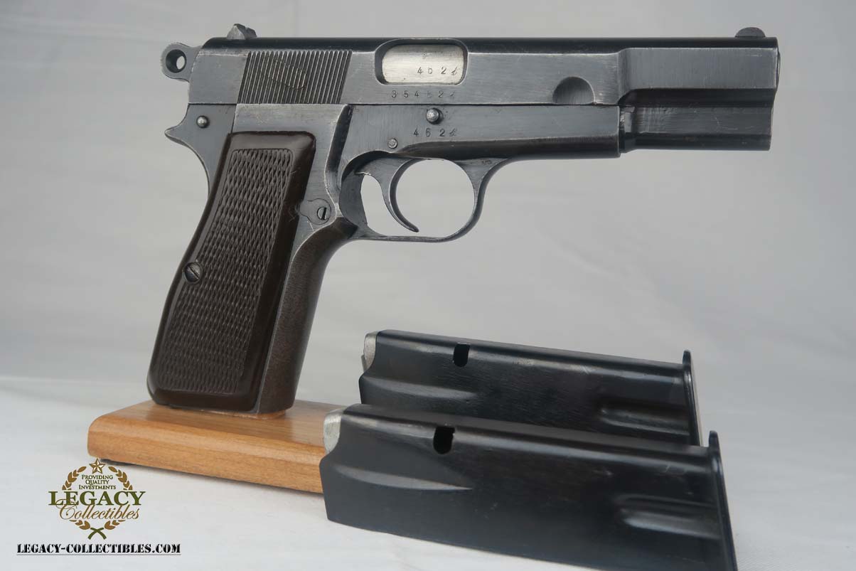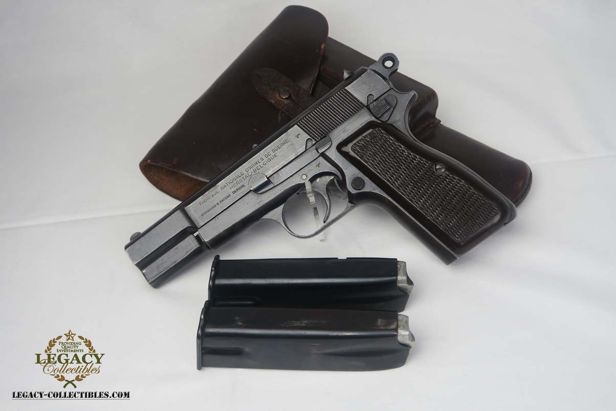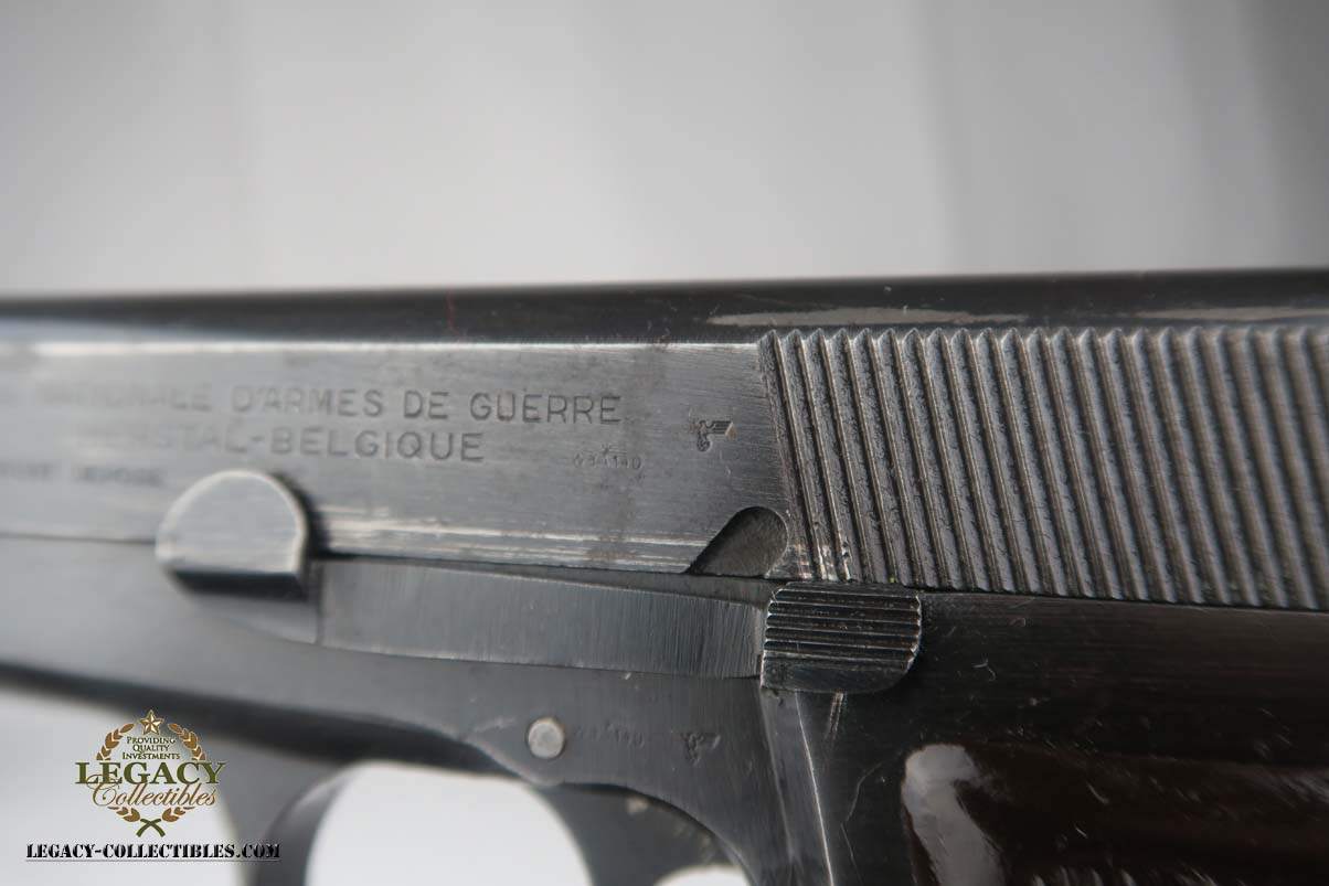 4/18/17 – This is a late-war Browning High Power rig, that is proofed for the German army and includes a holster and spare magazine. The dull military finish retains about 93-94% of its original finish, with some wear along the top of the left side of the slde (closer to the rear sight), and thinning on the straps. Serial dates to this pistol to around 1944. Included are two magazines that are both WaA140 proofed to match the proofs found on the pistol. The pistol also comes with a 1944 dated high power holster that is maker-marked and WaA866 proofed. The holster is in very good condition with no major issues, and strong leather. The pistol grips are correct, but the left panel does show a minor crack in it. Bore is excellent, shiny with strong rifling.