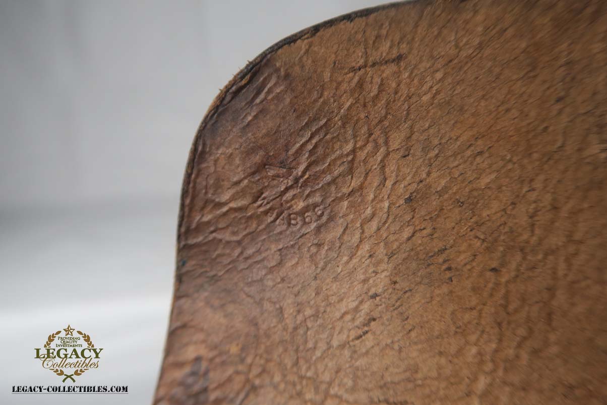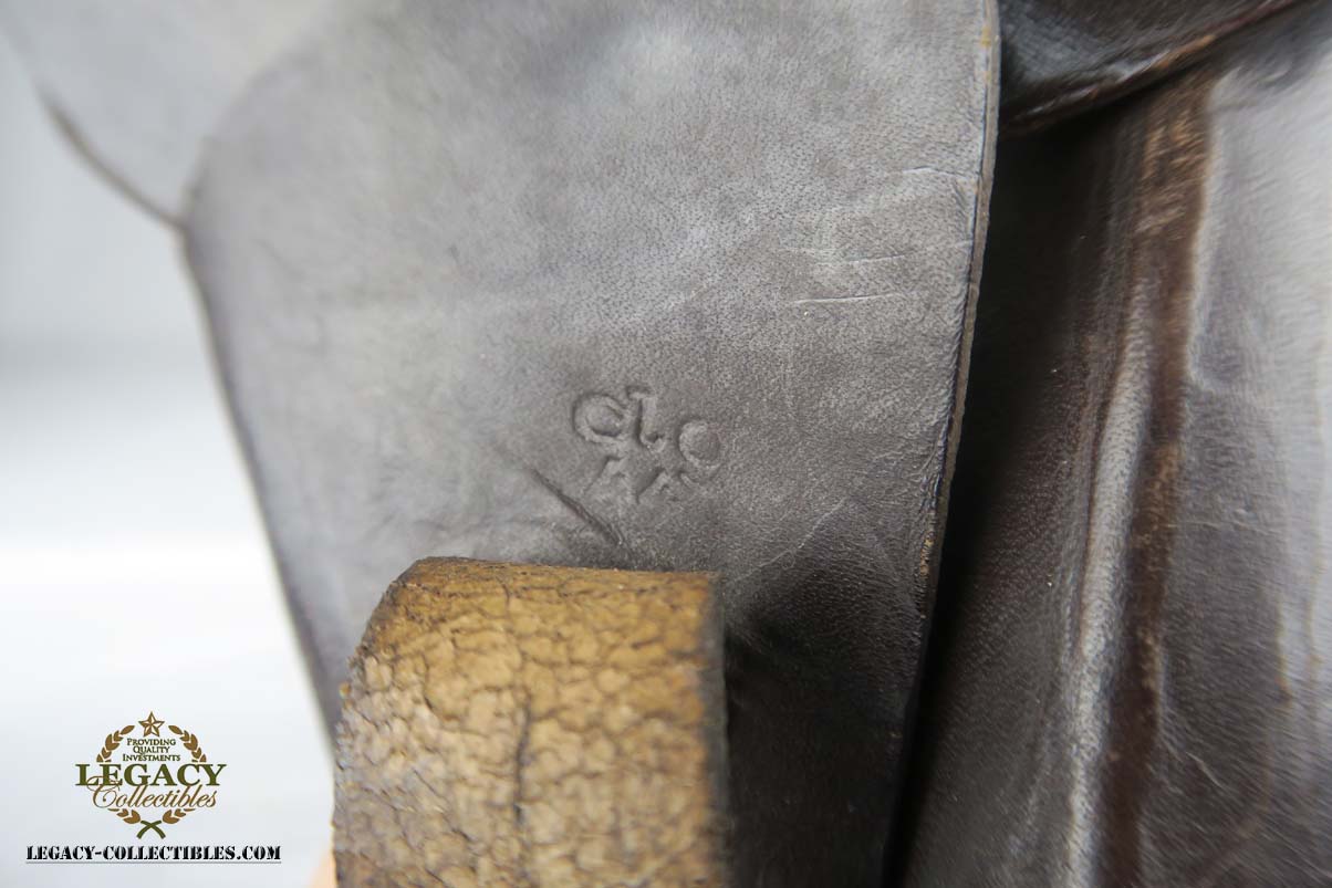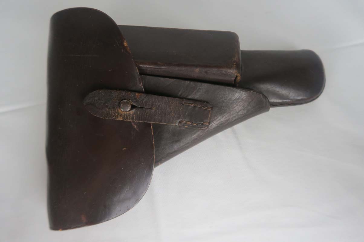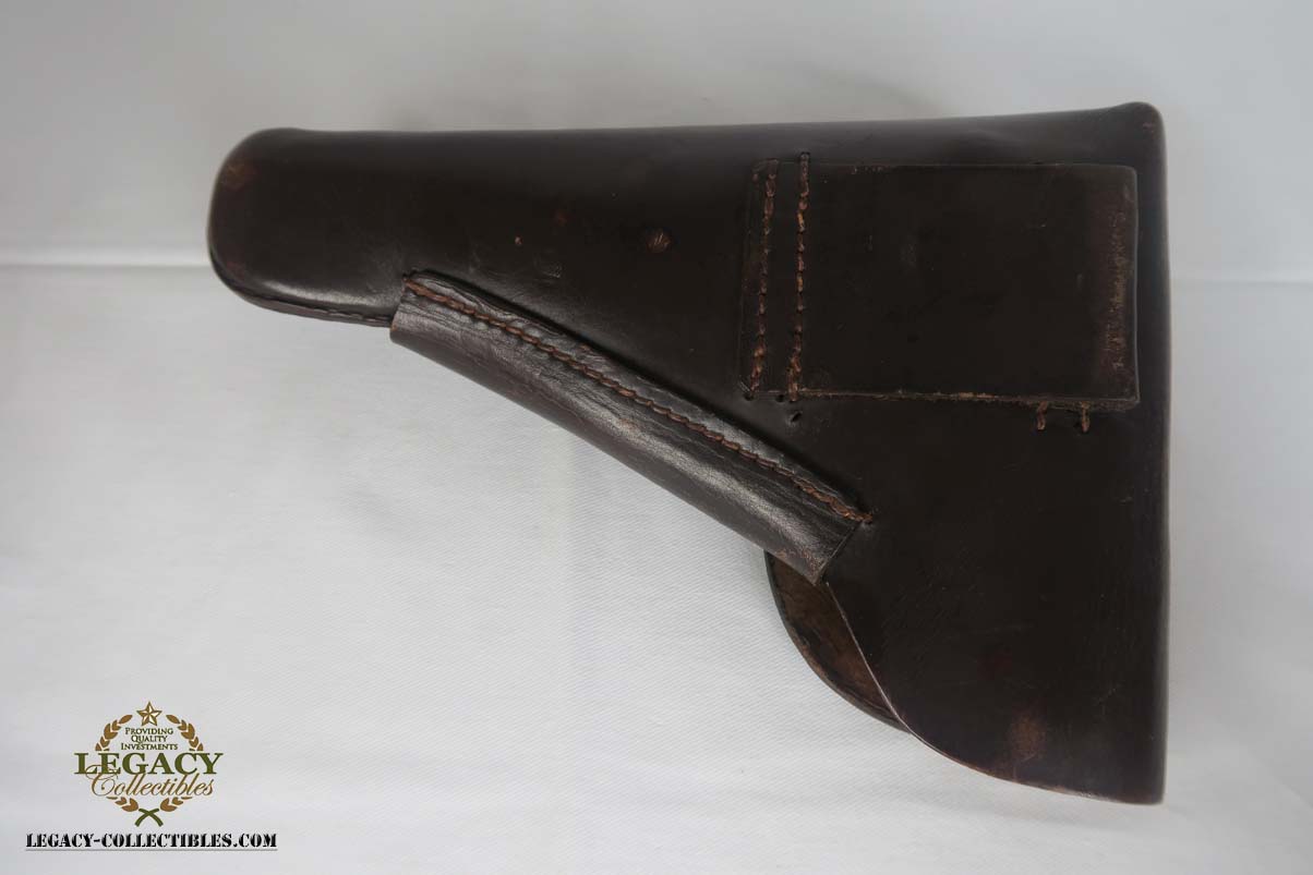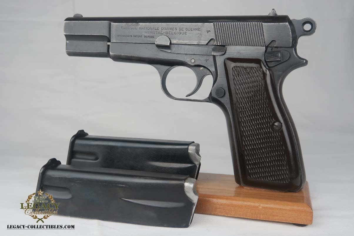 4/18/17 – This is a late-war Browning High Power rig, that is proofed for the German army and includes a holster and spare magazine. The dull military finish retains about 93-94% of its original finish, with some wear along the top of the left side of the slde (closer to the rear sight), and thinning on the straps. Serial dates to this pistol to around 1944. Included are two magazines that are both WaA140 proofed to match the proofs found on the pistol. The pistol also comes with a 1944 dated high power holster that is maker-marked and WaA866 proofed. The holster is in very good condition with no major issues, and strong leather. The pistol grips are correct, but the left panel does show a minor crack in it. Bore is excellent, shiny with strong rifling.