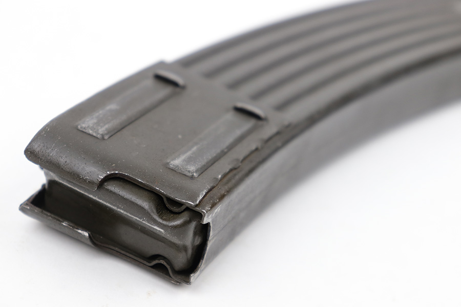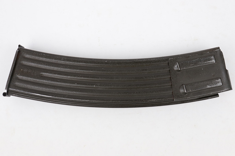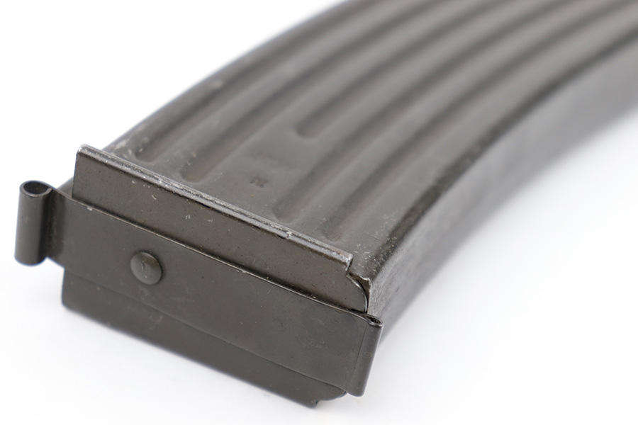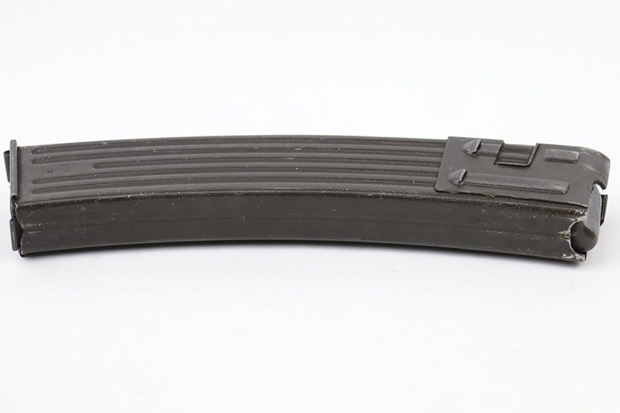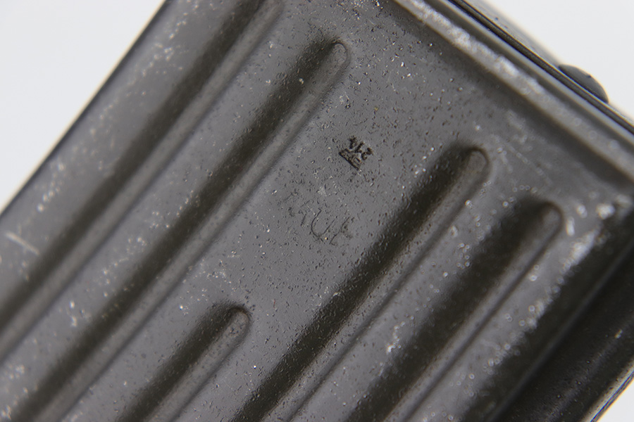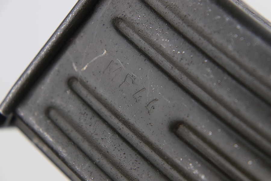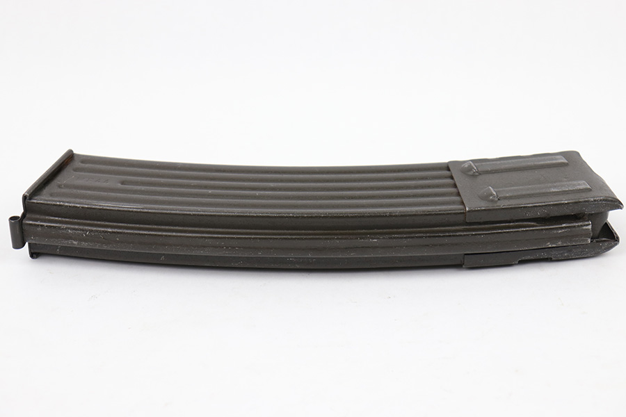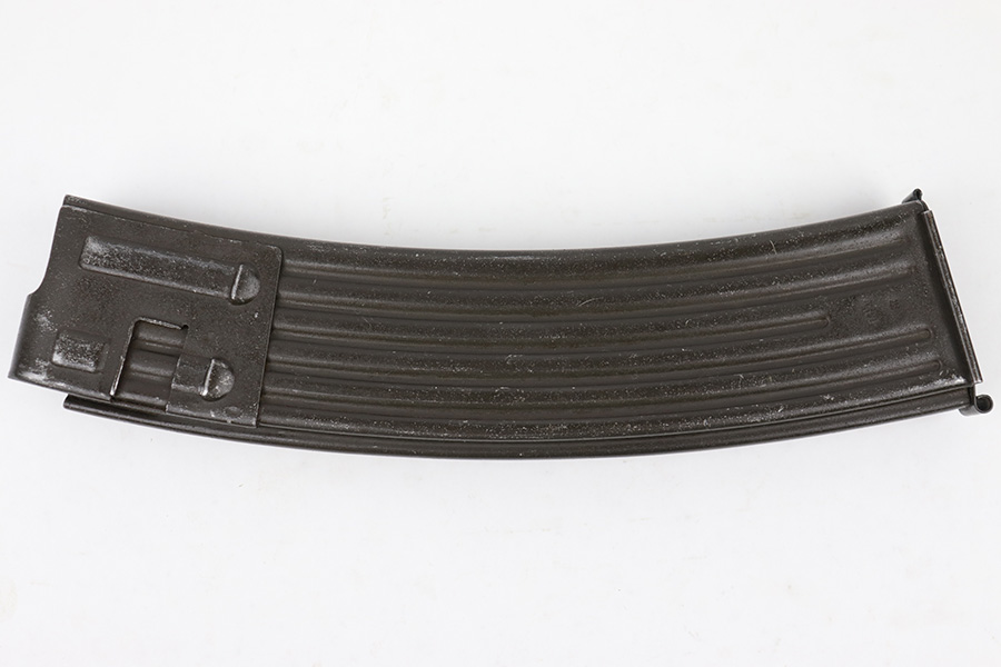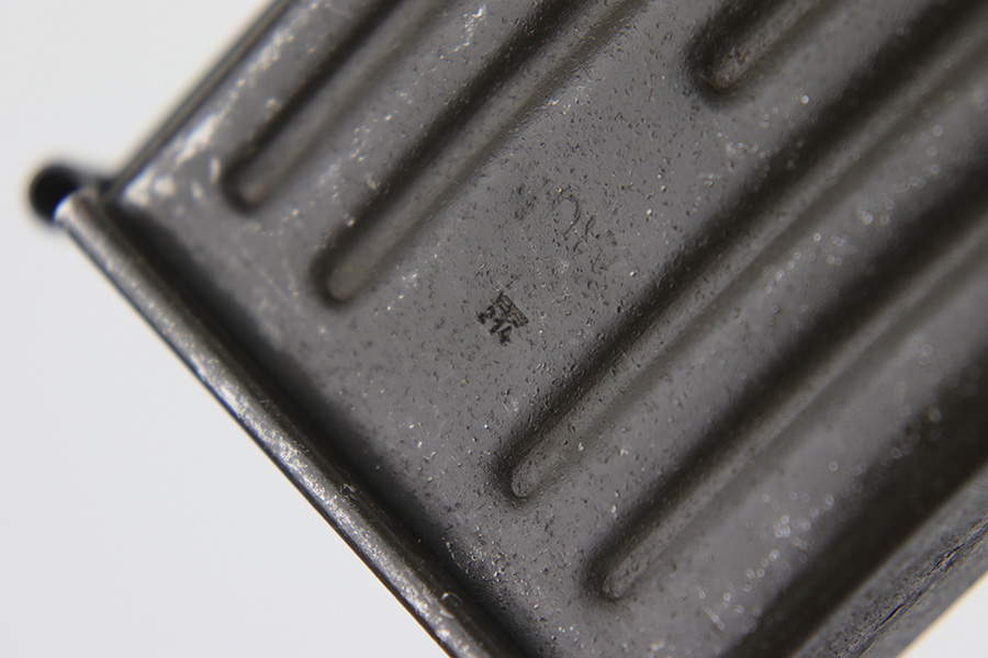 4/18/23 – This is an original, rare variation and late WW2 production MP44 magazine. The magazine has a phosphate finish and is in excellent overall condition with some mild surface wear but no dark discoloration, rust, or pitting. The left side of the magazine is stamped “MP 44” and the right side is maker code stamped “qnw” with a waffen military proof stamp underneath. The spring is strong and fully functional.