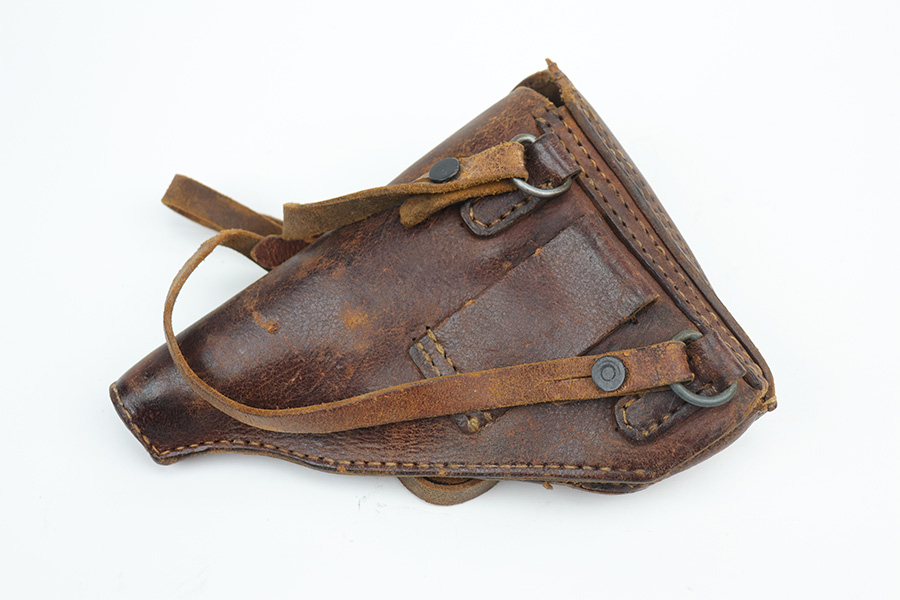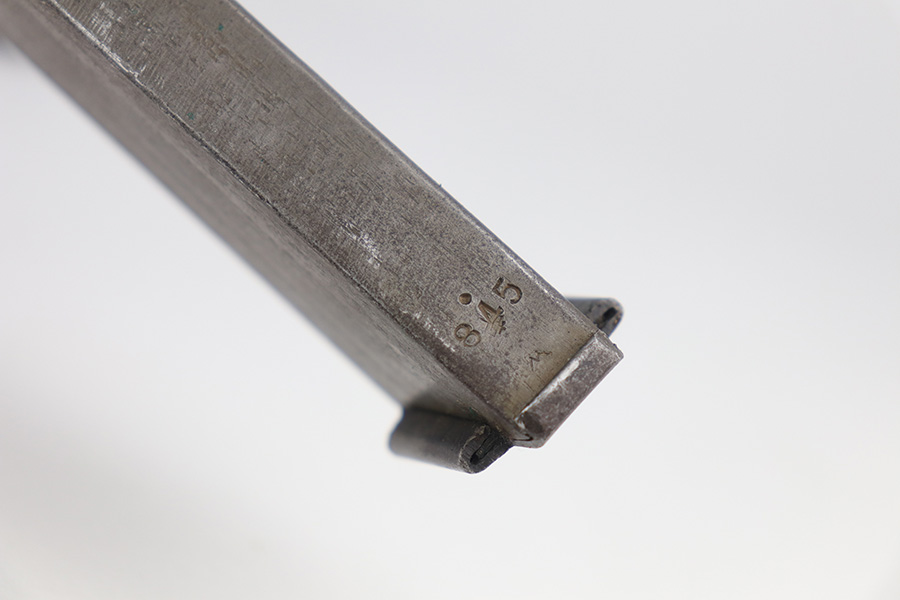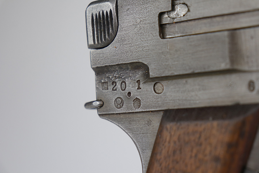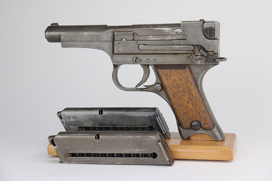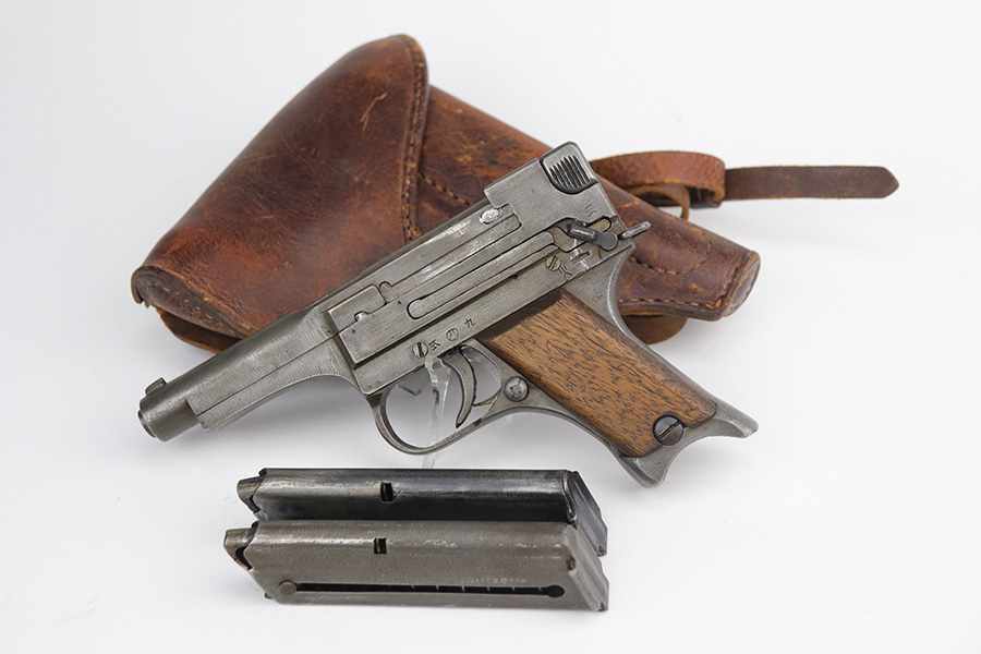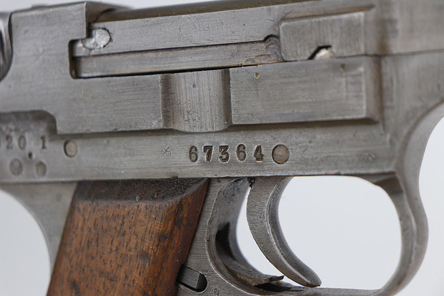 10/29/21 – This is an excellent example of a very late-war Nambu Type 94 issued to the Japanese military in January of 1945. The gun is all matching, was made in the Nagoya factory, and has an all-phosphate finish. It comes as a rig with one period-correct leather holster (with original shoulder strap) and two period-correct mismatched magazines (one is phosphate, the other is blued). These late-war phosphate finishes are difficult to rate, but we estimate it has retained about 96-97%. There is just very minor thinning on the straps and areas of minor discoloration here and there (typical). Comes with excellent late-war slab-side wood grips that are un-numbered. The bore is mint.