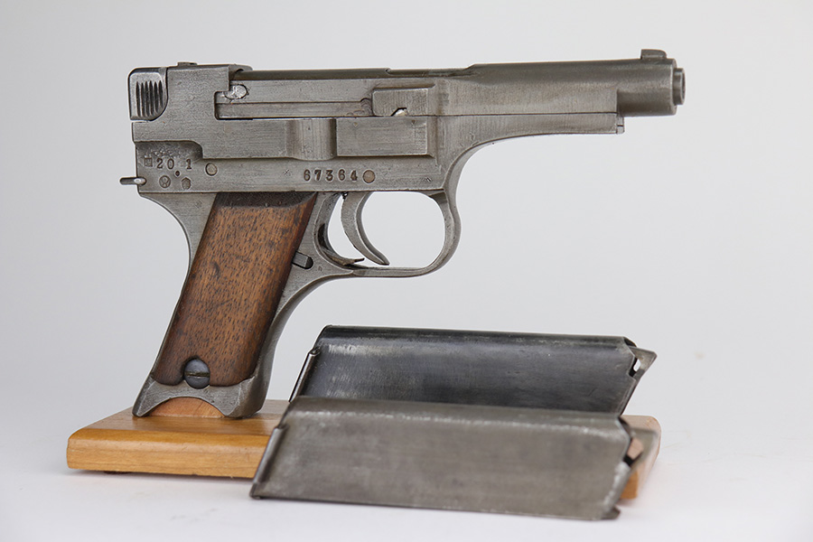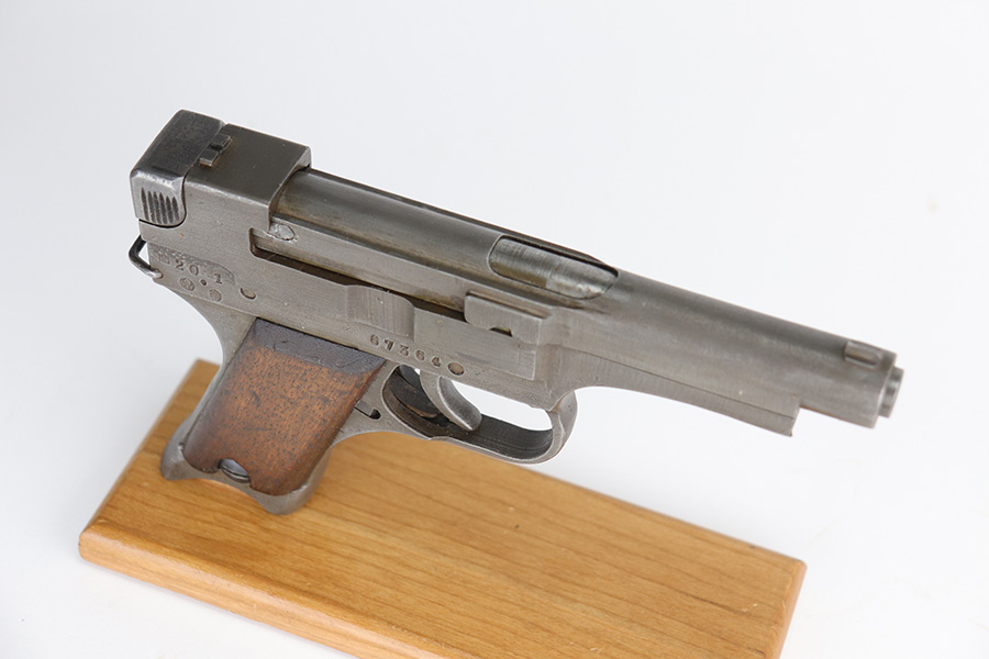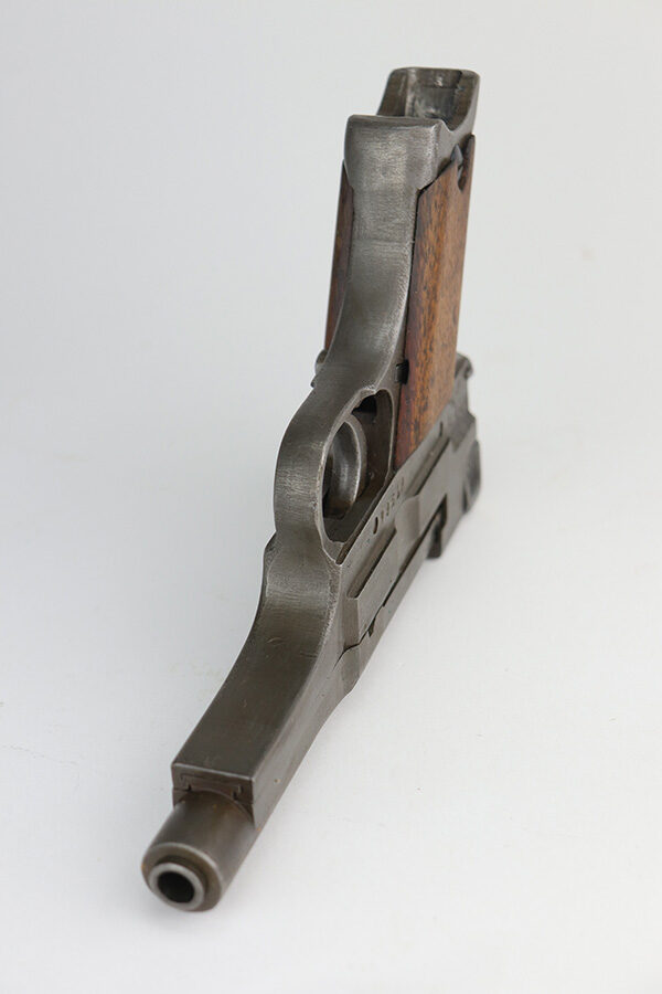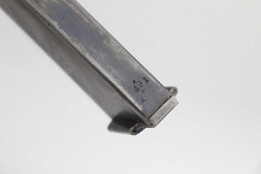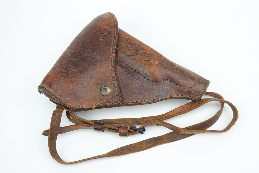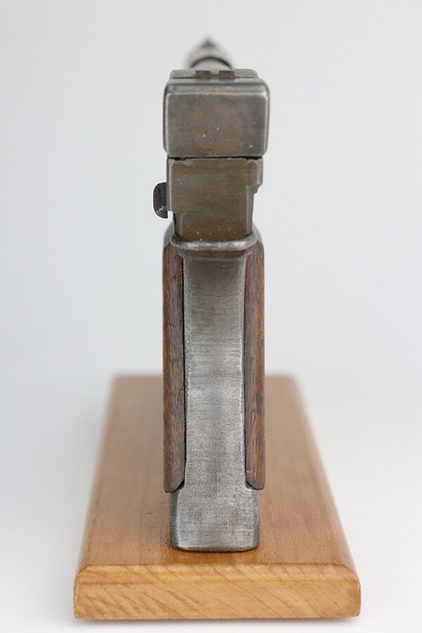 10/29/21 – This is an excellent example of a very late-war Nambu Type 94 issued to the Japanese military in January of 1945. The gun is all matching, was made in the Nagoya factory, and has an all-phosphate finish. It comes as a rig with one period-correct leather holster (with original shoulder strap) and two period-correct mismatched magazines (one is phosphate, the other is blued). These late-war phosphate finishes are difficult to rate, but we estimate it has retained about 96-97%. There is just very minor thinning on the straps and areas of minor discoloration here and there (typical). Comes with excellent late-war slab-side wood grips that are un-numbered. The bore is mint.