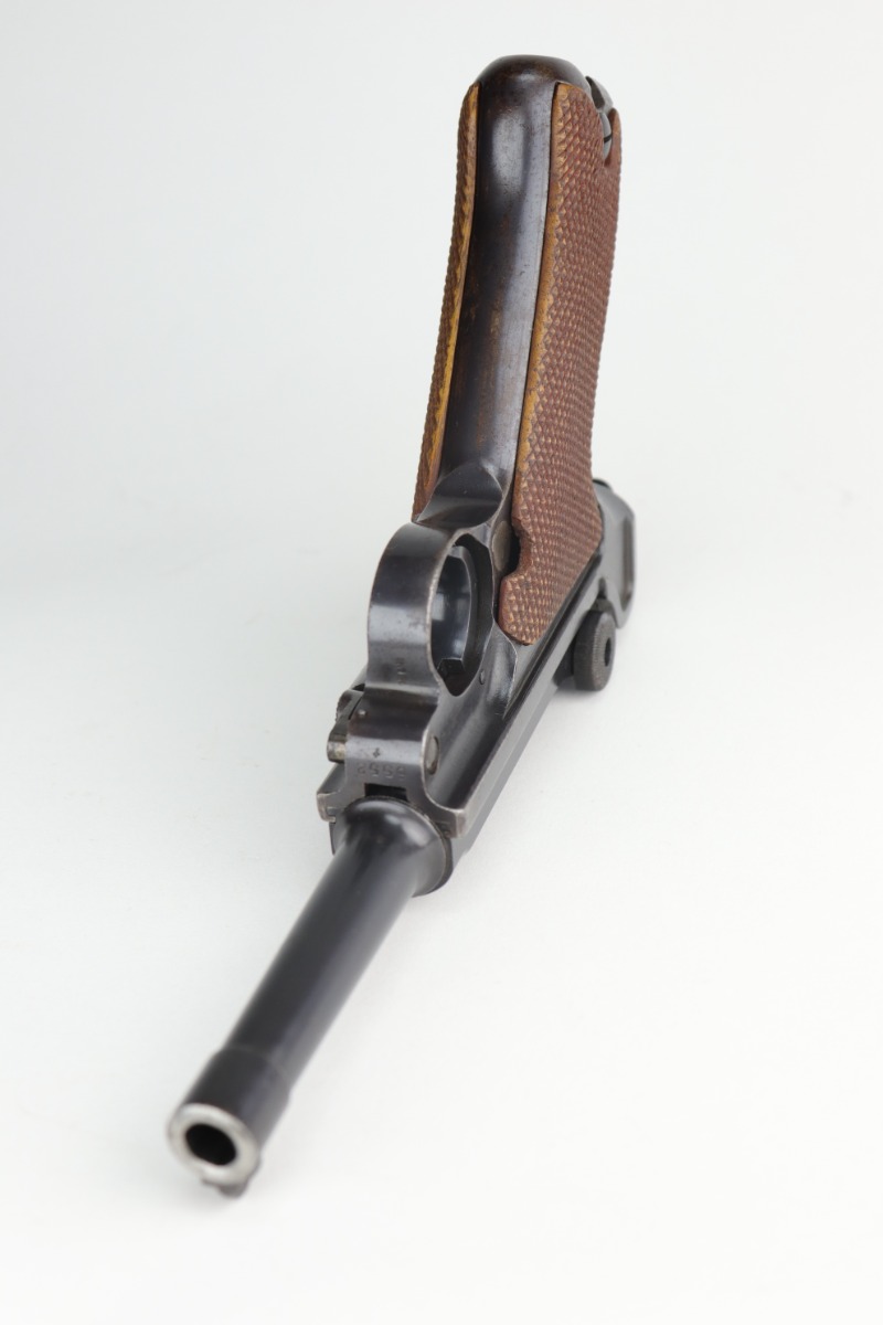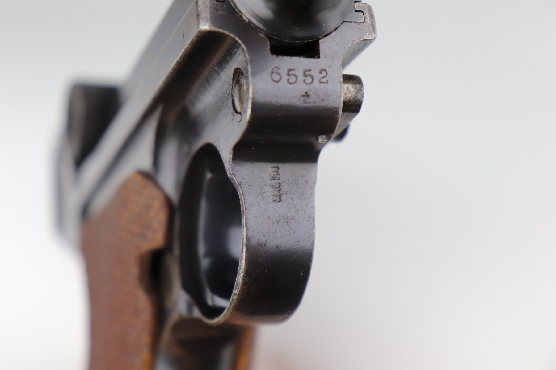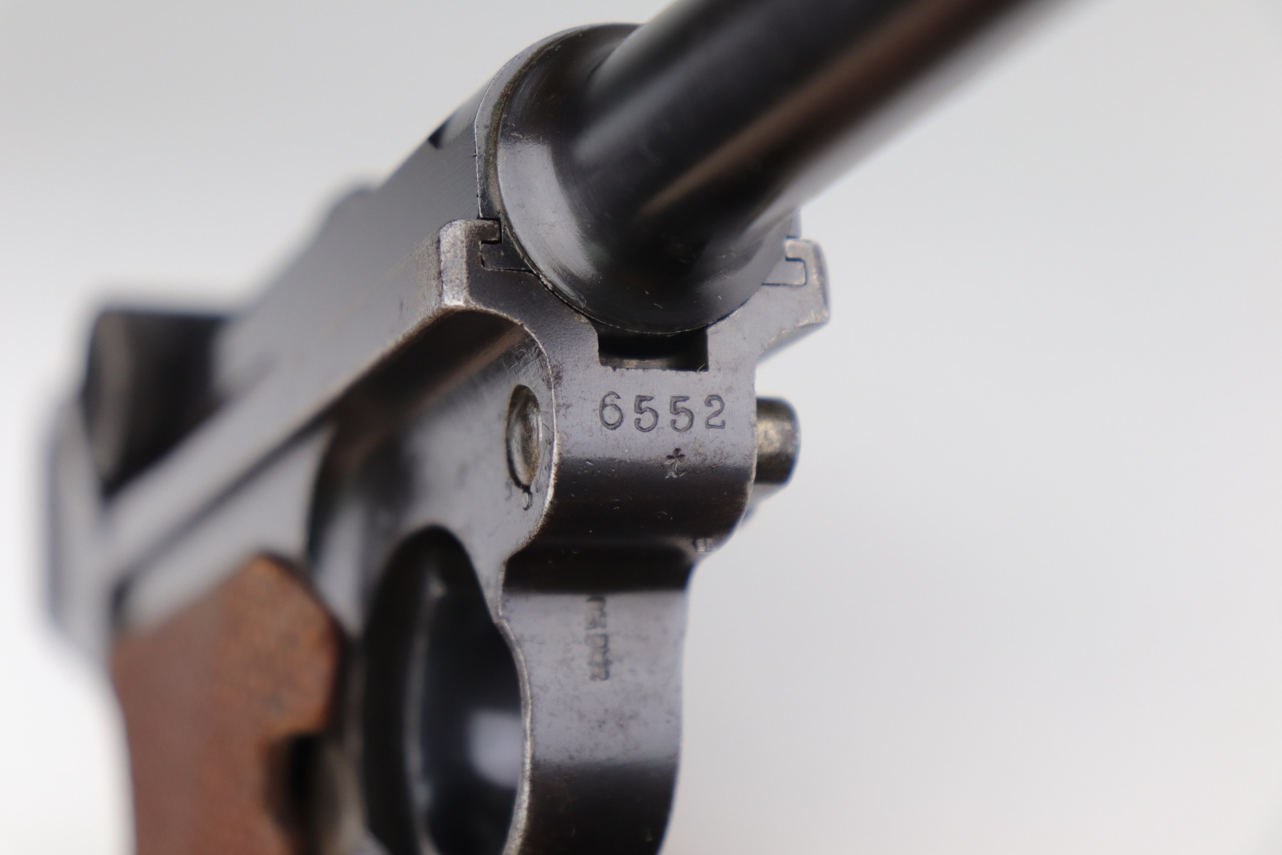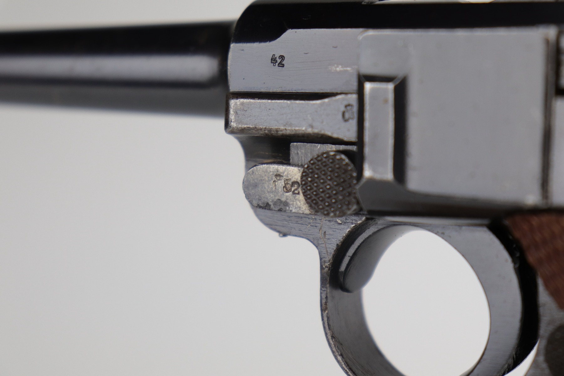 2/27/23 – This is an excellent Mauser Luger with an interesting composition. This gun is a put-together piece, most likely assembled at the end of WW2, in 1945. At this point in the war, the Nazis were essentially throwing guns together from leftover parts. This is an artifact of that time period. It has a Mauser toggle, the chamber is dated 1938, a few armorer’s replacement parts (42 and S/42), and some WW1-era parts with Imperial German proofs. All numbered parts have been made to match. Some parts are un-numbered. No military proofs except for the WW1 proofs. It comes with an un-numbered fxo magazine and excellent grips. Just a cool gun with great history. This one is in excellent condition, retaining about 95% of its bluing. There is spotty wear and oxidation on the straps. A hint of wear on the high edges of the frame and side plate. The bore is mint.