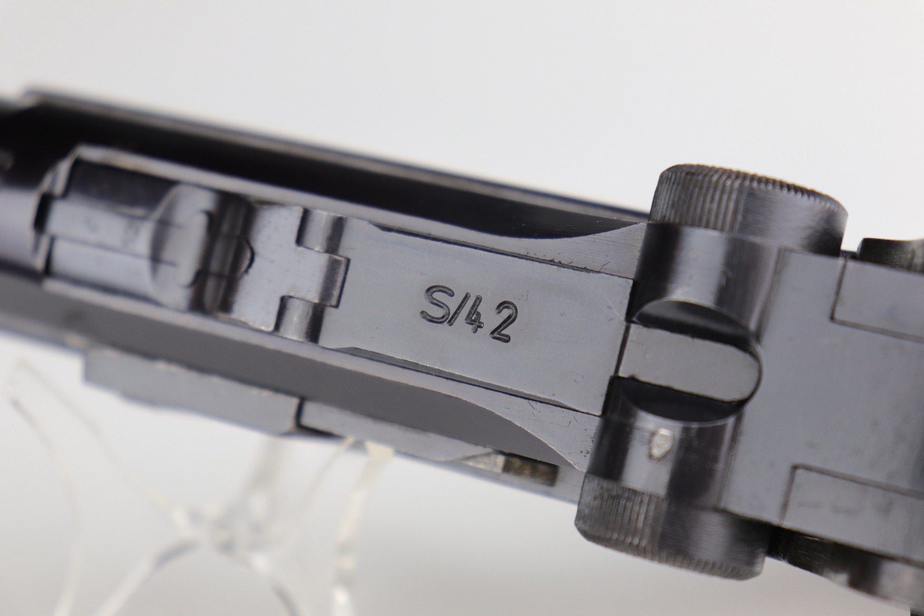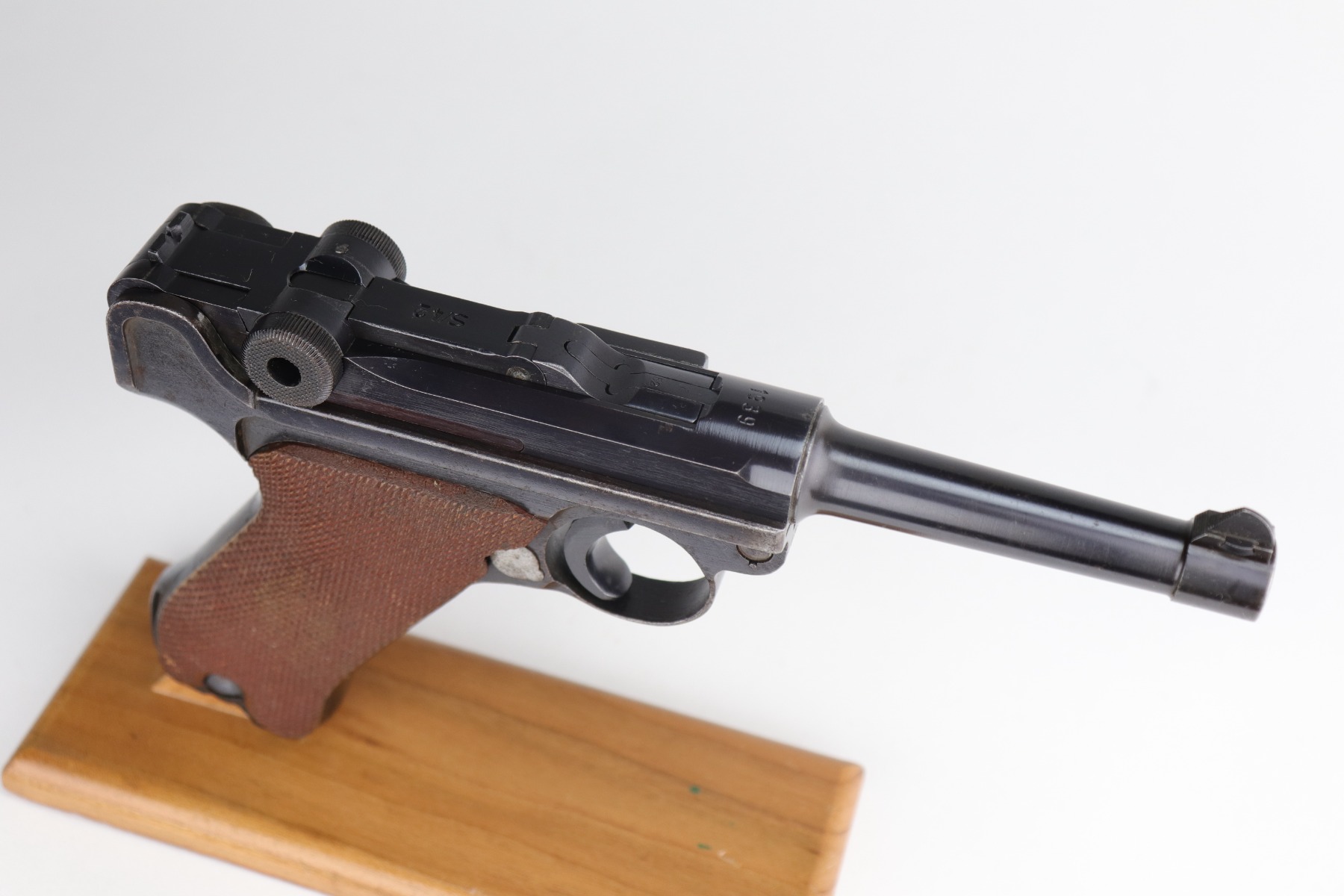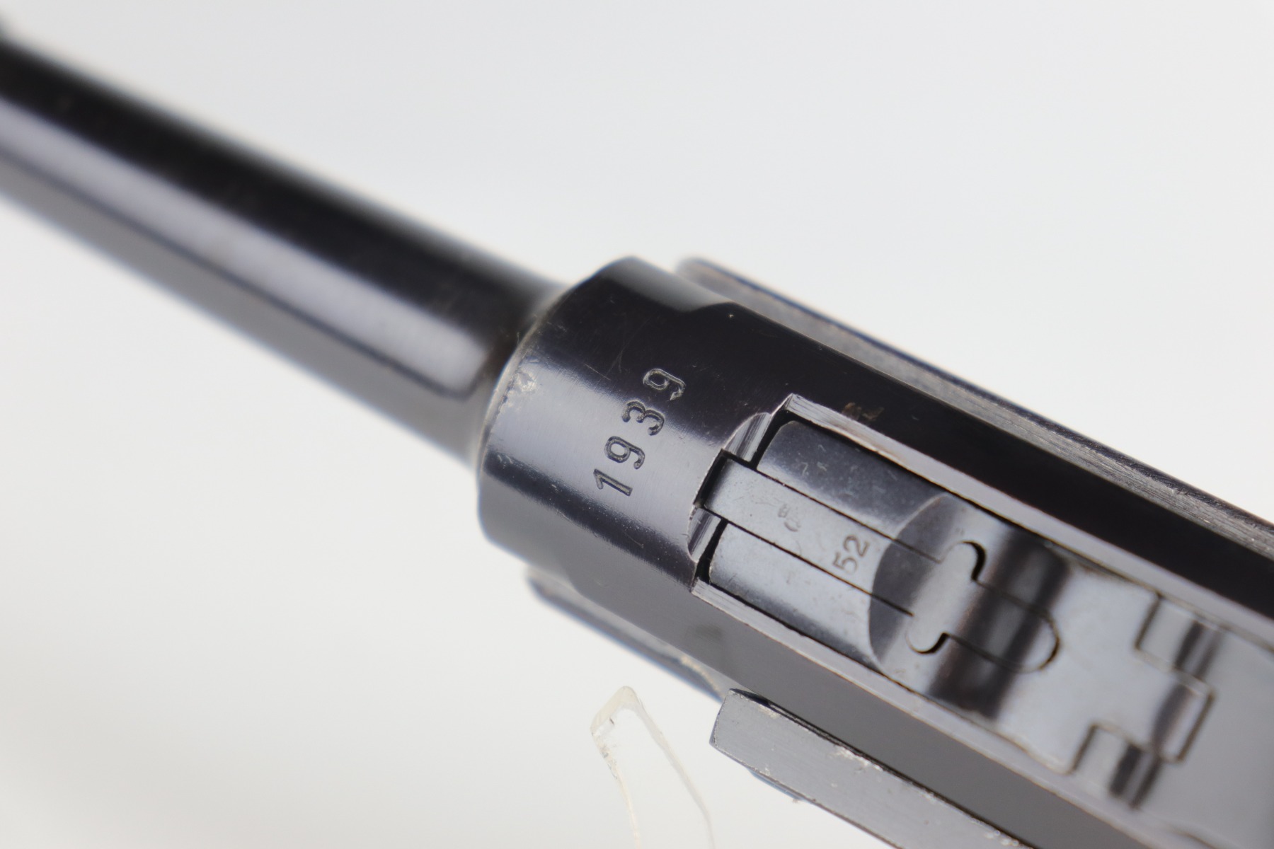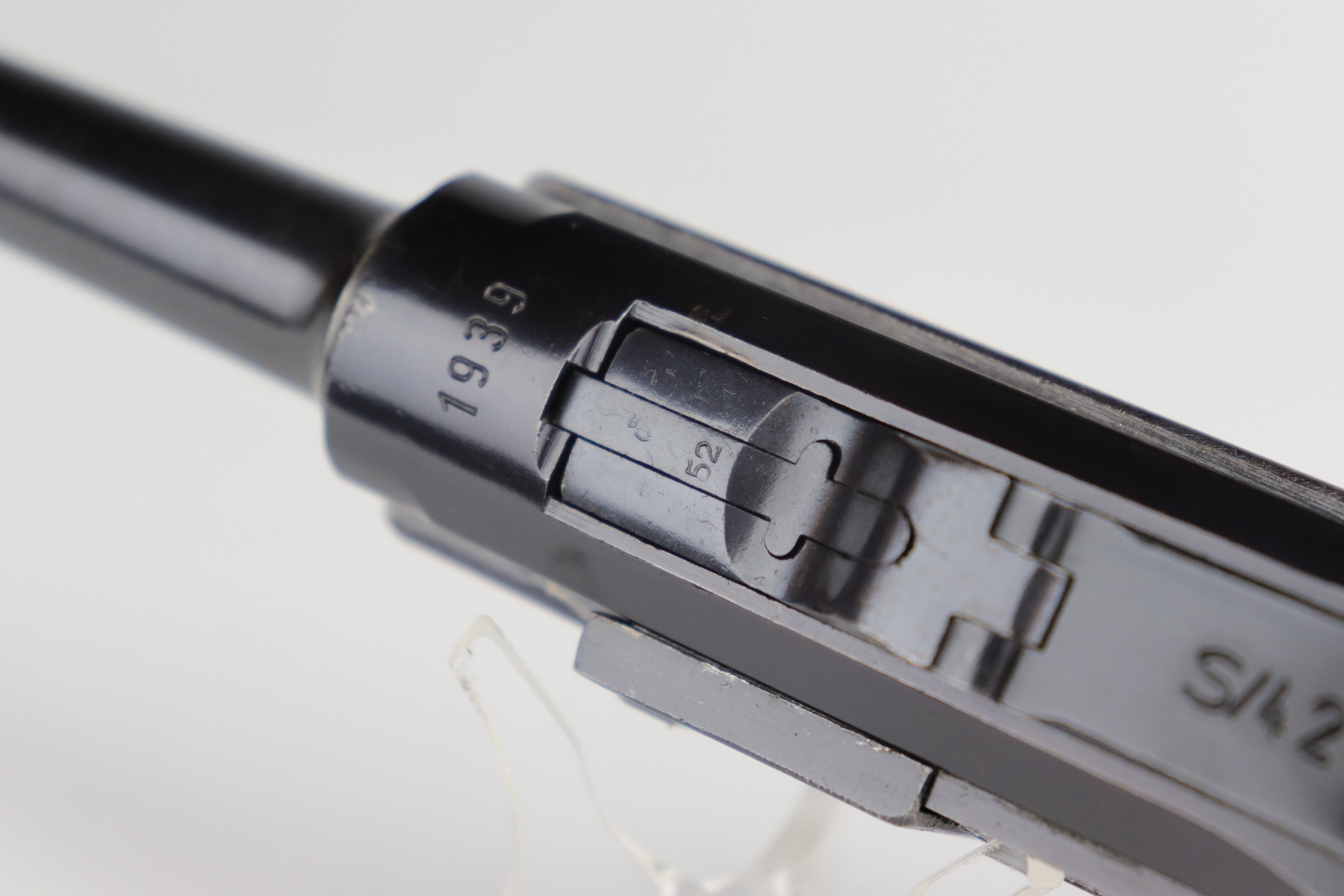 2/27/23 – This is an excellent Mauser Luger with an interesting composition. This gun is a put-together piece, most likely assembled at the end of WW2, in 1945. At this point in the war, the Nazis were essentially throwing guns together from leftover parts. This is an artifact of that time period. It has a Mauser toggle, the chamber is dated 1938, a few armorer’s replacement parts (42 and S/42), and some WW1-era parts with Imperial German proofs. All numbered parts have been made to match. Some parts are un-numbered. No military proofs except for the WW1 proofs. It comes with an un-numbered fxo magazine and excellent grips. Just a cool gun with great history. This one is in excellent condition, retaining about 95% of its bluing. There is spotty wear and oxidation on the straps. A hint of wear on the high edges of the frame and side plate. The bore is mint.