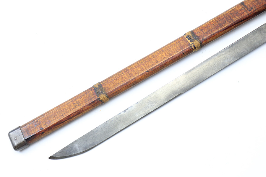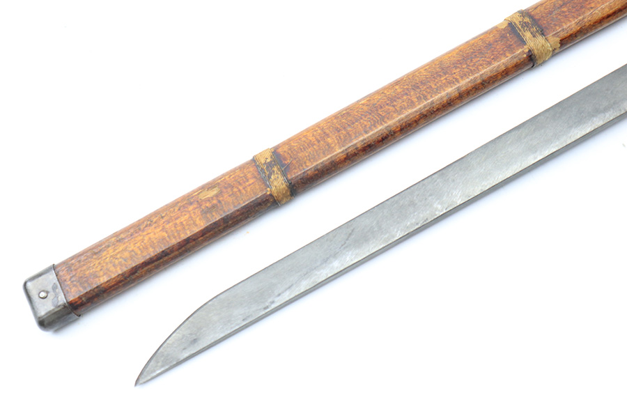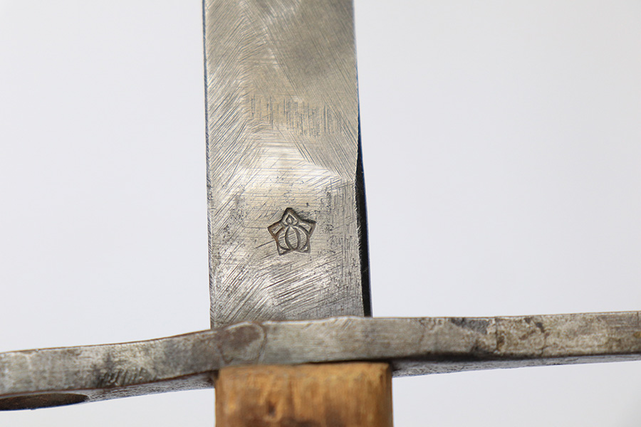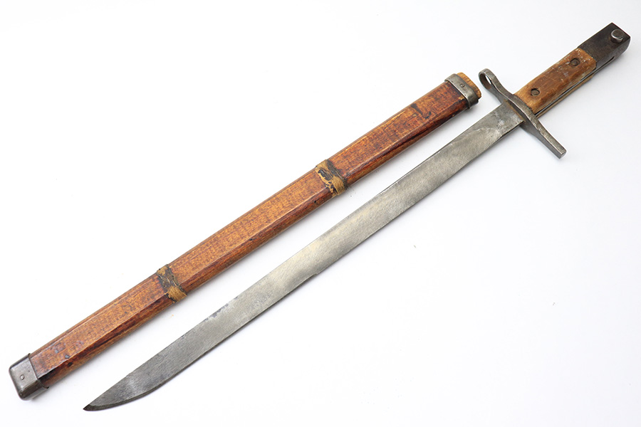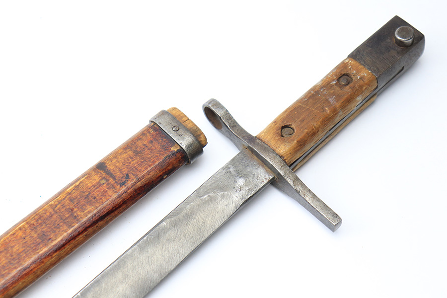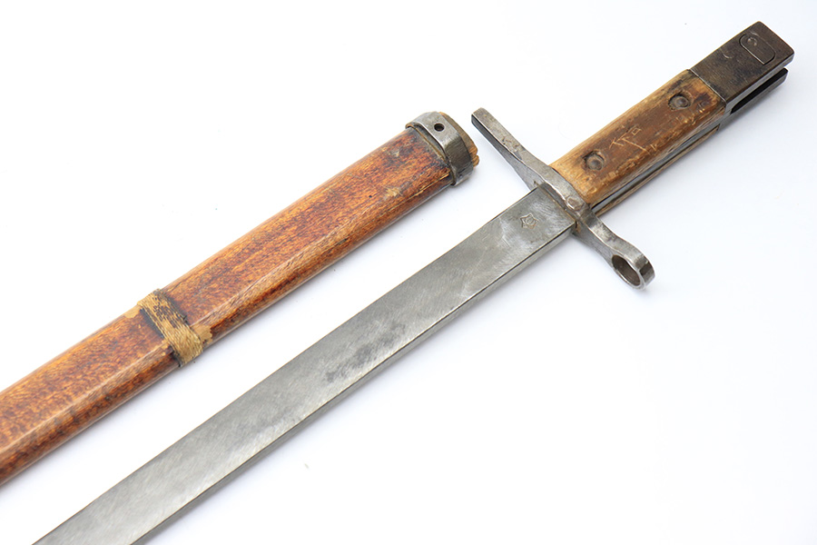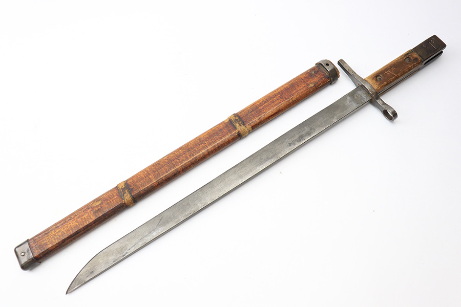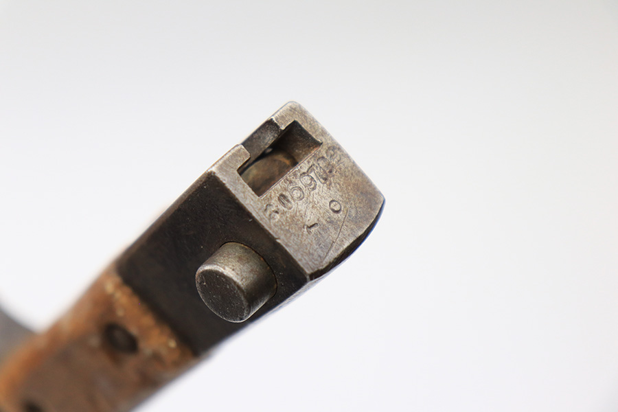 5/31/22 – This is a late / end-of-war production Type 30 Japanese Arisaka rifle bayonet. The bayonet shows late war features like a crude wood handle, straight pommel, slab-side blade, and a bamboo wood scabbard. The blade has some rough machine marks throughout but is in great condition with minimal staining or wear. Maker stamped on one side of the ricasso. The pommel is proof stamped and serial numbered. The scabbard fits somewhat loosely, and can slide on and off just with gravity, but this is common for these late-war production bayonets.