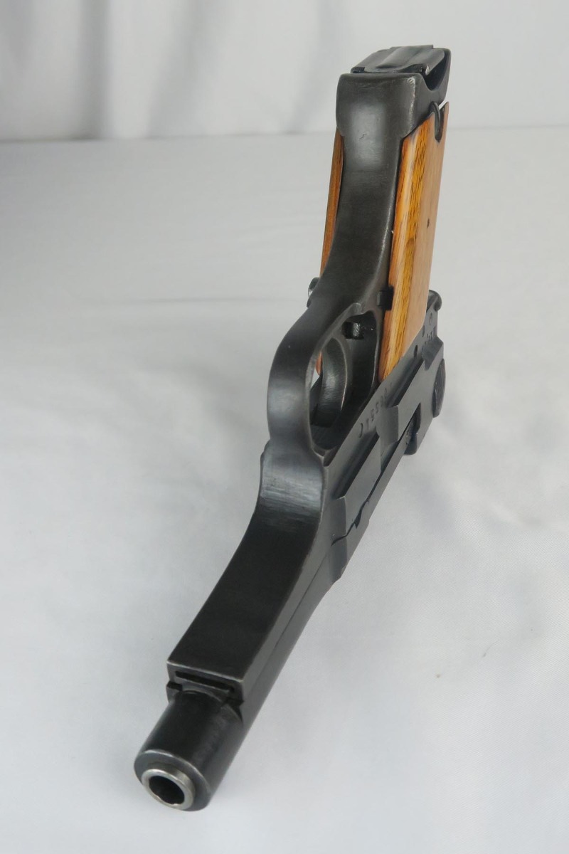1/10/18 – This is an excellent, all matching Type 94 Nambu from the end of the war.  The finish rates at about 97% with minor high edge wear.  The pistol includes the original matching magazine.  The grips are likely replacements as they are not numbered and may have had a coat of varnish applied to them.  Right side frame is dated to December of 1944.  Excellent bore.