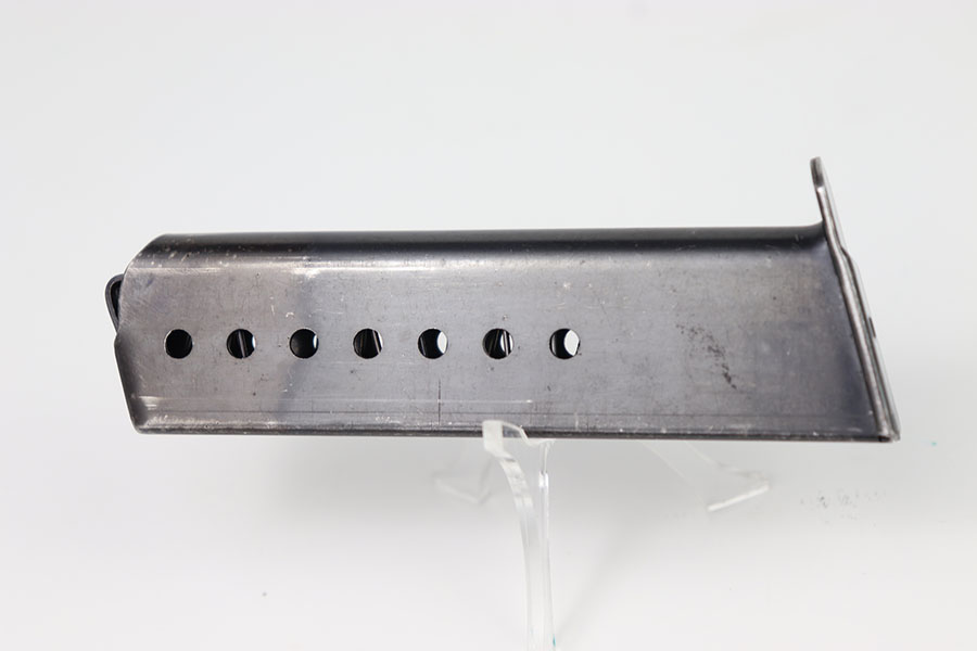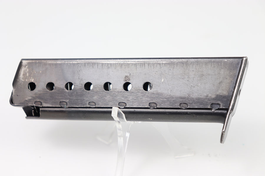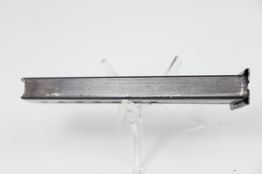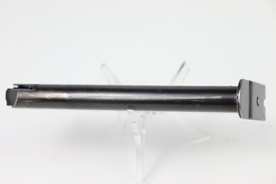 8/8/24 – This is an unusual late WW2 production P.38 magazine. There are no markings or stamps anywhere on this magazine, and the tube has a blued finish and machining marks on each side. We believe this is a late war example. There were completely unmarked magazines that were issued with Spreewerk P.38 Pistols. Great overall condition with some rough machining marks also indicating a late war magazine. A fully functional spring.
