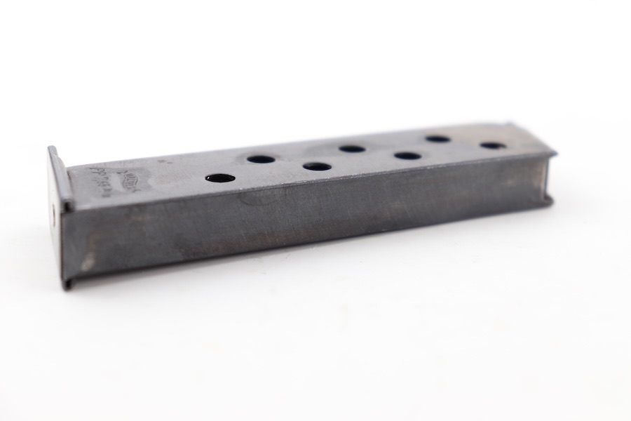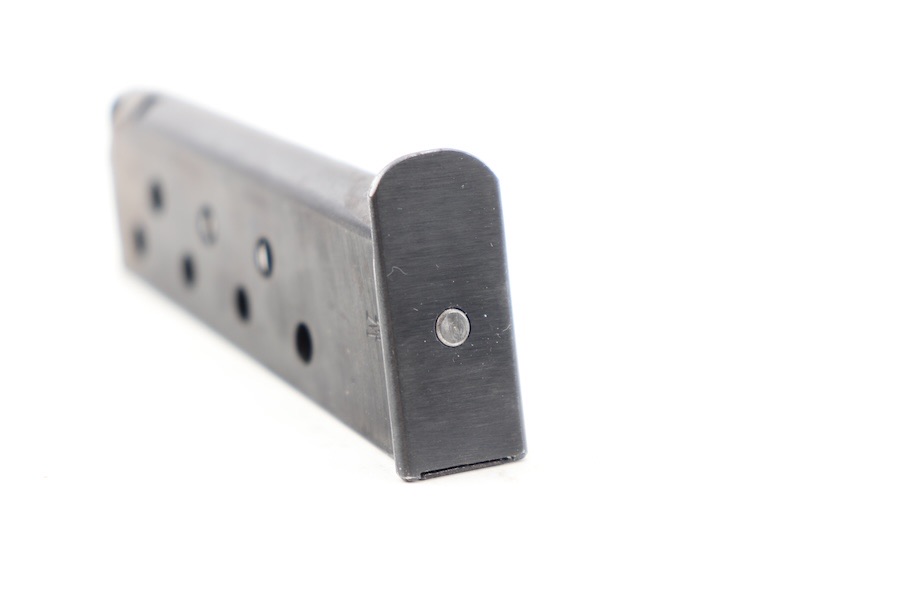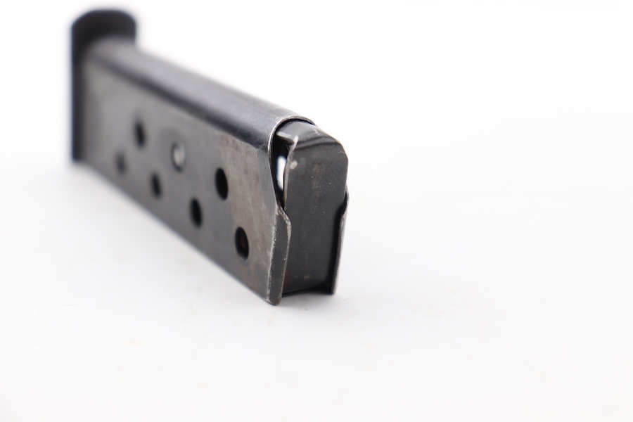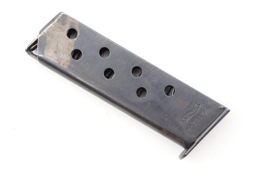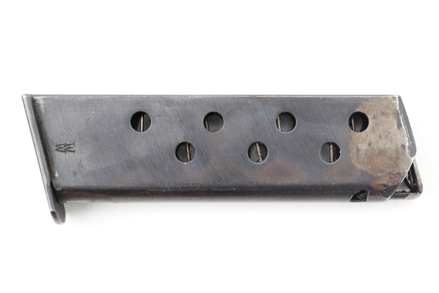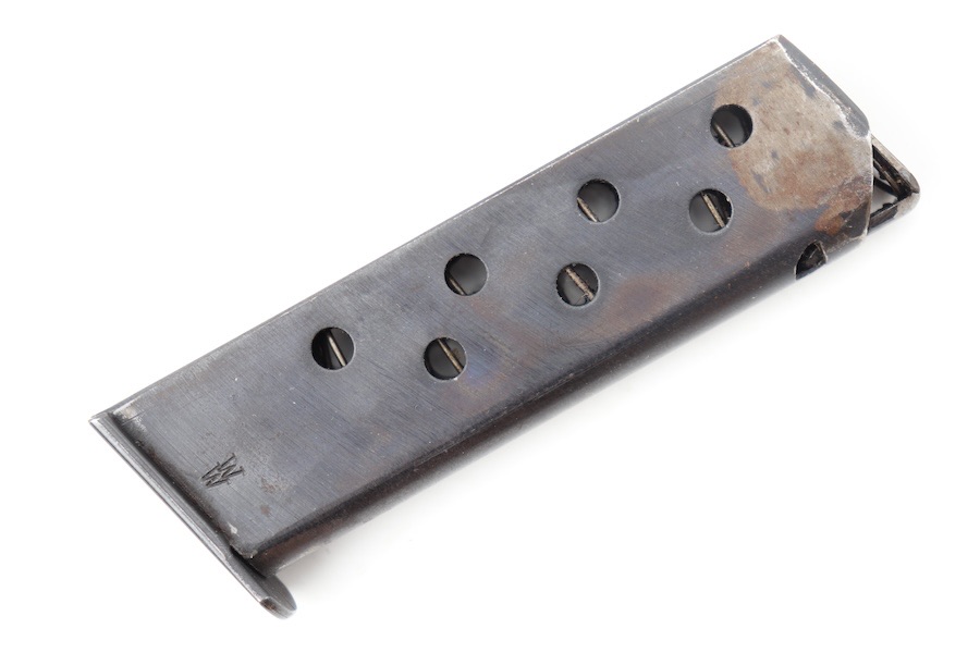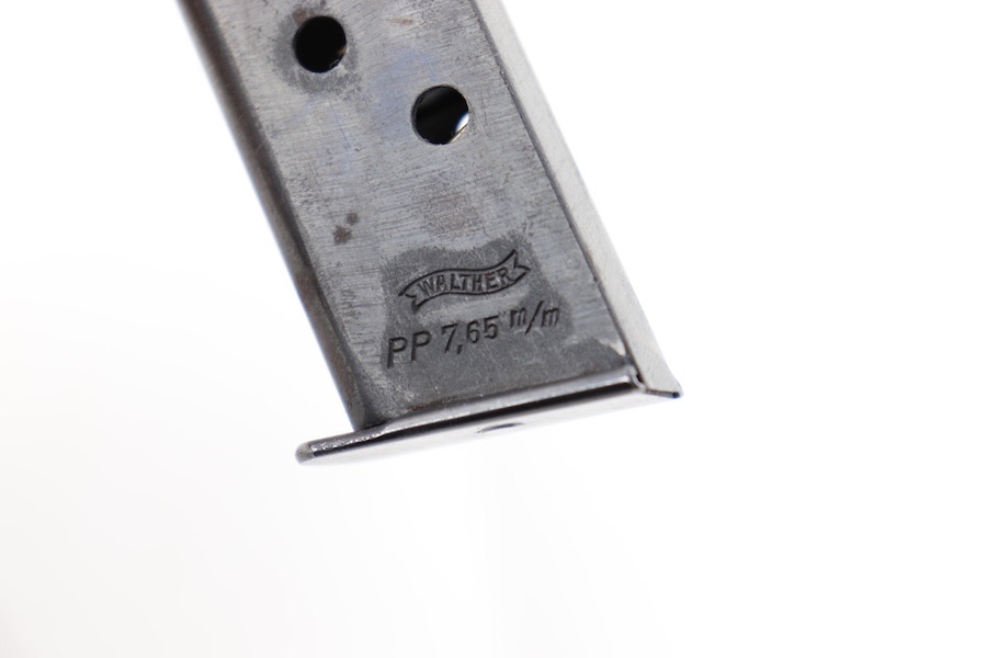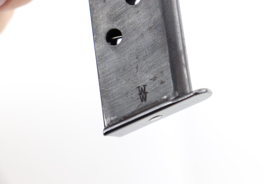 1/31/24 – This is a great and original condition late WW2 Walther PP magazine. This magazine retains 80 to 85% of the original blued finish. The majority of finish loss is located just under the feed lips of both sides. Spring is strong, smooth, and functional. Walther banner and 7.65m/m are stamped on the bottom left side of the tube. On the lower right side of the tube is a W, which means the magazine is unhardened, a step that was skipped to save time and money. However, this magazine is a bit of a fluke as it was double W marked, making it a factory error and an interesting example.