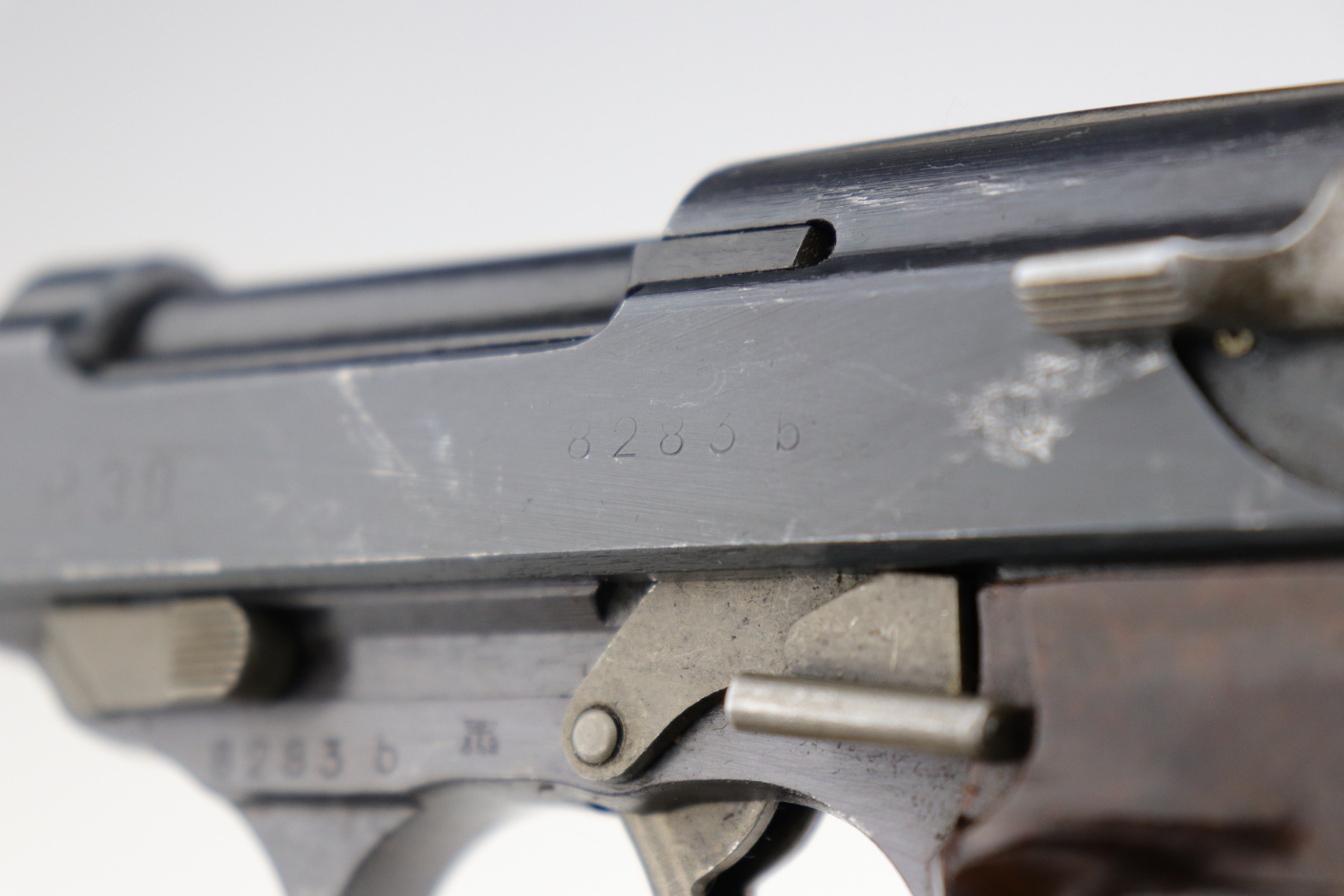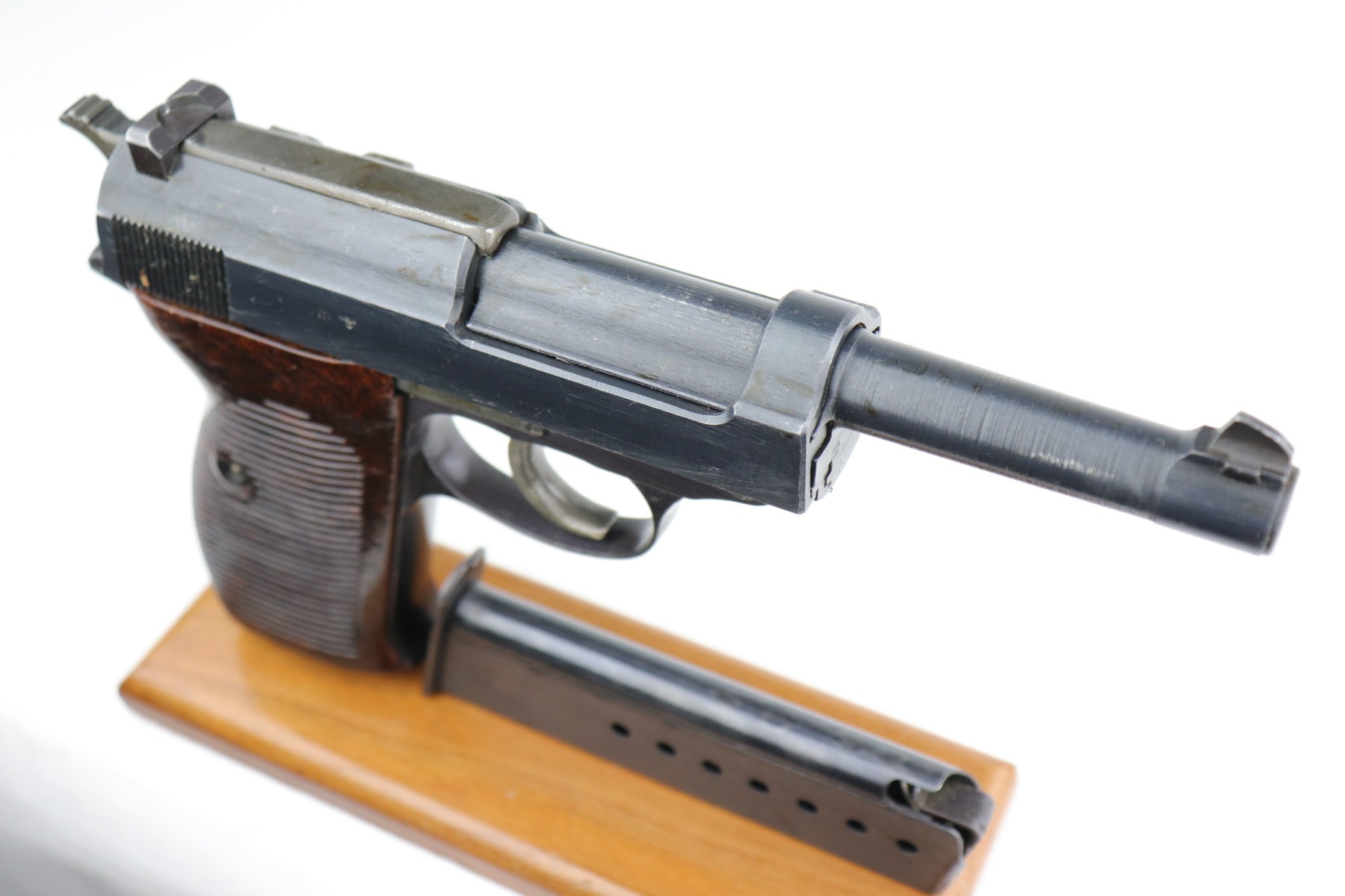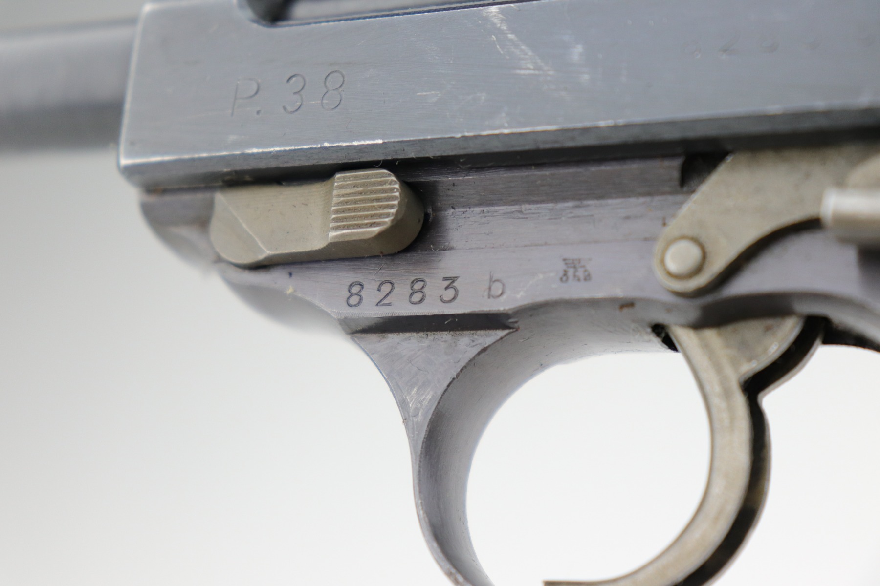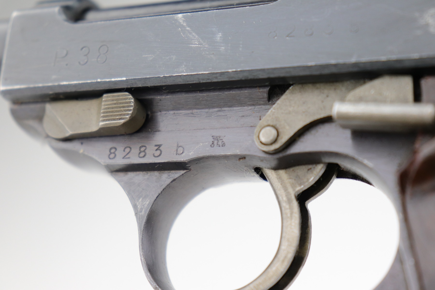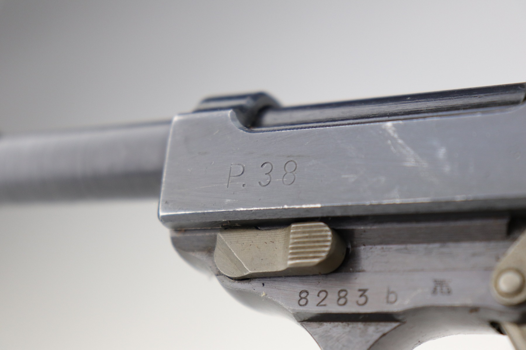 12/22/22 – This is a minty example of Walther P.38 issued to the Nazi military in March of 1945. The serial number is in the “b” block. This one also has a Czech “fnh” barrel. It is all matching and has “Eagle 359” military proofs. Late-war cog hammer with phosphated small parts. It has retained about 97-98% of its original finish. There are a few marks on the left side and top of the slide. It has excellent grips and a “U” marked magazine. De-cocker is fully functional. The bore is mint.