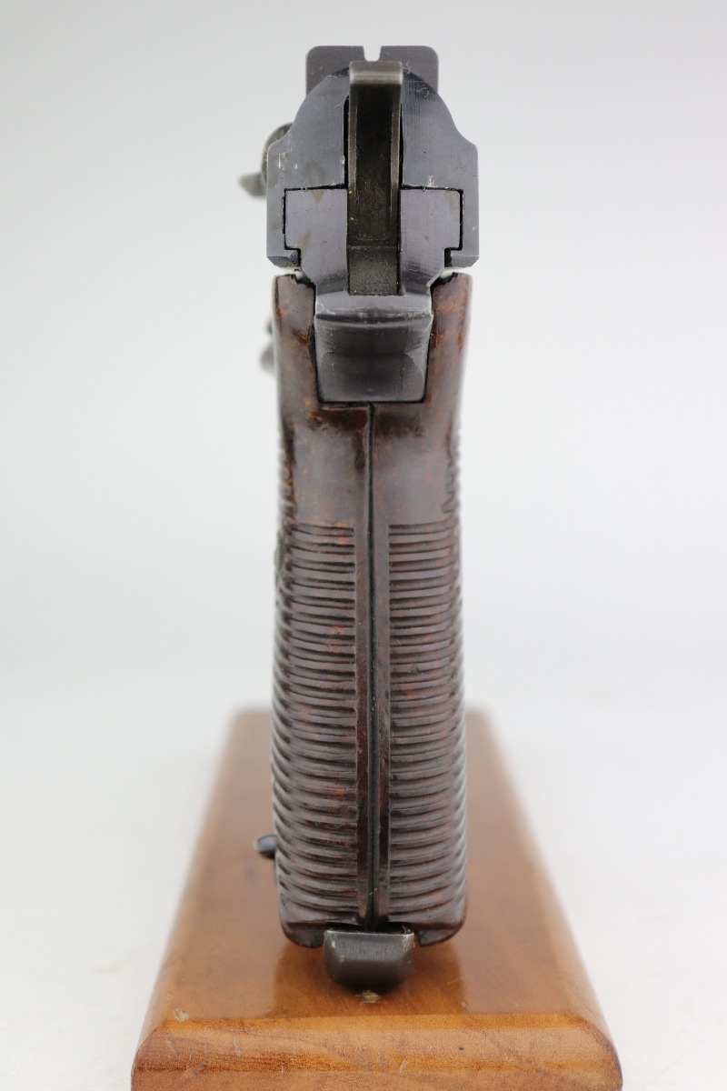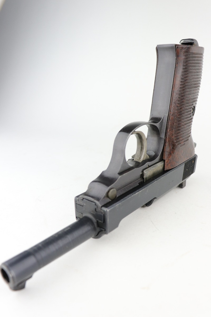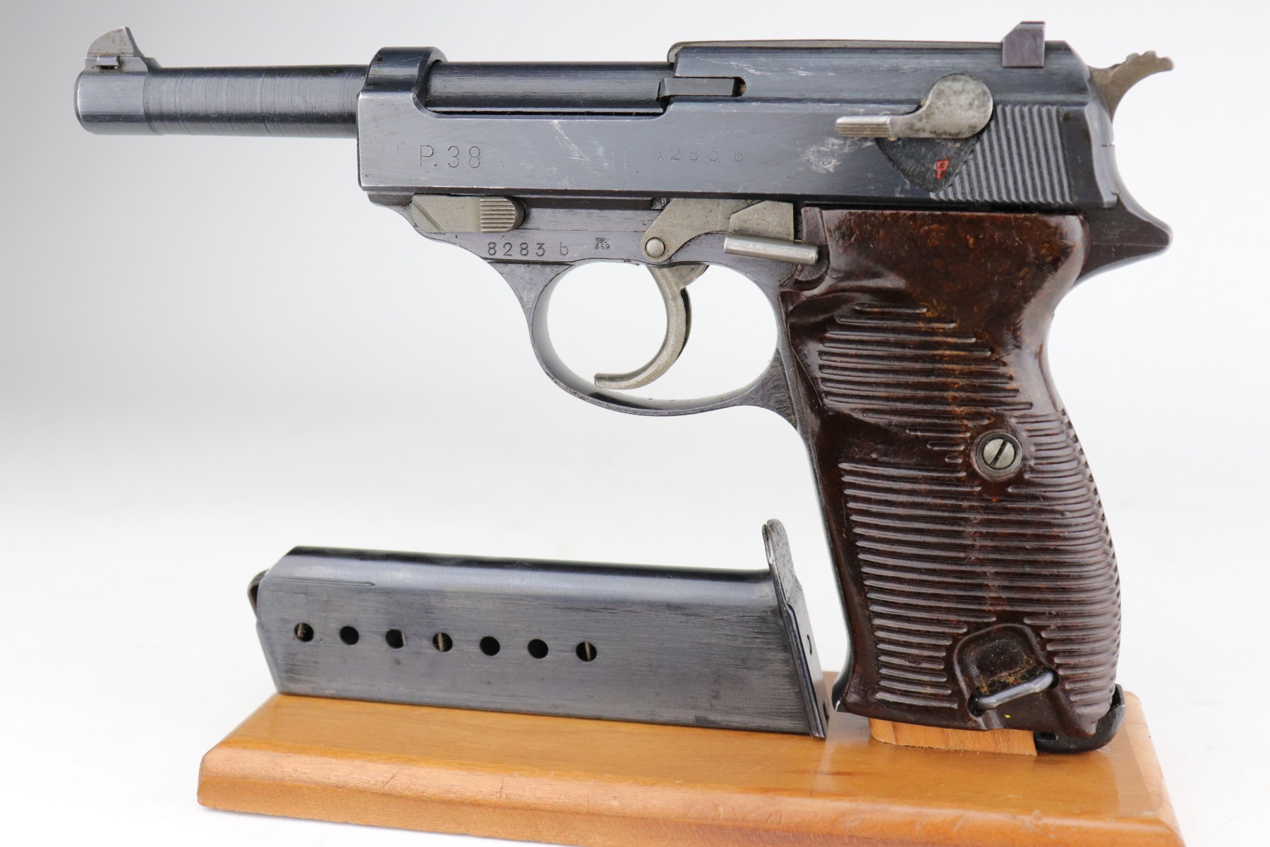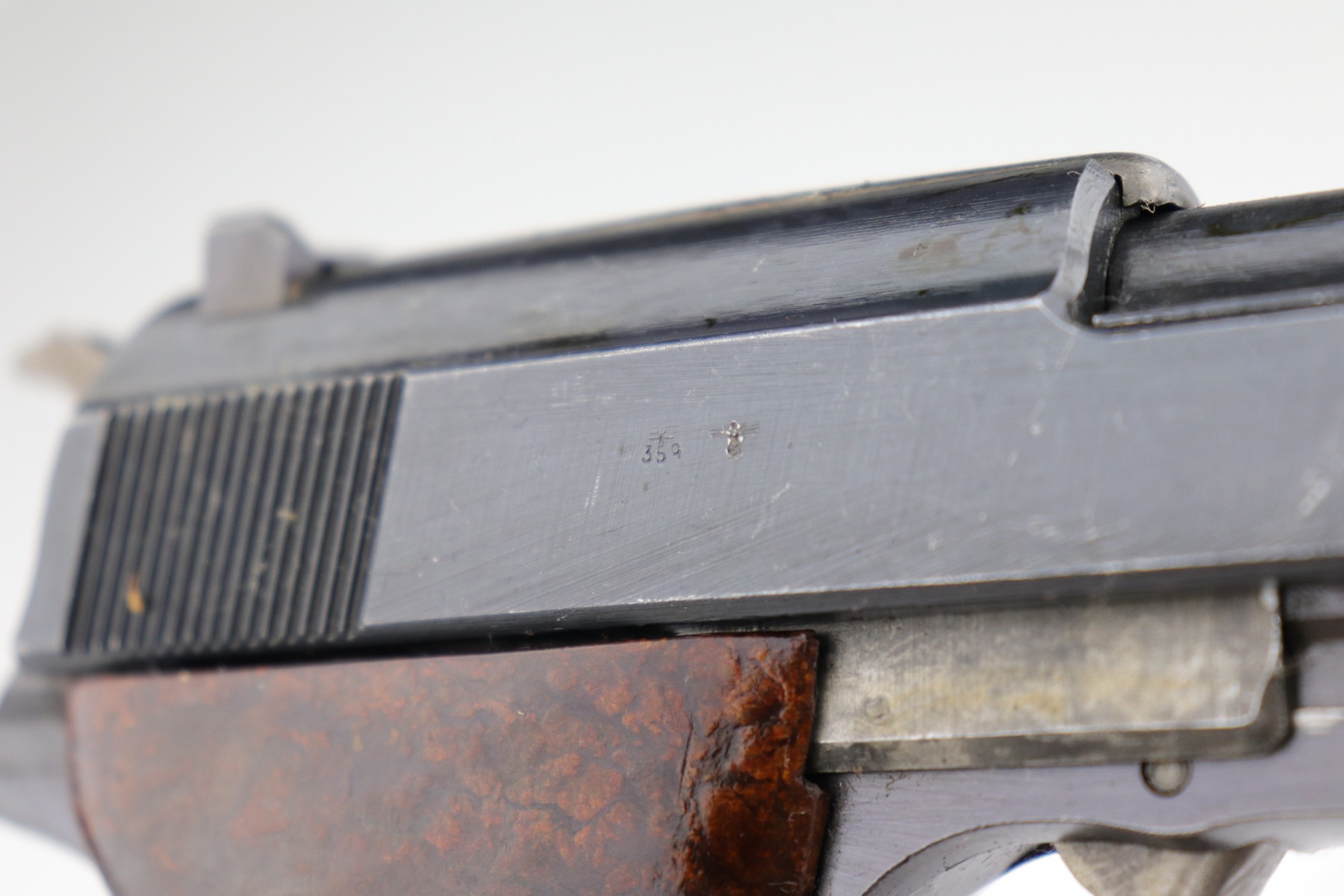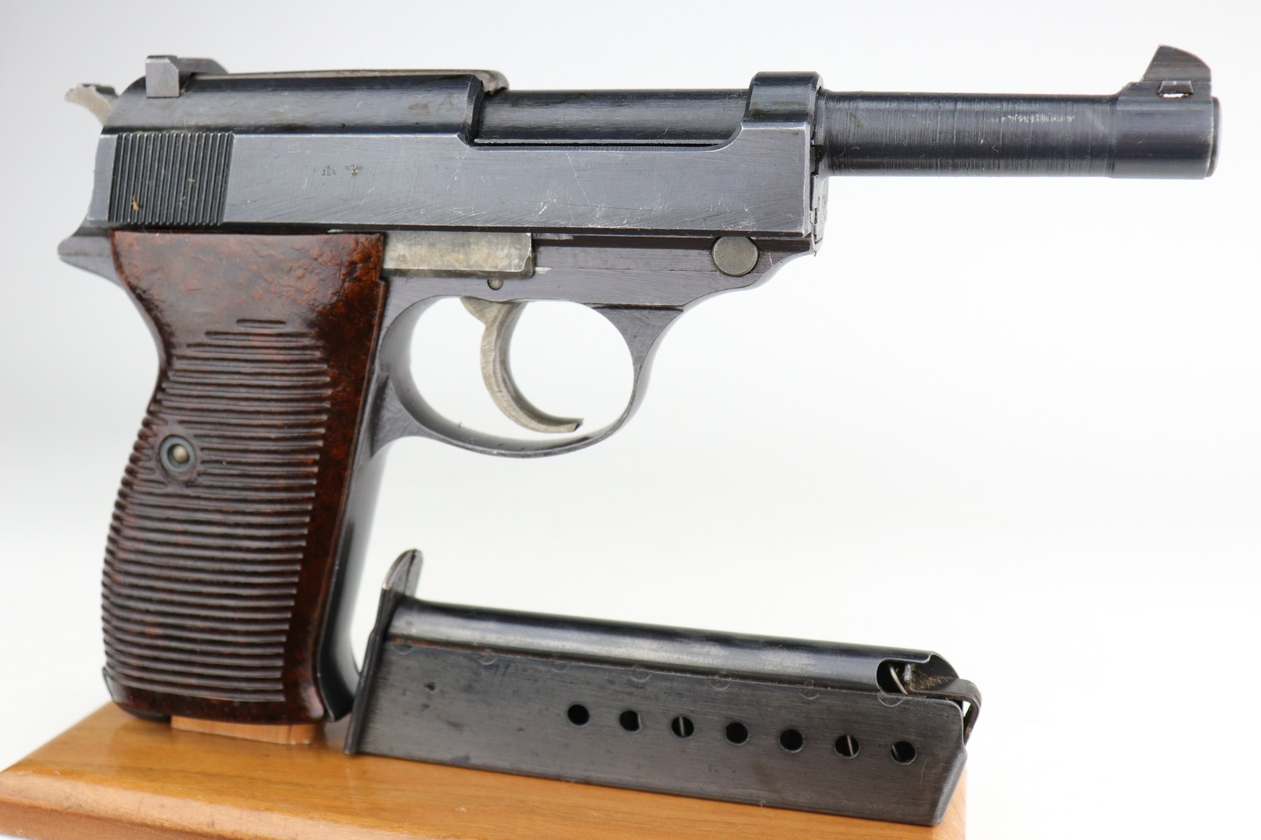 12/22/22 – This is a minty example of Walther P.38 issued to the Nazi military in March of 1945. The serial number is in the “b” block. This one also has a Czech “fnh” barrel. It is all matching and has “Eagle 359” military proofs. Late-war cog hammer with phosphated small parts. It has retained about 97-98% of its original finish. There are a few marks on the left side and top of the slide. It has excellent grips and a “U” marked magazine. De-cocker is fully functional. The bore is mint.
