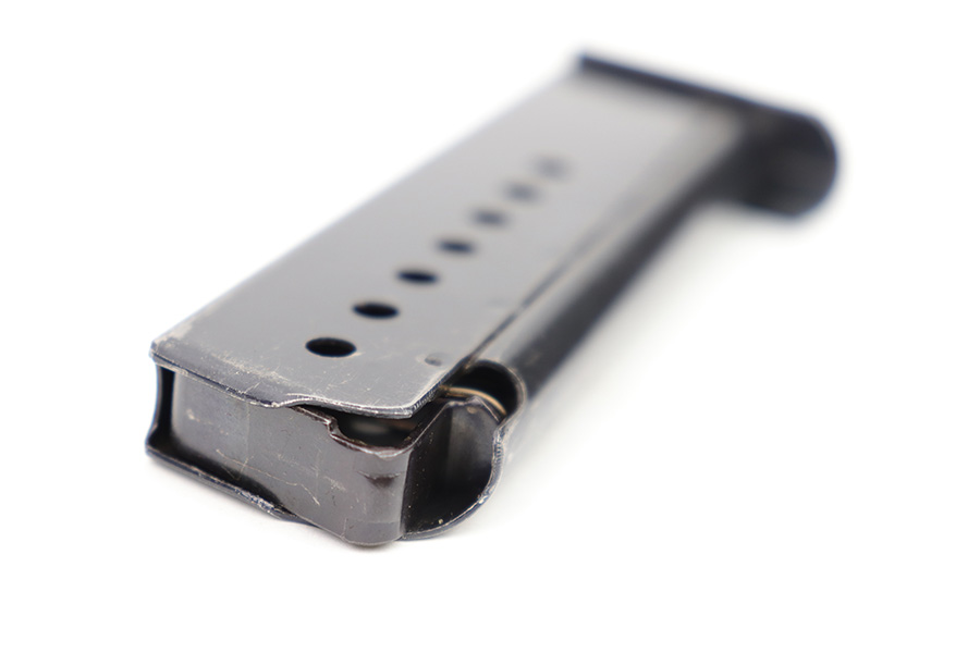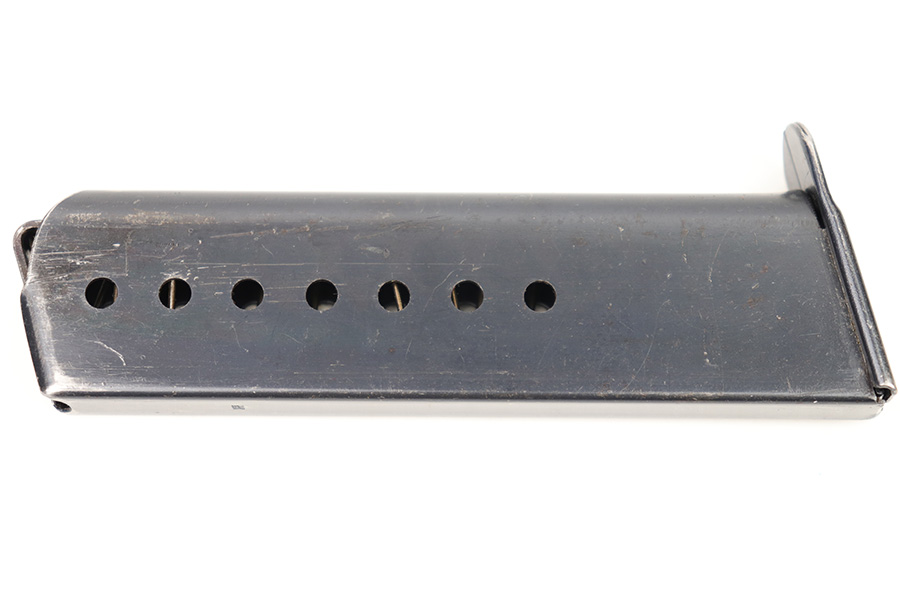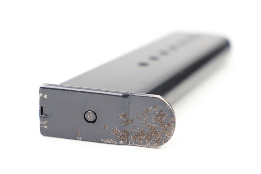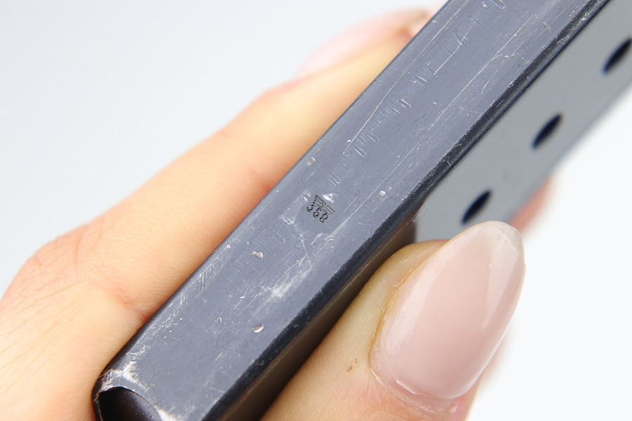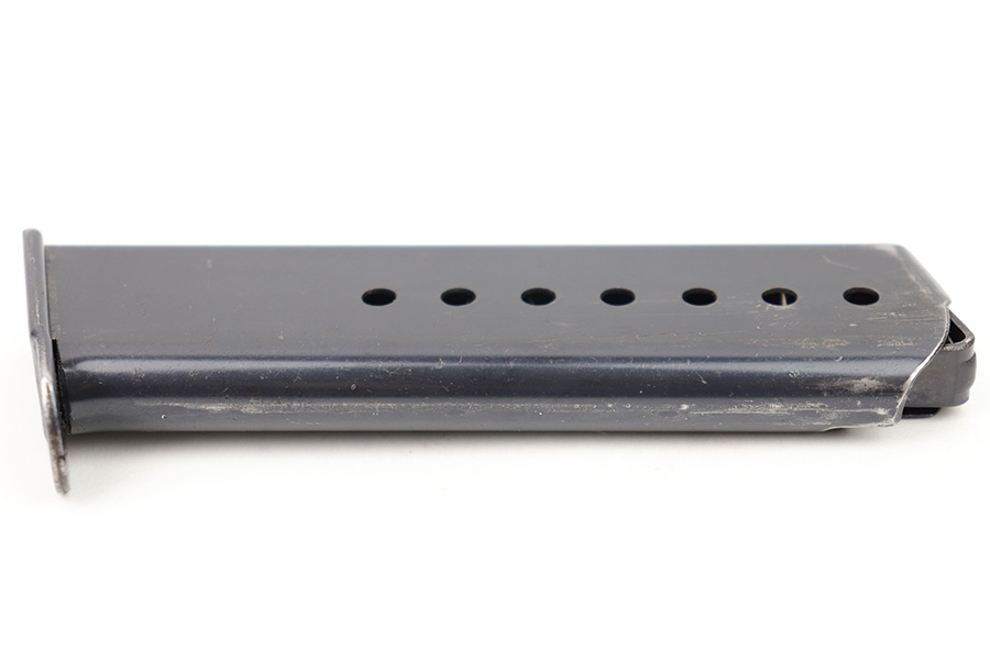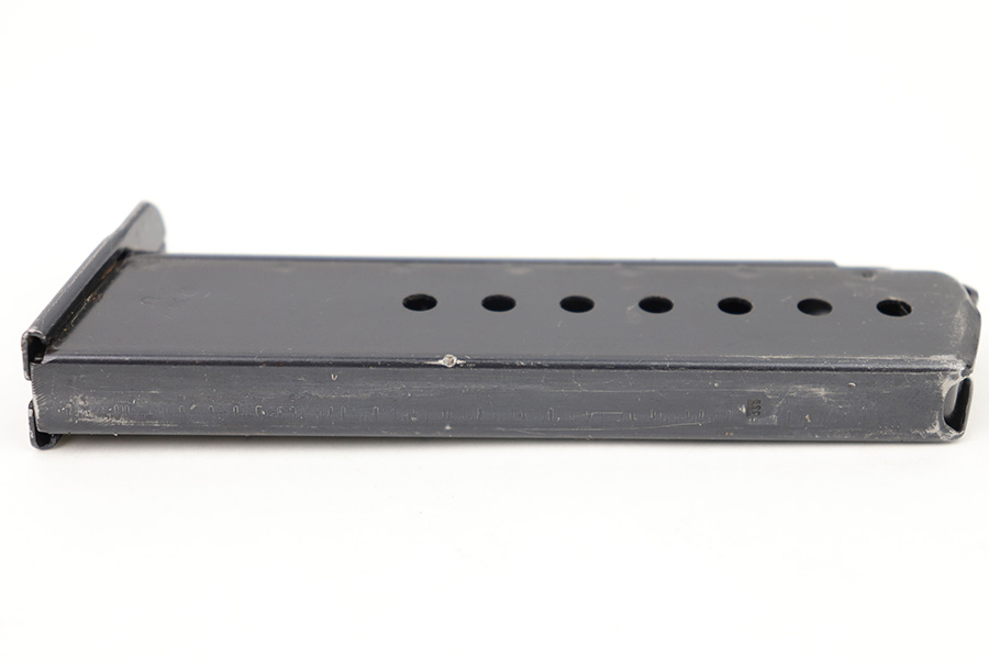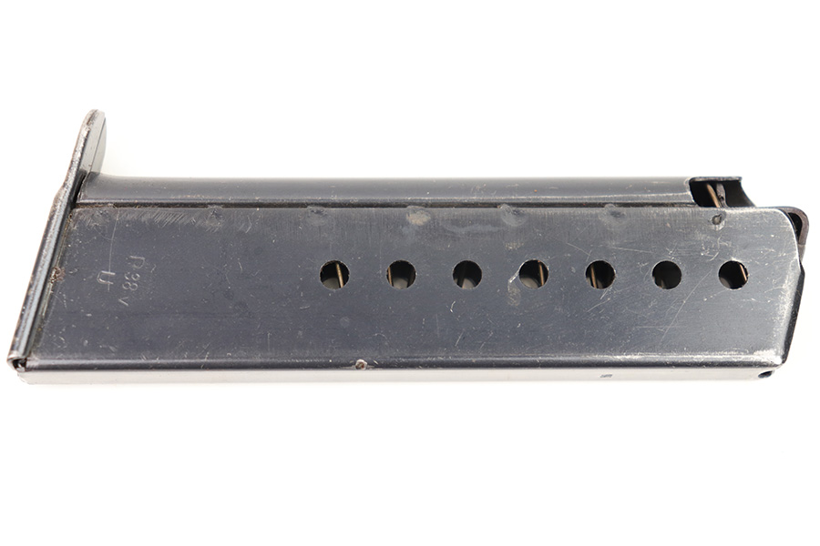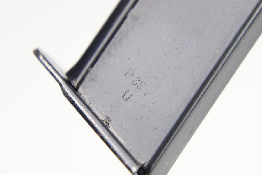 2/22/23 – This is an original late WW2 production Walther P.38 magazine. The magazine is stamped on the left side of the tube, P.38v with a “U” underneath for unhardened metal, a manufacturing step that was skipped later during the war. The magazine is also Walther proof stamped on the spine. The finish is excellent throughout the tube, but there’s some mild surface patina on the base as shown. Strong, functional spring.