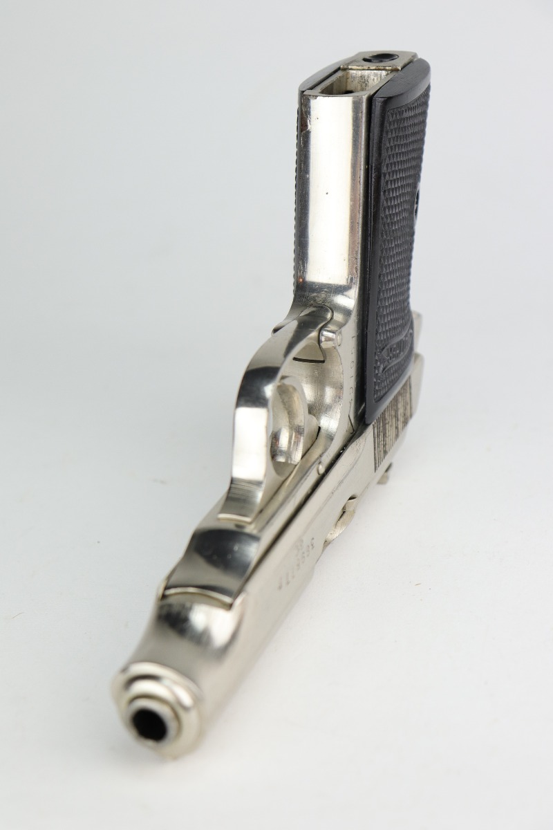 12/22/20 – This is a very nice example of an end-of-war Walther PP that was assembled by and later nickel-plated by a GI. Because it was never fully assembled or issued, there are no firing proofs and no slide legend. And the slide and frame are mismatched because they were assembled by parts laying around. This is a documented variation. This is in the correct serial range for that variation. It was brought home and later nickel-plated. This was common. It has retained about 92-93% of its nickel finish. There is wear on the straps, tang, and back of the slide. The bore is excellent – shiny with strong rifling. It comes with excellent grips and a nickeled magazine. The slide has a little trouble staying back. If you push up slightly on the magazine bottom, it works fine.