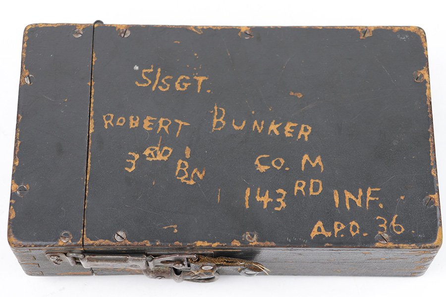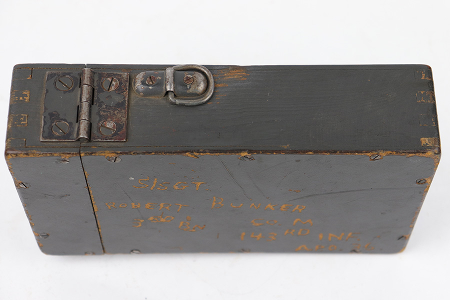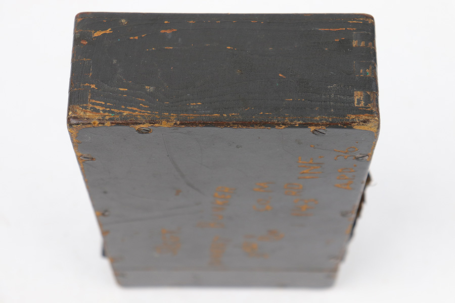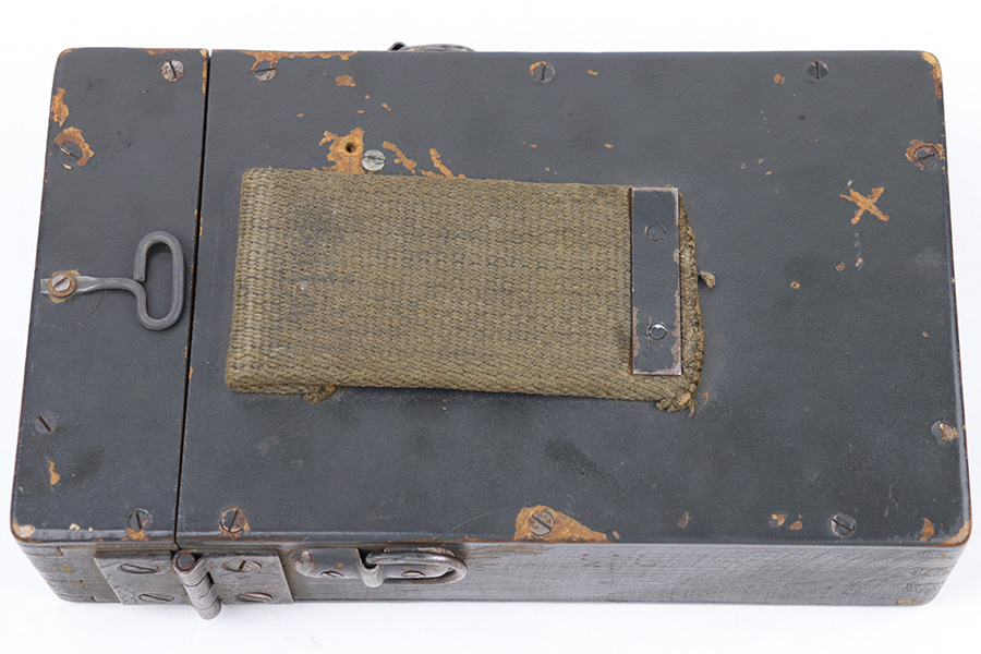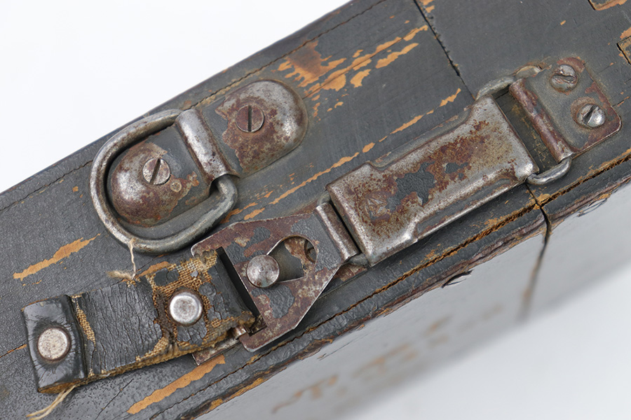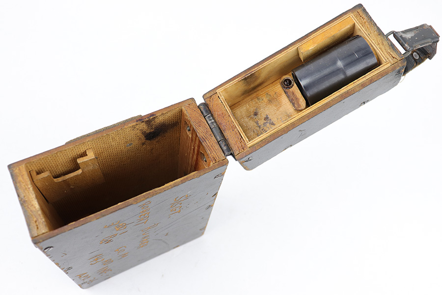 5/16/23 – This is a rare, late WW2 production wood ZF 4 scope case. The case exterior has the name of a veteran who likely captured and brought this item home scratched into the wood on one side, as shown (Sgt. Robert Bunker). There are some areas of chipped / missing paint, but the wood is excellent and complete with no cracks or major issues. The lid and secure strap are intact with smooth functioning hinge. The interior lid is waffen proof stamped as shown. Clean interior and includes a metal sun shade cover for a ZF scope.
