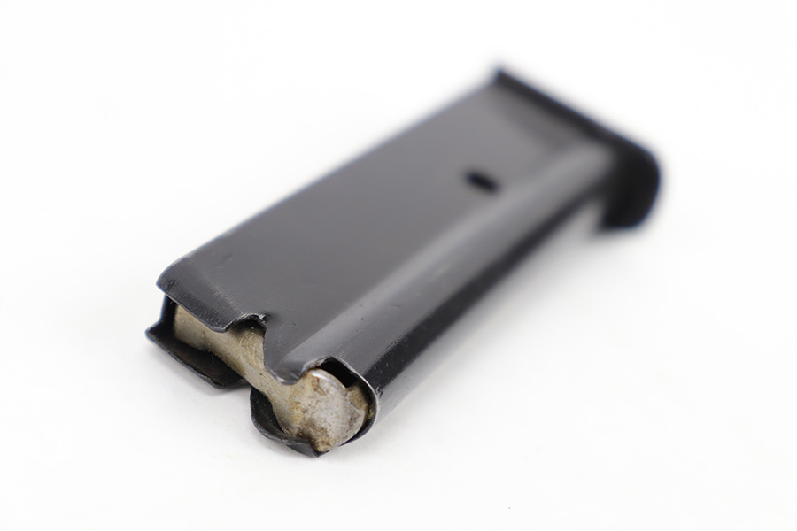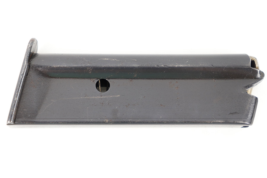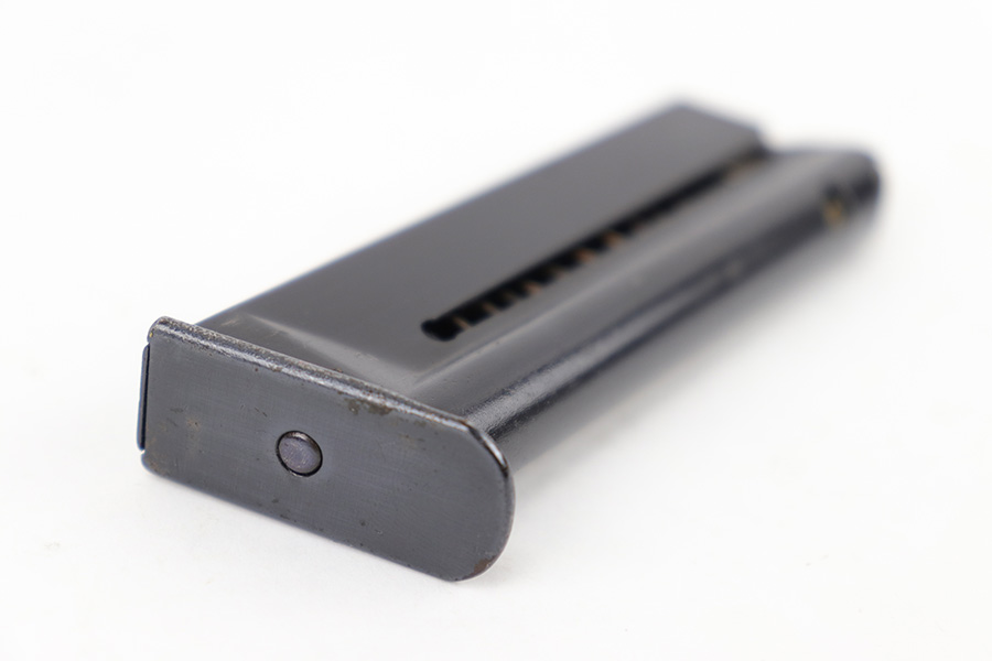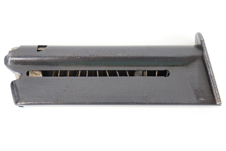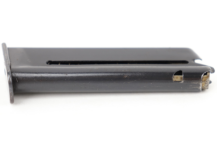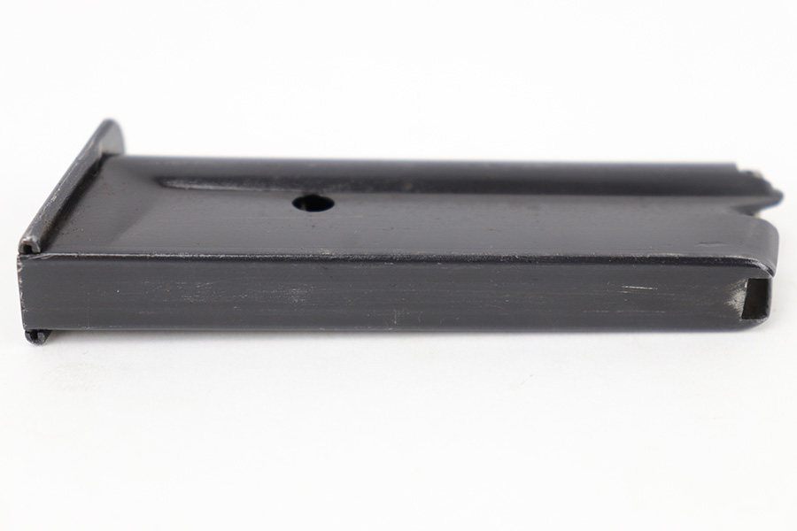 5/12/23 – This is an original, later WW2 production Walther PPK magazine in .22 LR. The magazine has excellent bluing throughout with some mild surface patina and a few small pinpricks on the tube. No markings or stamps. The lack of a side button or knob is characteristic of late-WW2 production. Fully functional spring.