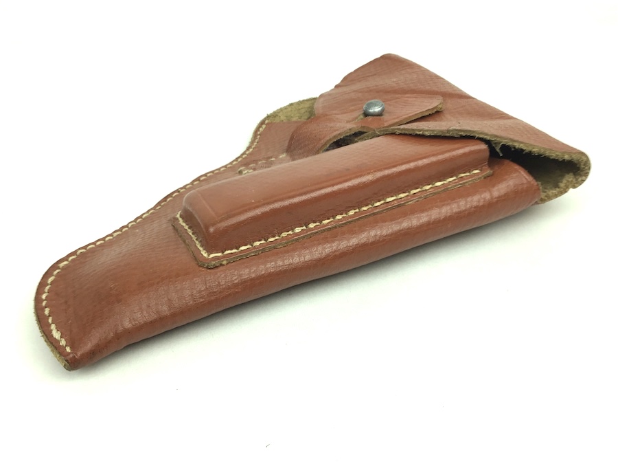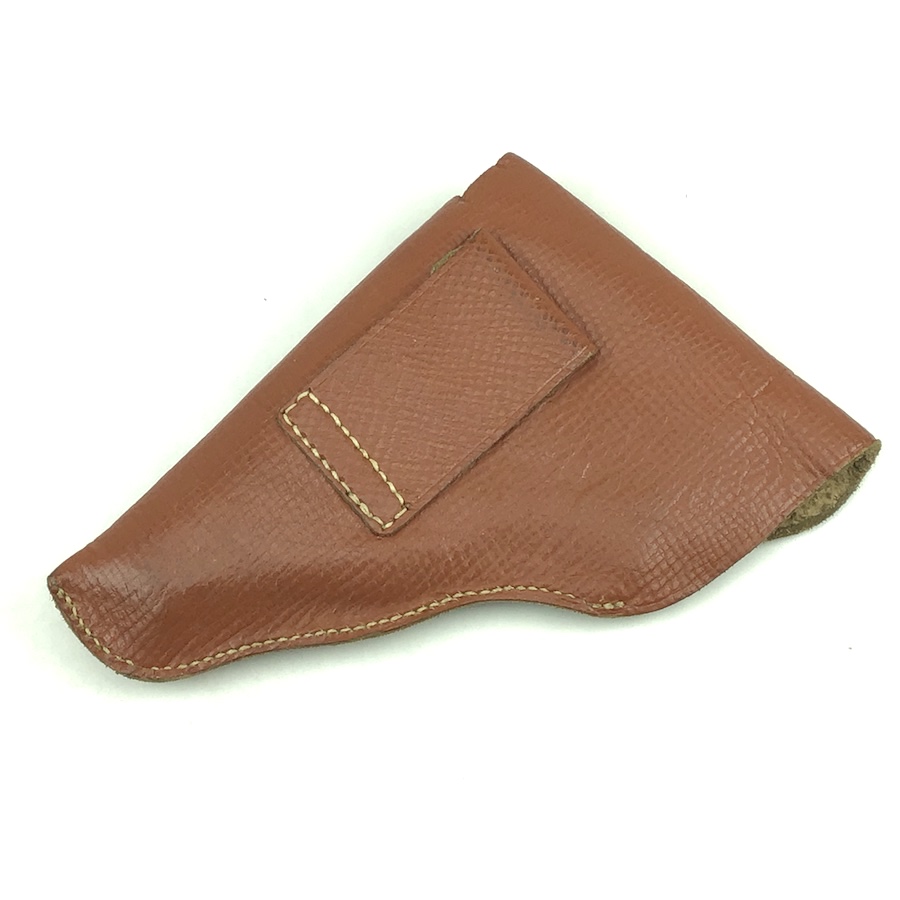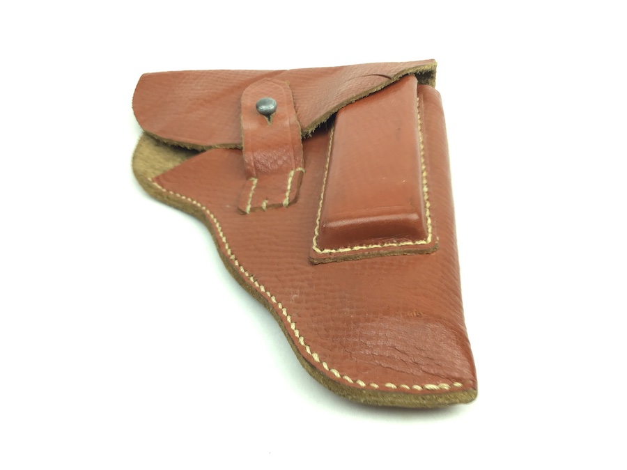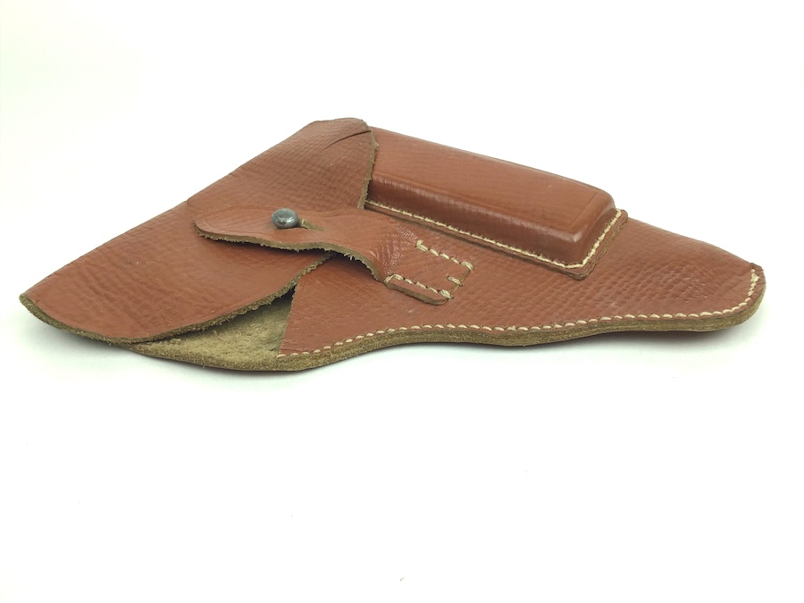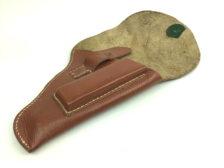 4/3/20 – German, late WWII style universal holster for a .32 caliber sized handgun. Thin, pliable leather with a nice looking grain. Typical end of war production, but still a nice clean piece. Excellent all original stitching. Appears that someone glued a green patch over the interior side of the knob.