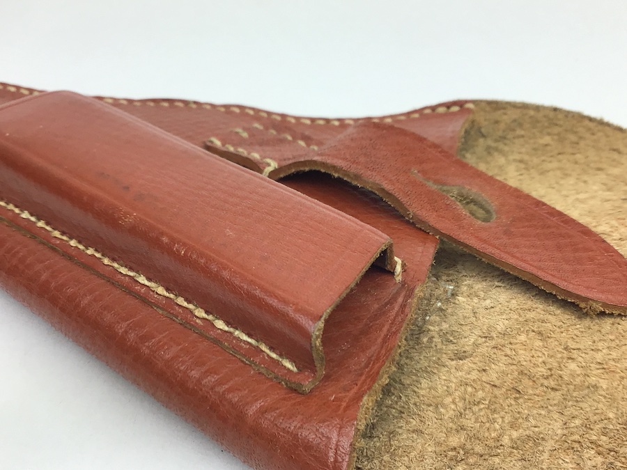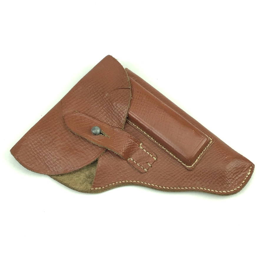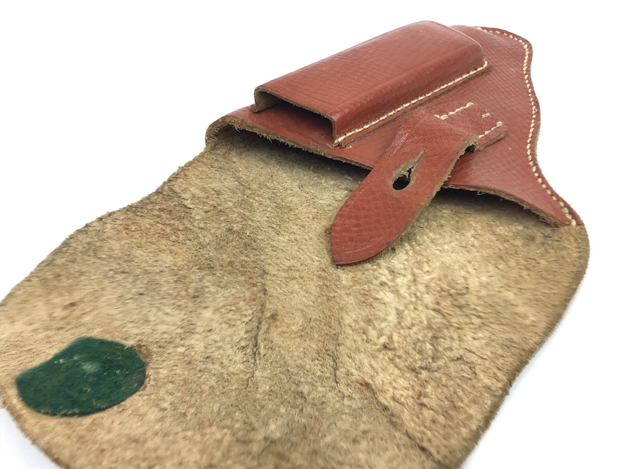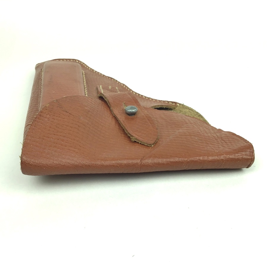 4/3/20 – German, late WWII style universal holster for a .32 caliber sized handgun. Thin, pliable leather with a nice looking grain. Typical end of war production, but still a nice clean piece. Excellent all original stitching. Appears that someone glued a green patch over the interior side of the knob.
