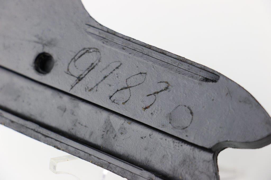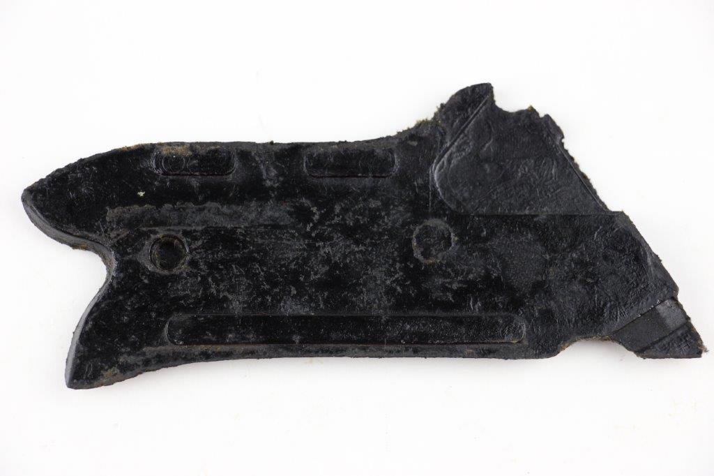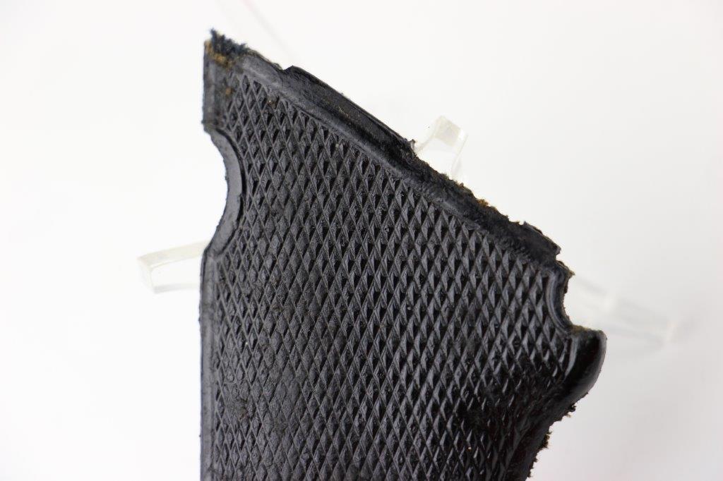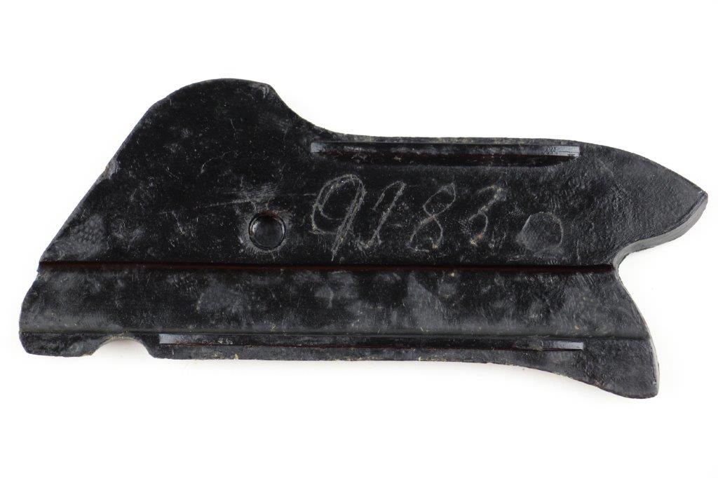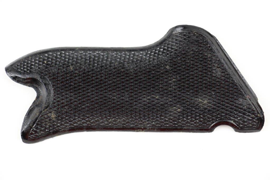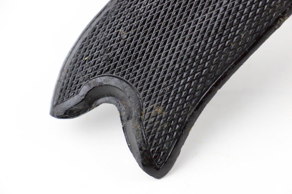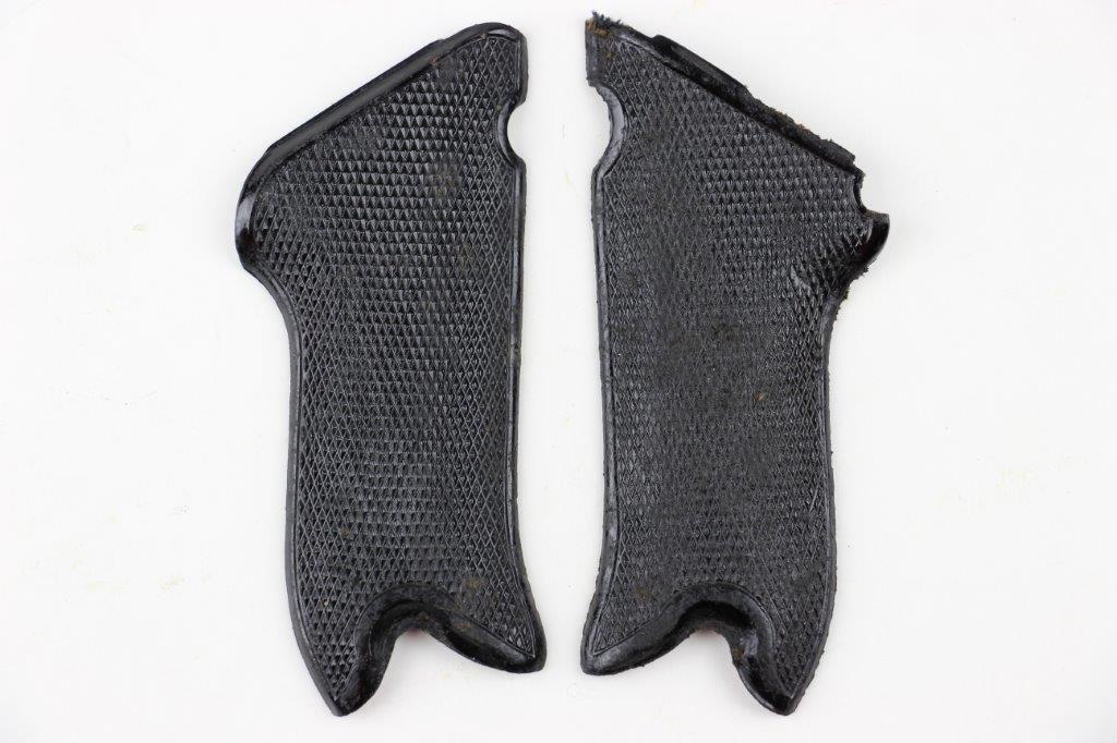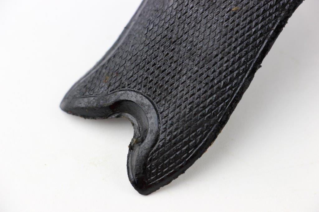 6/15/24 – This is an original, late Luger production pair of Black Widow Luger Grip Panels. The grips are made from bakelite and ersatz materials, as indicated by the textured appearance of the interior on these panels. The grips are in very good overall condition with some light surface wear from handling and use. The exterior of each panel has small areas of smoothness on the diamond pattern, but there’s no notable cracks or chips. The interior of the right panel has a serial number scratched into the grip, as shown. Despite the “honest wear” throughout these panels, these are original, late WW2 Luger production grips and highly collectible for byf 41 and byf 42 Lugers.