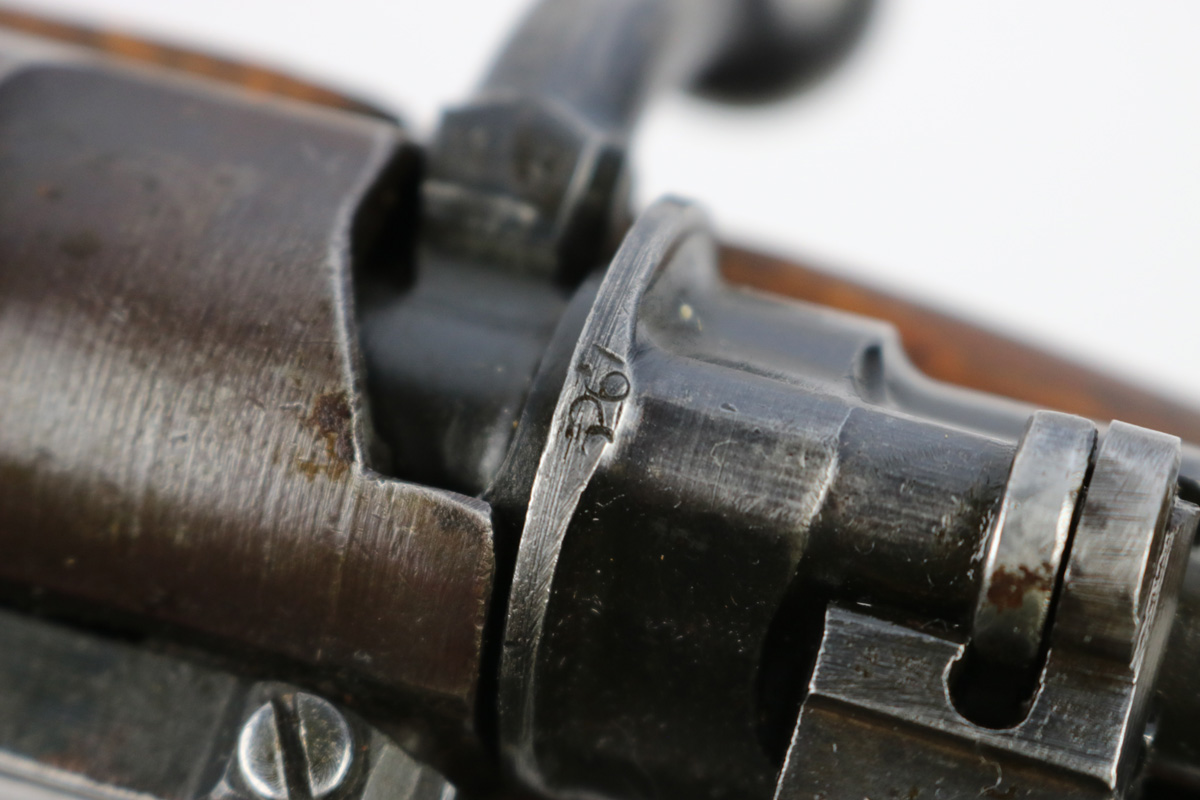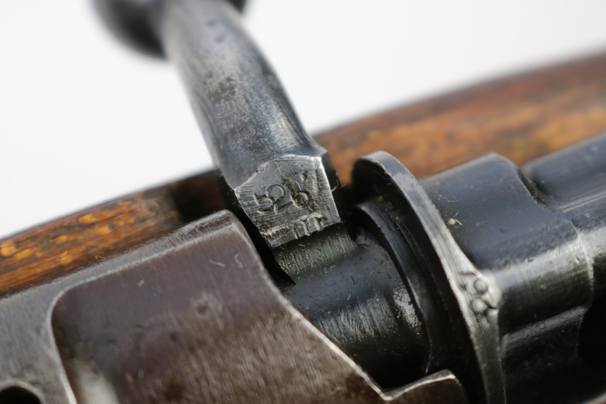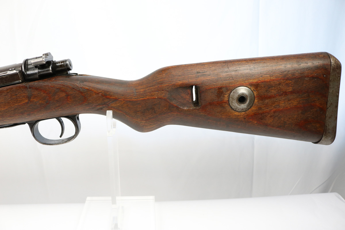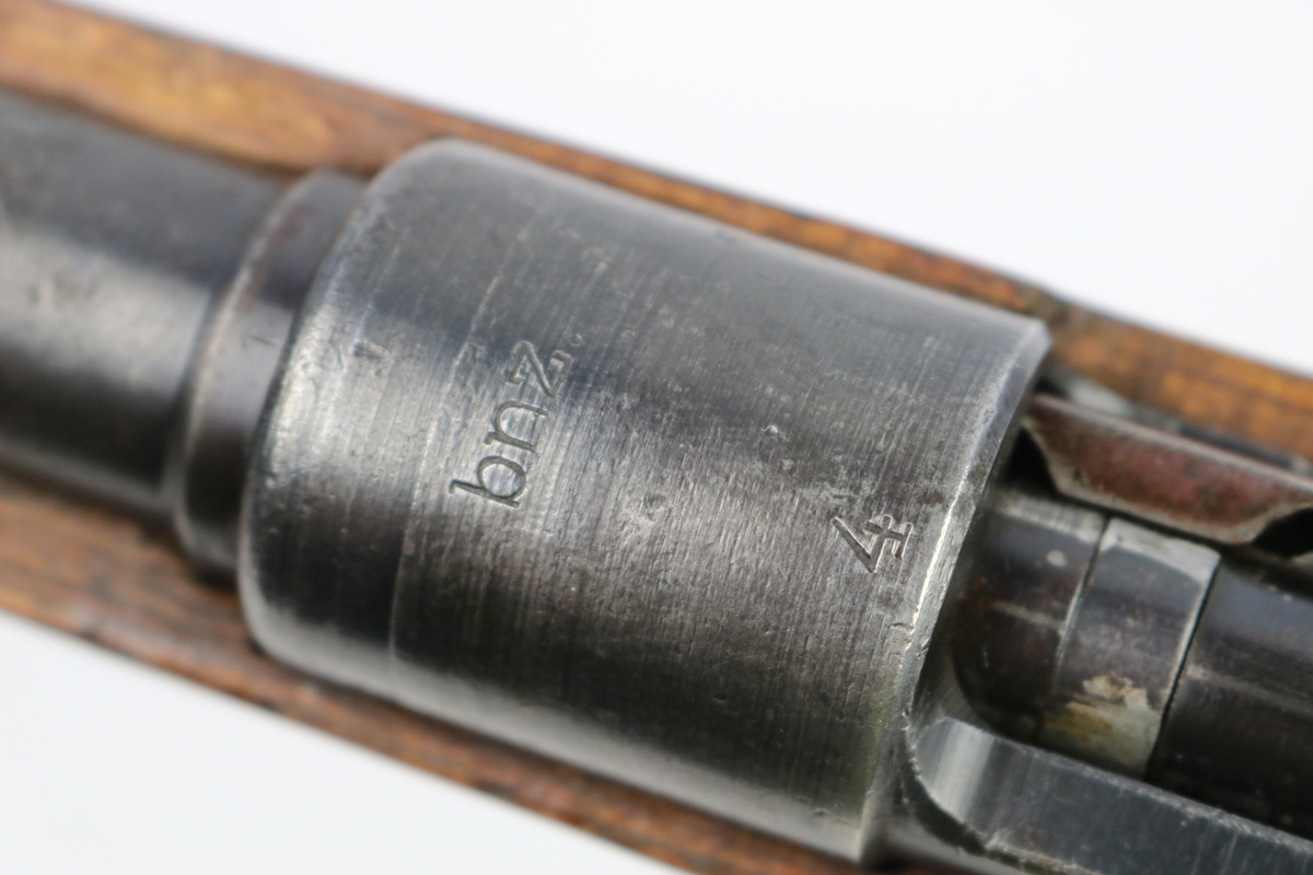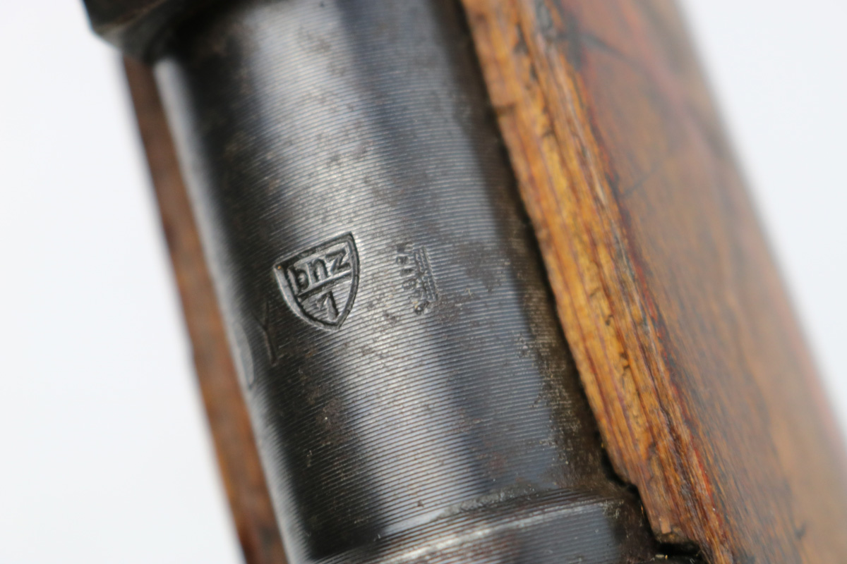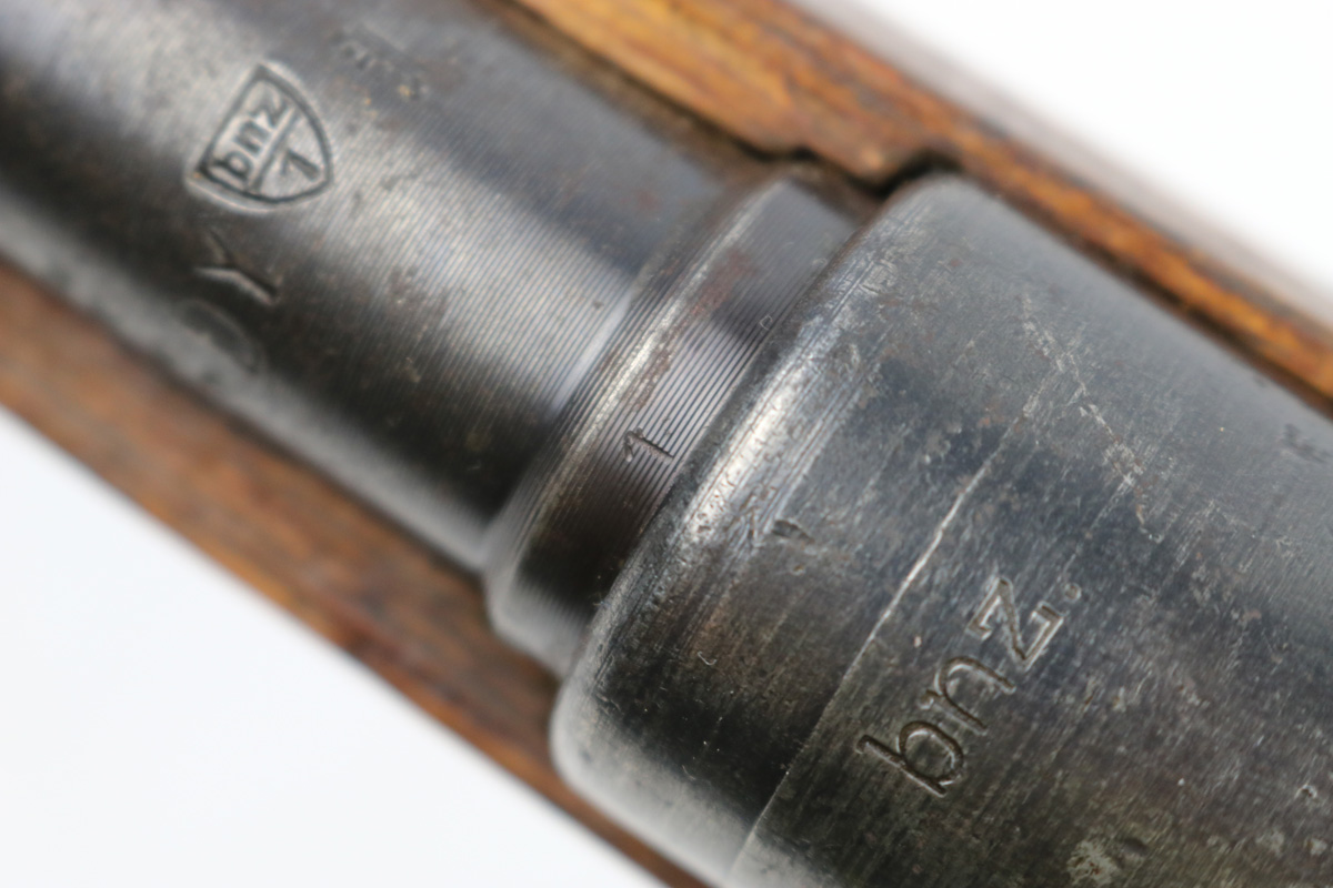 6/27/18 – This is a late WW2 production nazi K98 made in the Steyr factory. The rifle is stamped on the receiver “BNZ 4”. The single digit “4” is significant to show this was late 1944 production. This explains why the stock lacks waffen proofs or a serial number. Rifles produced hastily at the end of the war often times left the factory without all of the “official” or “proper” stamps. We guarantee this stock is original and period correct. The stock has some normal scuffing, and the underside has a smell “chew” mark. No major cracks or chips though. The metal has normal patina and finish loss in some places. Throughout the barrel is some light brown patina. Overall we call this normal and honest wear. The rifle is all matching and correct. The bore is fairly clean but there is some signs of use, residue, and wear within the grooves. Rifling is in tact. Guaranteed original and authentic.