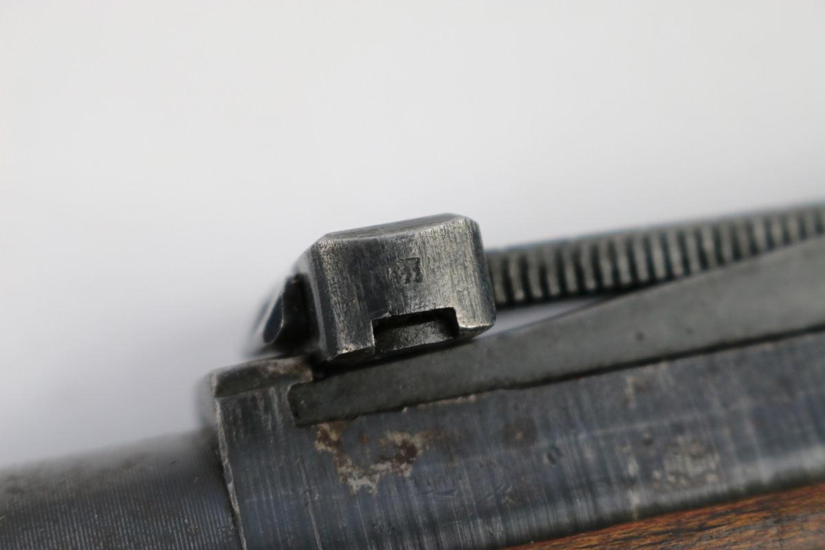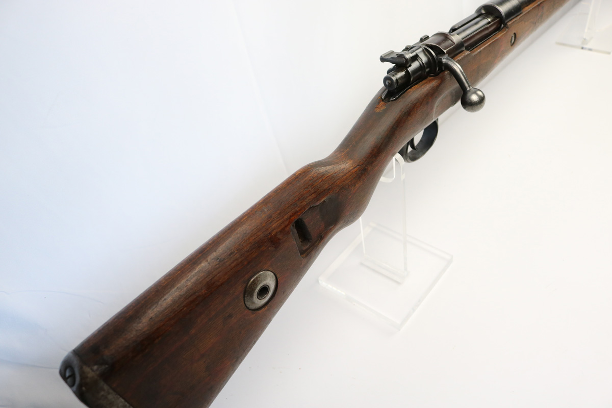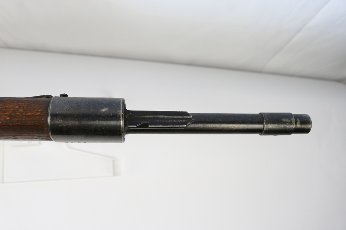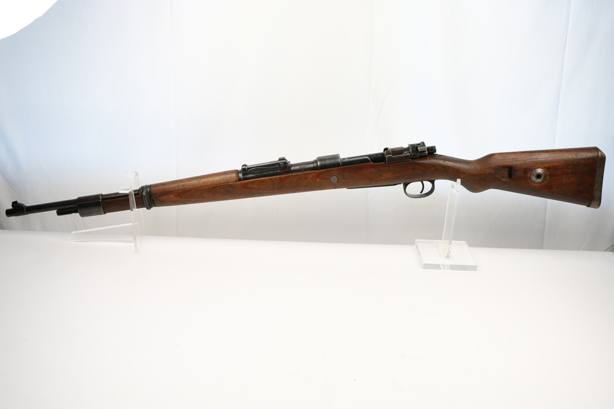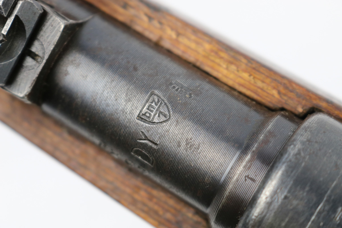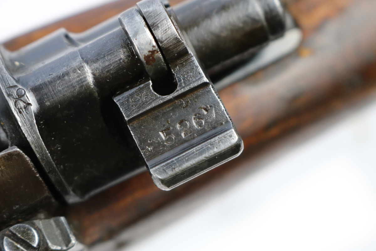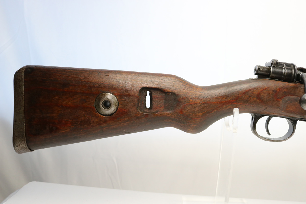 6/27/18 – This is a late WW2 production nazi K98 made in the Steyr factory. The rifle is stamped on the receiver “BNZ 4”. The single digit “4” is significant to show this was late 1944 production. This explains why the stock lacks waffen proofs or a serial number. Rifles produced hastily at the end of the war often times left the factory without all of the “official” or “proper” stamps. We guarantee this stock is original and period correct. The stock has some normal scuffing, and the underside has a smell “chew” mark. No major cracks or chips though. The metal has normal patina and finish loss in some places. Throughout the barrel is some light brown patina. Overall we call this normal and honest wear. The rifle is all matching and correct. The bore is fairly clean but there is some signs of use, residue, and wear within the grooves. Rifling is in tact. Guaranteed original and authentic.
