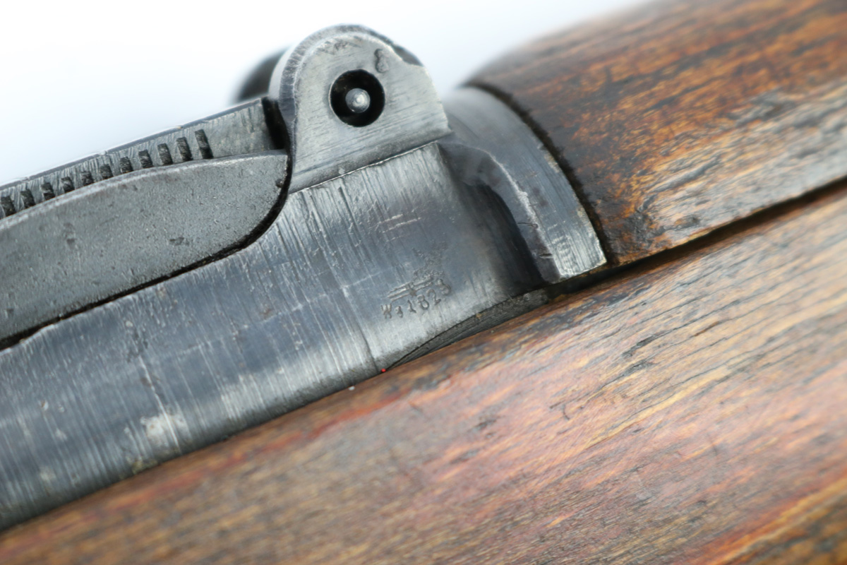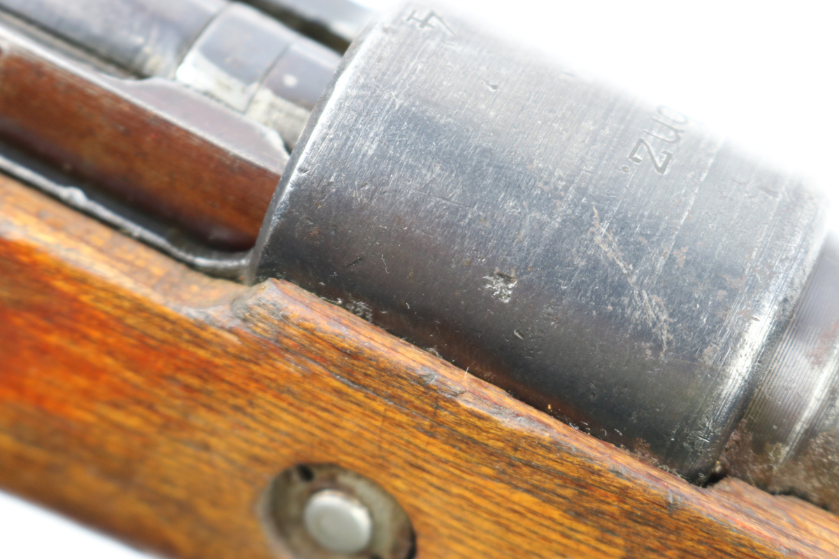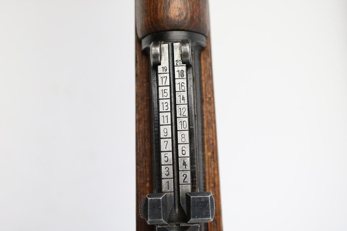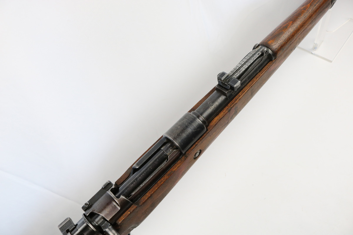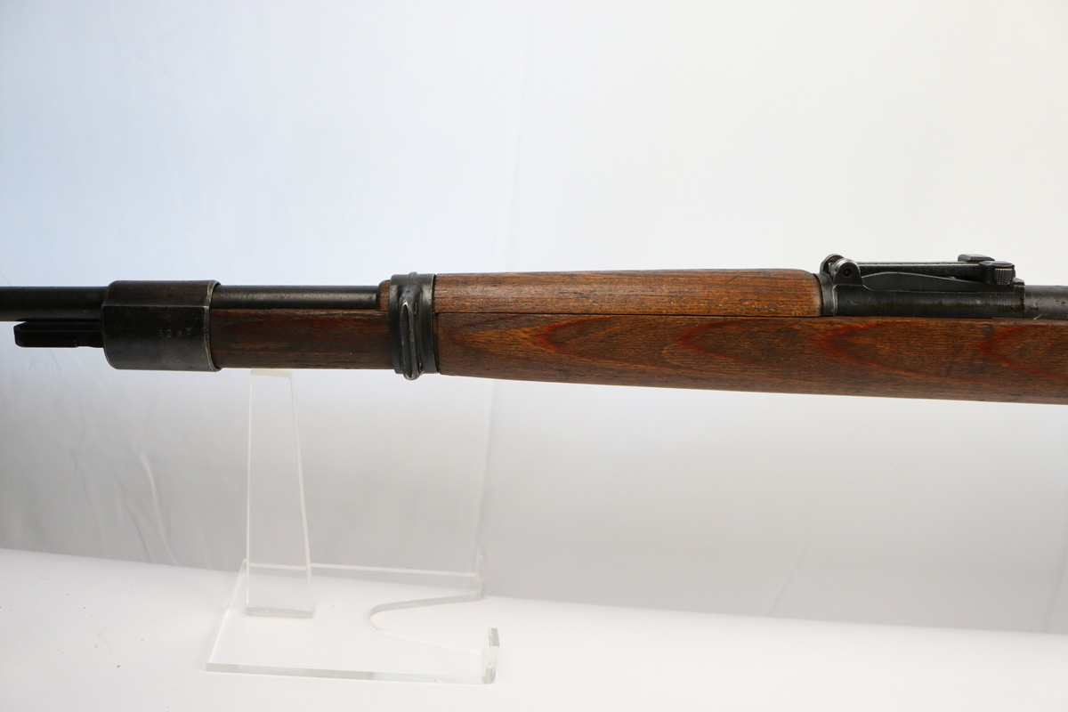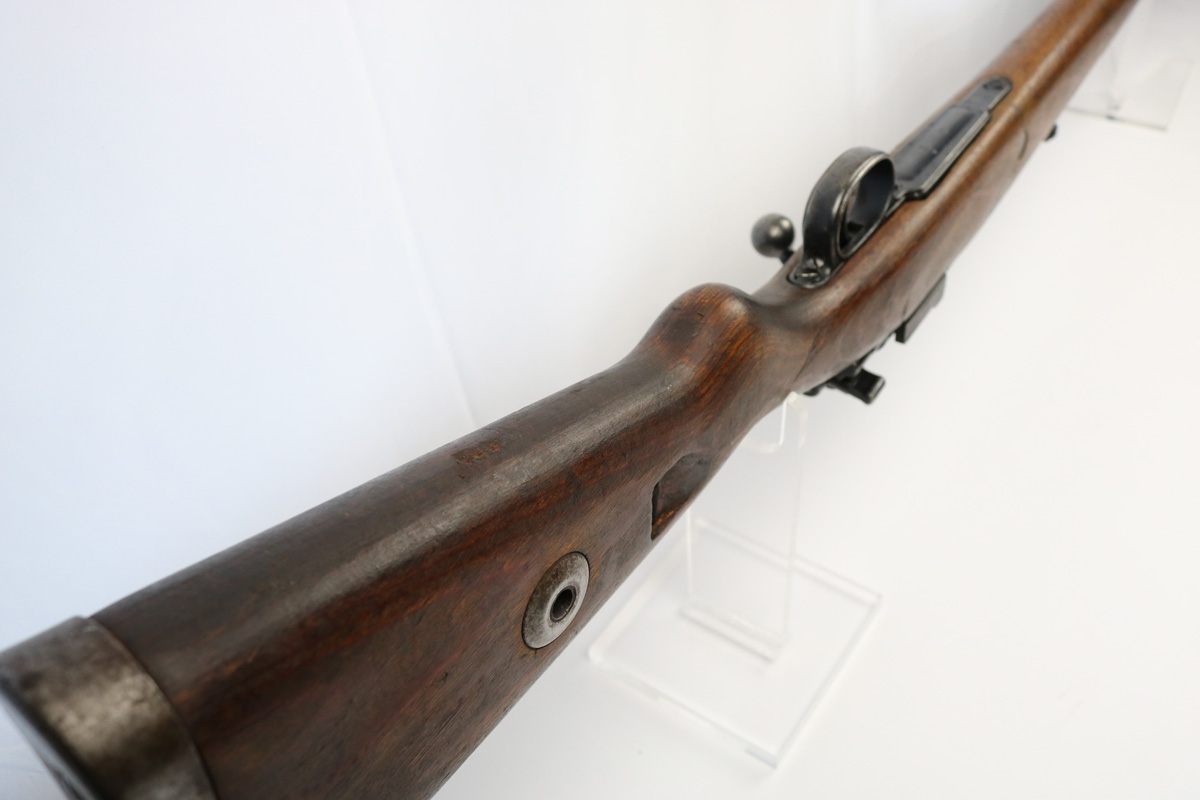 6/27/18 – This is a late WW2 production nazi K98 made in the Steyr factory. The rifle is stamped on the receiver “BNZ 4”. The single digit “4” is significant to show this was late 1944 production. This explains why the stock lacks waffen proofs or a serial number. Rifles produced hastily at the end of the war often times left the factory without all of the “official” or “proper” stamps. We guarantee this stock is original and period correct. The stock has some normal scuffing, and the underside has a smell “chew” mark. No major cracks or chips though. The metal has normal patina and finish loss in some places. Throughout the barrel is some light brown patina. Overall we call this normal and honest wear. The rifle is all matching and correct. The bore is fairly clean but there is some signs of use, residue, and wear within the grooves. Rifling is in tact. Guaranteed original and authentic.