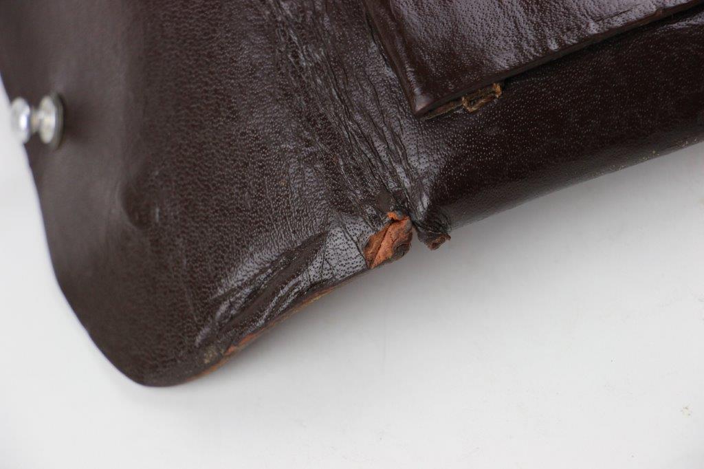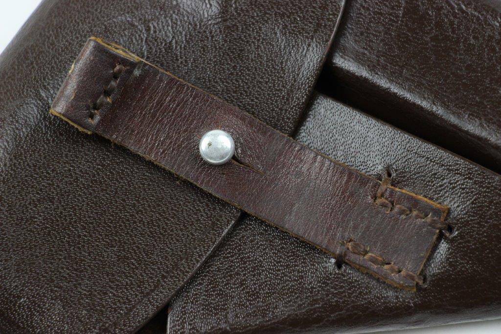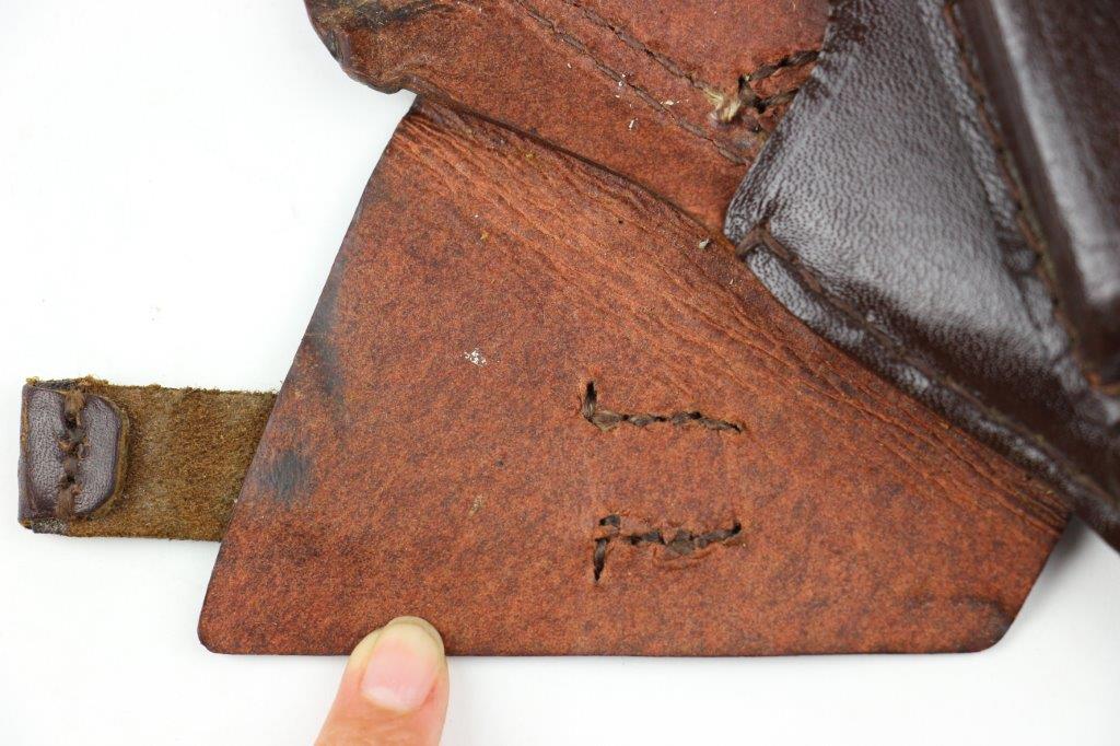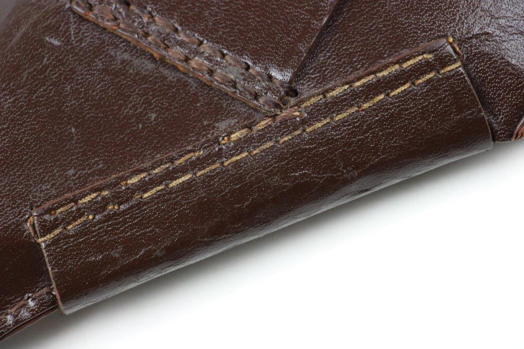 8/31/24 – This is a late WW2 production German 7.65mm holster. The holster is made from ersatz material, which is typically pressed paper and leftover scrap leather as the Germans were low on supplies at the end of the war. This example is in great condition with the only leather piece being the closure strap. The rest of the holster is dark chocolate brown colored and shows normal signs of previous use. No major flaws or issues and tight, original stitching throughout. Measures about 18cm long and 12.2cm wide when closed.