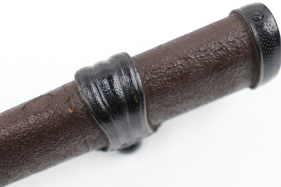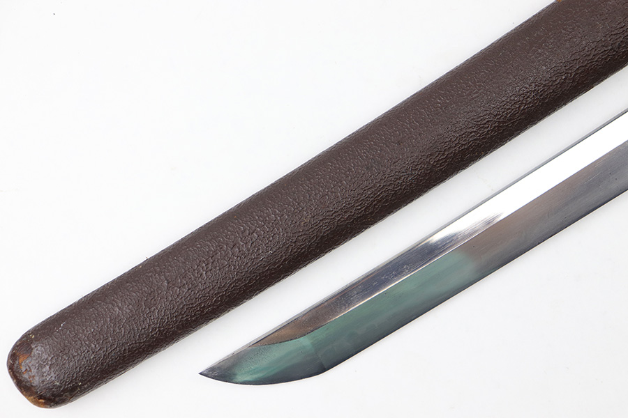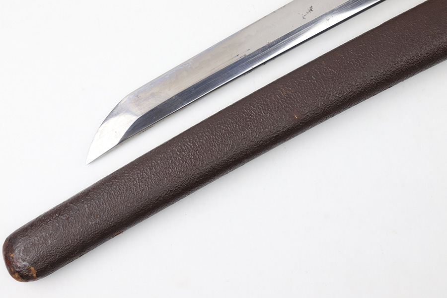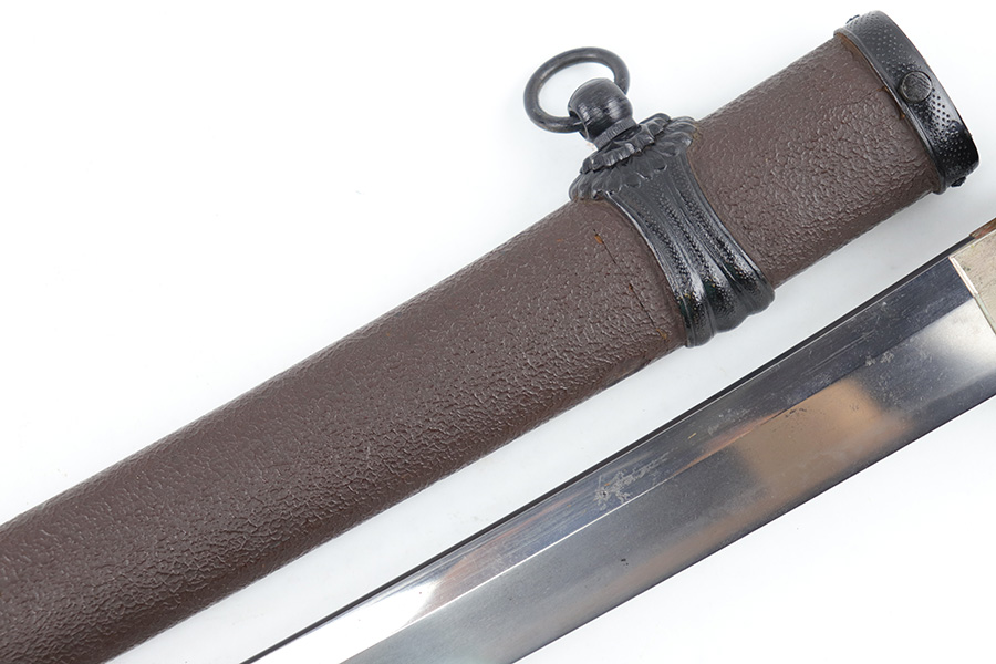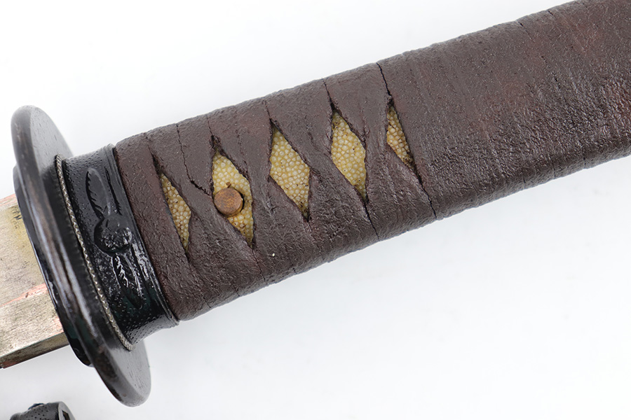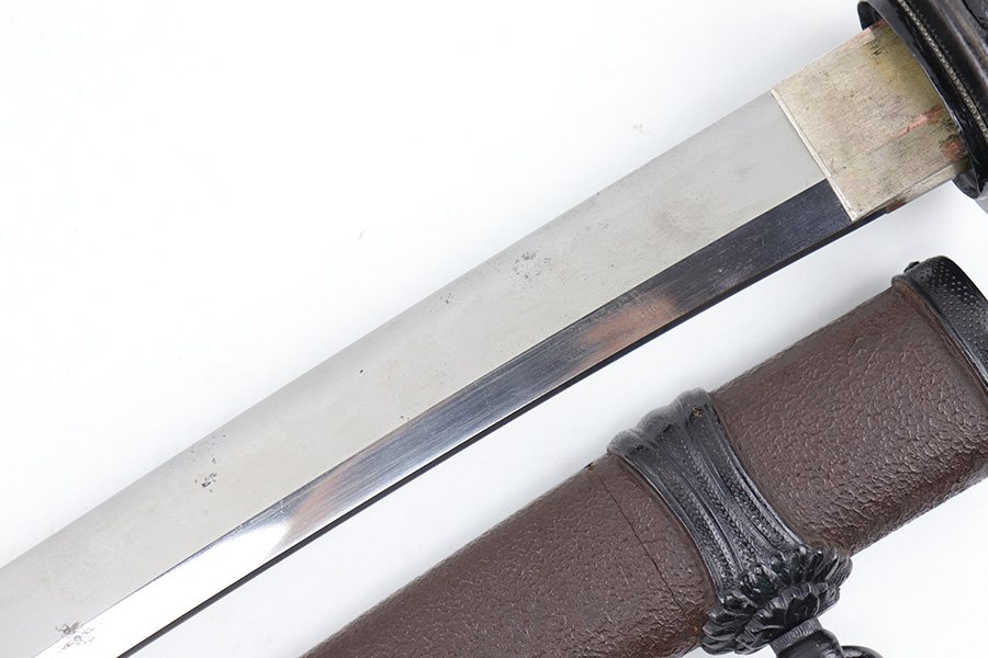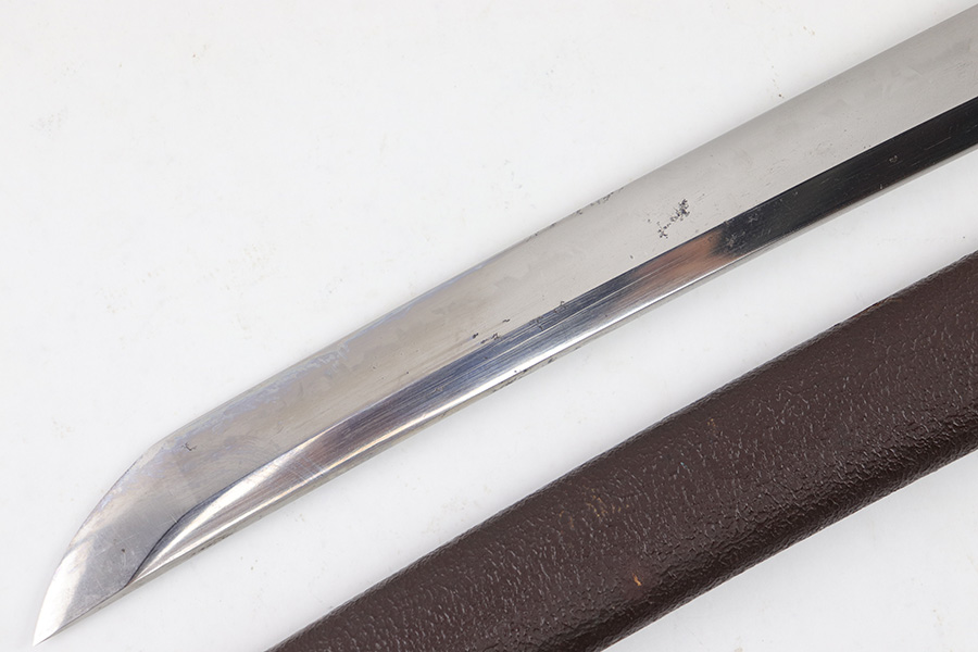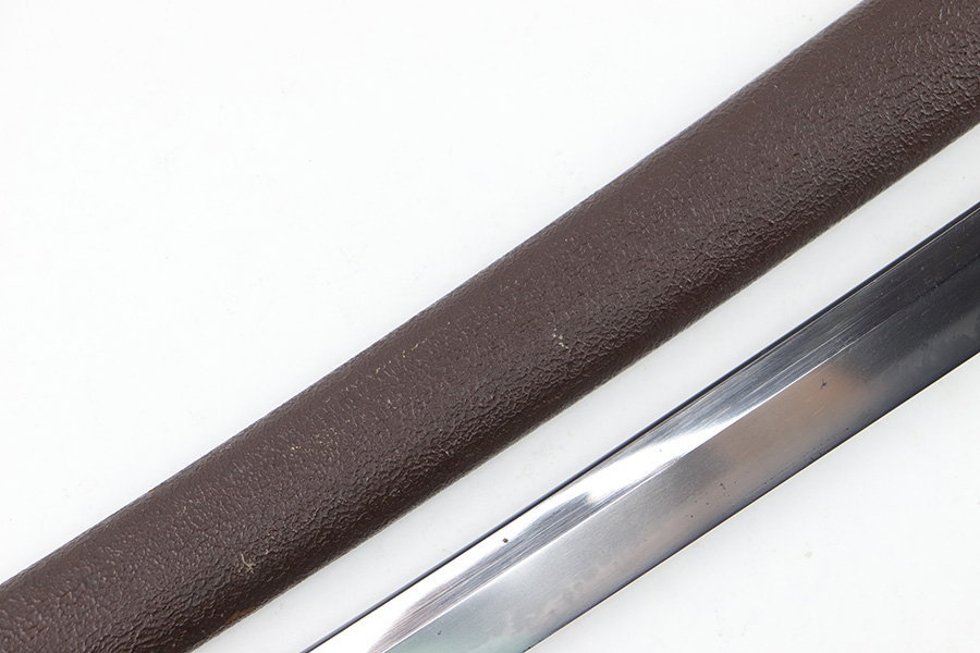 6/1/23 – This is a WW2 production handmade Type 98 Army Officer Sword. The sword tang has a star stamp, which denotes membership to the Rikungun Jumei Tosho, which is an army approved swordsmith guild that made handmade blades for the war effort during WW2. The army provided steel and charcoal to these smiths to make the blades. This example has late war fittings and a late war scabbard, both are in excellent condition as shown, although the metal fittings are missing from the base of the scabbard as shown. Known as a Type 3 sword. The blade has dark speckling oxidation scattered throughout the finish. Some of the discoloration is mild and light, but there are a few areas of darker, deeper surface wear. The blade also has some light surface scratches and scabbard rub wear on each side. The tempered edge is faint but still visible. No chips or nicks along the edge. Comes with a Junior Officer’s tassel as well.