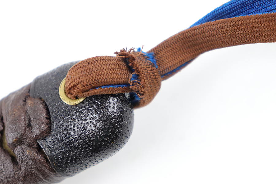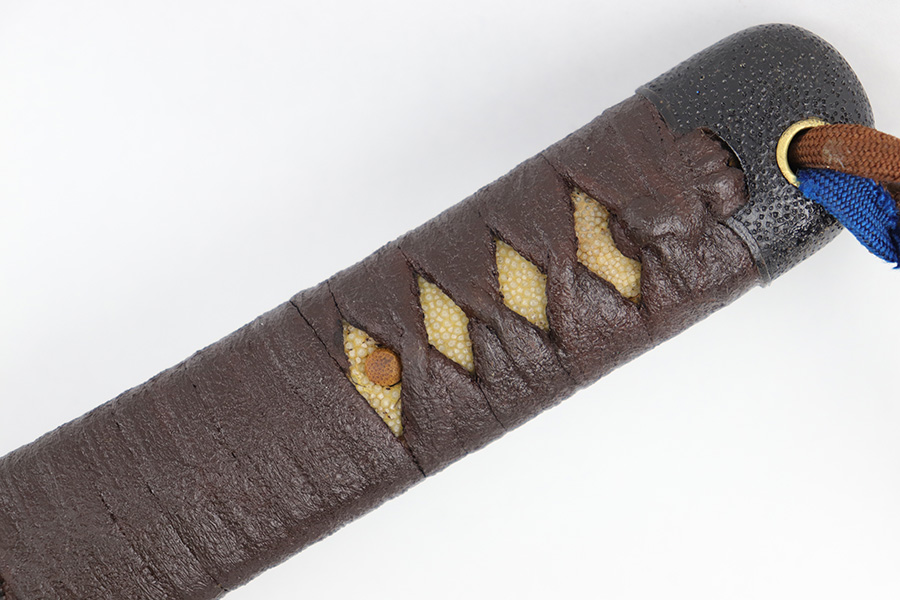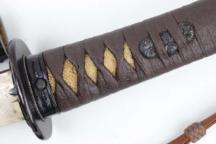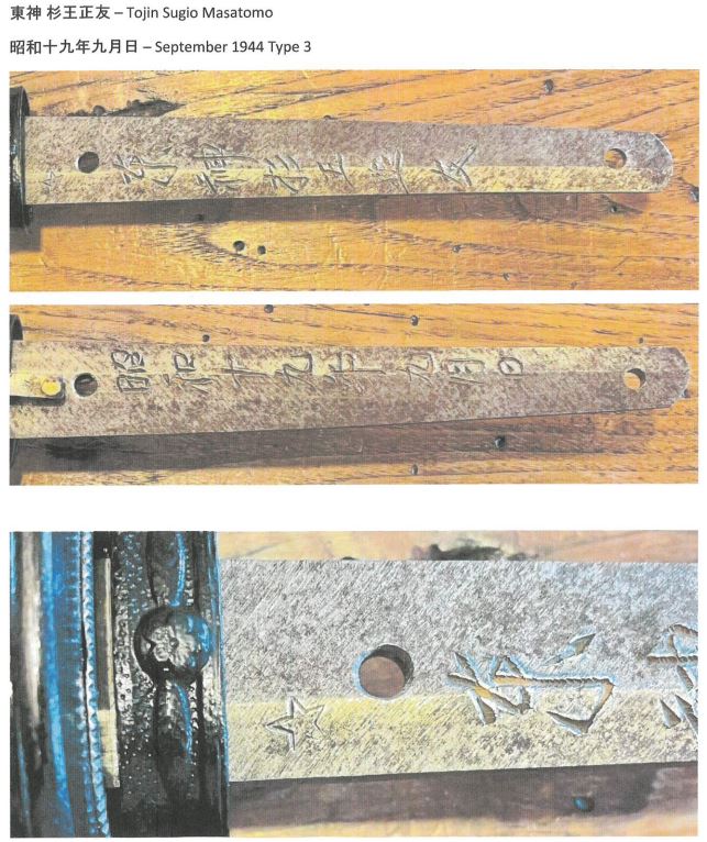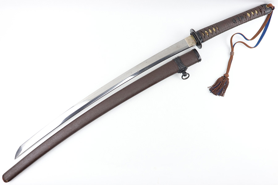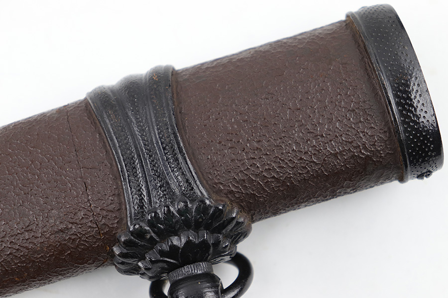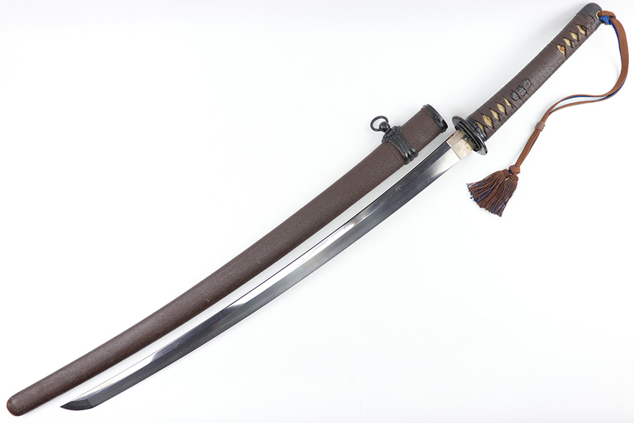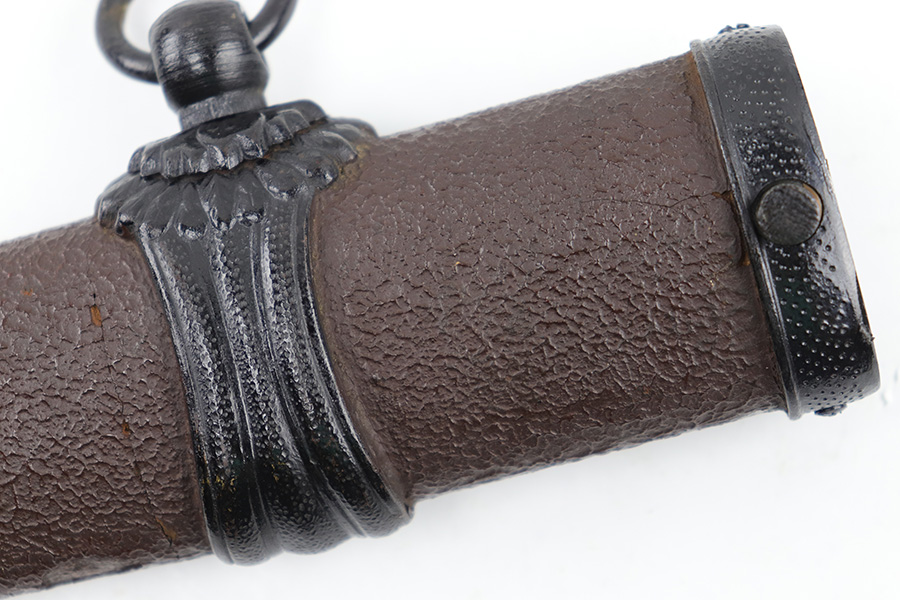 6/1/23 – This is a WW2 production handmade Type 98 Army Officer Sword. The sword tang has a star stamp, which denotes membership to the Rikungun Jumei Tosho, which is an army approved swordsmith guild that made handmade blades for the war effort during WW2. The army provided steel and charcoal to these smiths to make the blades. This example has late war fittings and a late war scabbard, both are in excellent condition as shown, although the metal fittings are missing from the base of the scabbard as shown. Known as a Type 3 sword. The blade has dark speckling oxidation scattered throughout the finish. Some of the discoloration is mild and light, but there are a few areas of darker, deeper surface wear. The blade also has some light surface scratches and scabbard rub wear on each side. The tempered edge is faint but still visible. No chips or nicks along the edge. Comes with a Junior Officer’s tassel as well.