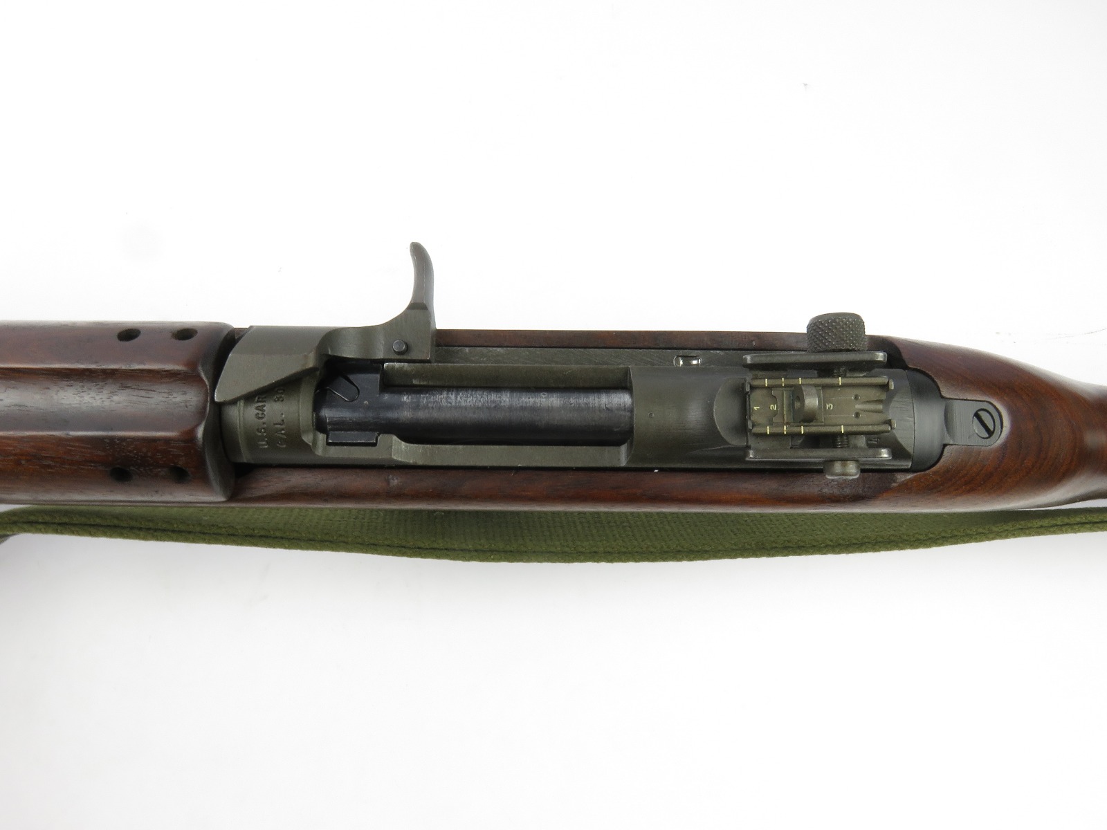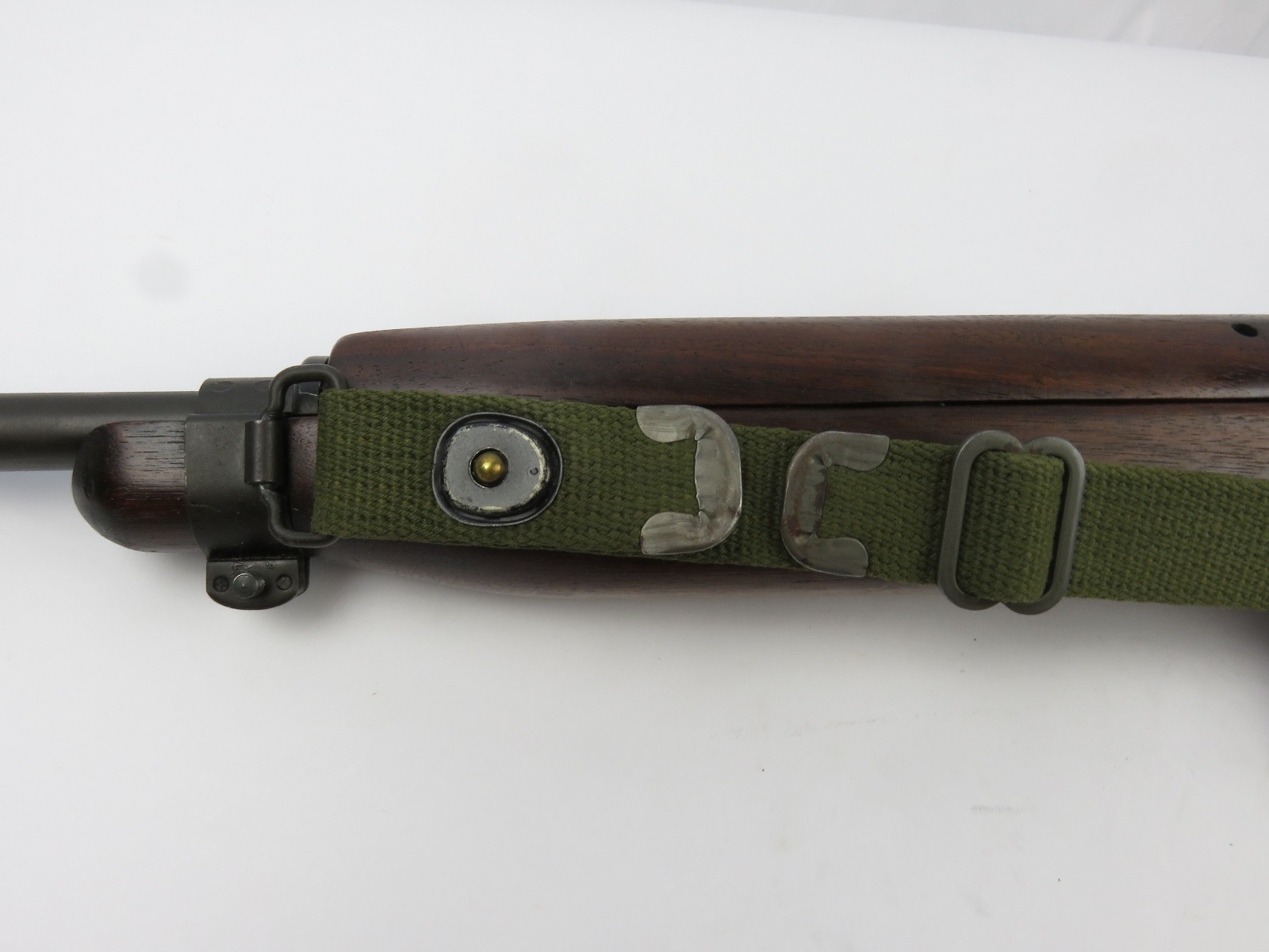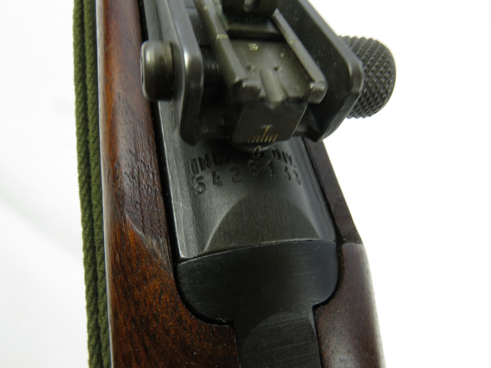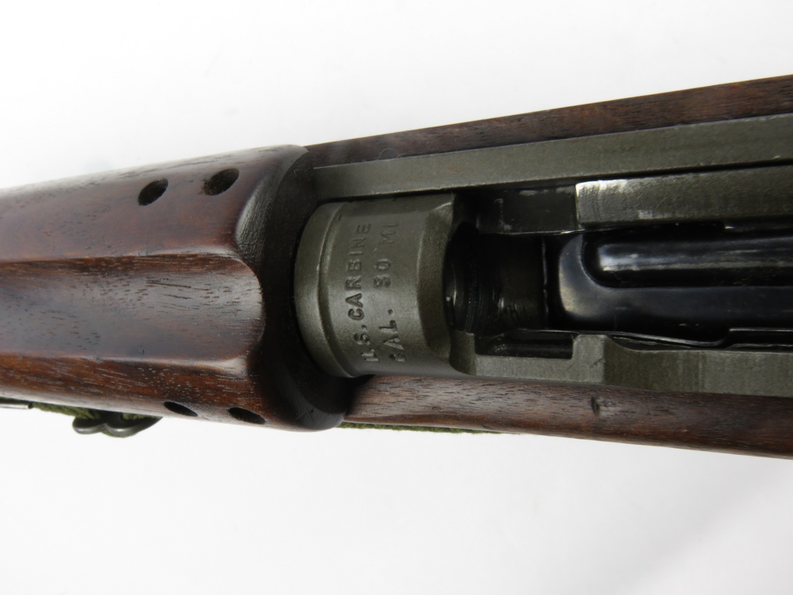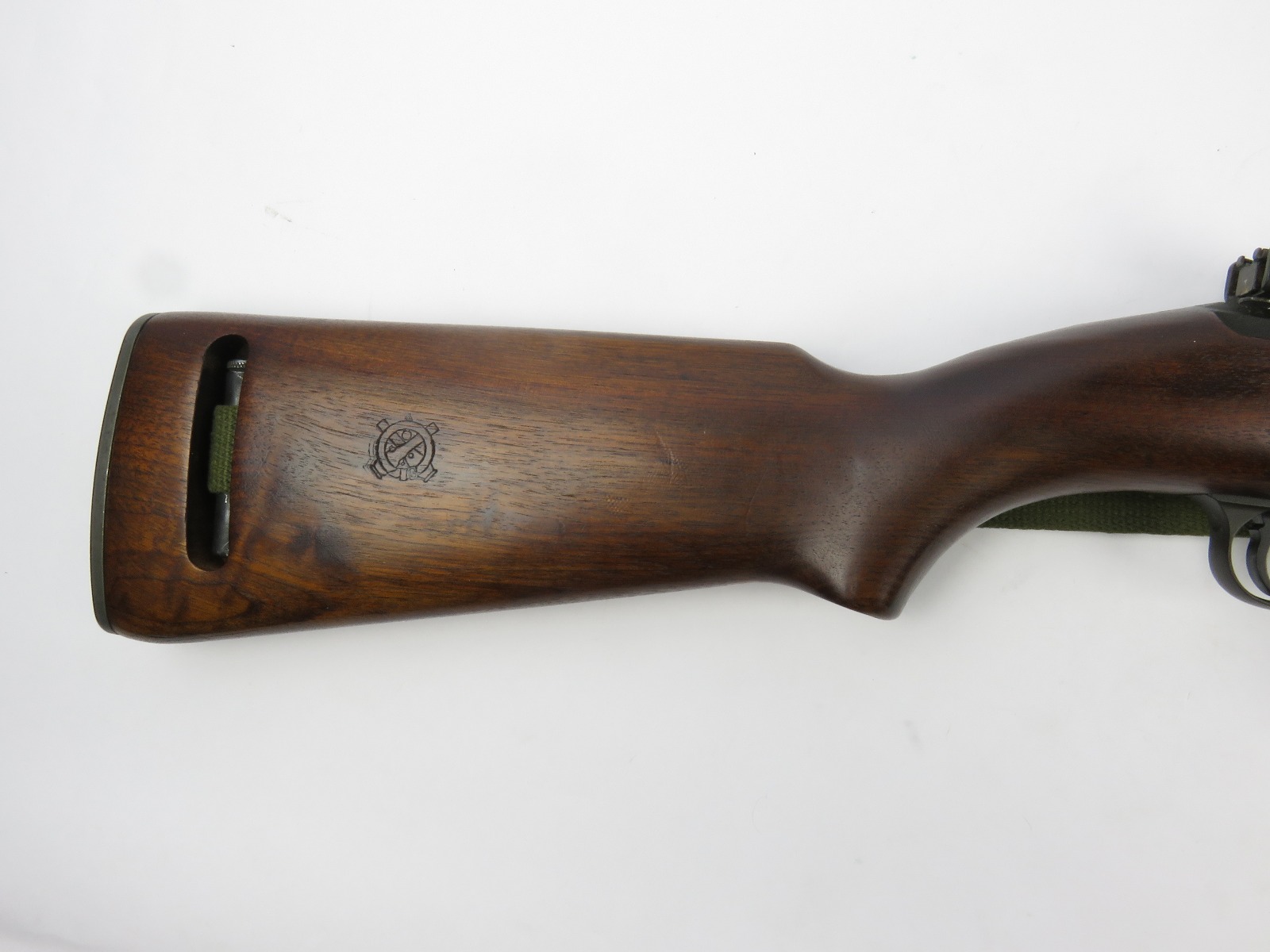 7/31/17 – This is an original, late WW2 production M1 Carbine Rifle. The rifle is in excellent original condition with very nice metal and wood. The bore is beautiful and shiny, we rate at a 10 out of 10! The barrel is maker stamped and dated 1944. There is a small amount very light brown patina on the barrel. The metal on and around the receiver is excellent as well. The rear sight is a correct late war adjustable sight. The wood is excellent with no signs of sanding. The interior of the strap well has a maker stamp, and the reverse side of the stock has a strong cartouche. This looks like a slight double stamp if you look closely. The shoulder strap is period correct and original as well. Guaranteed original and authentic.