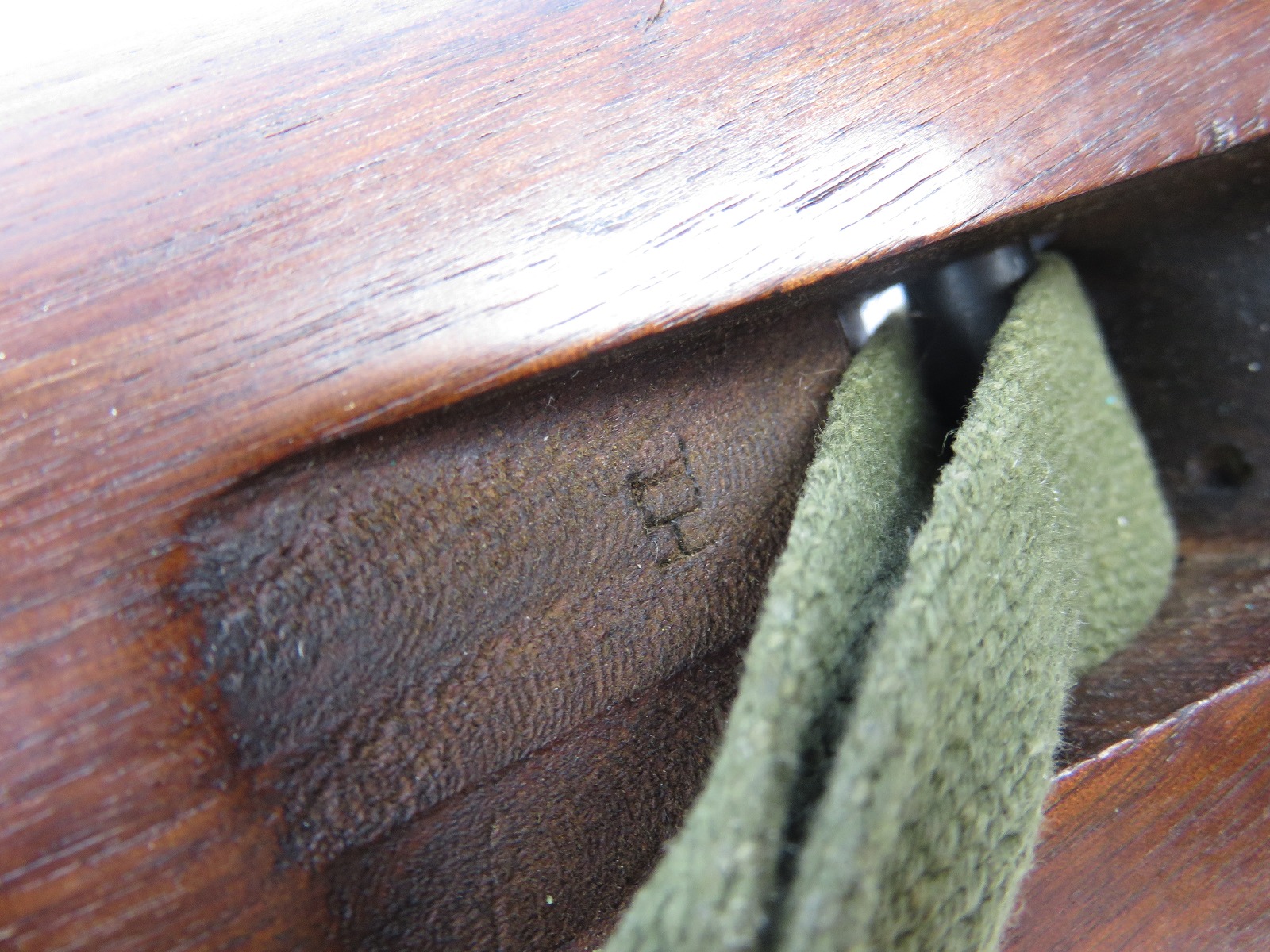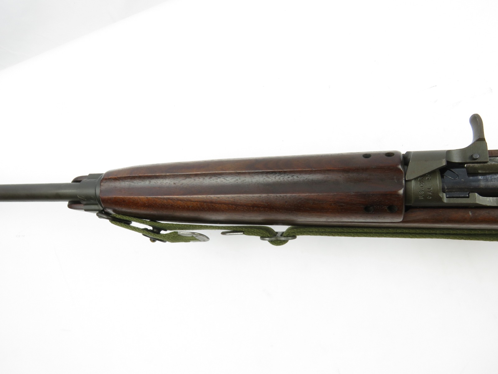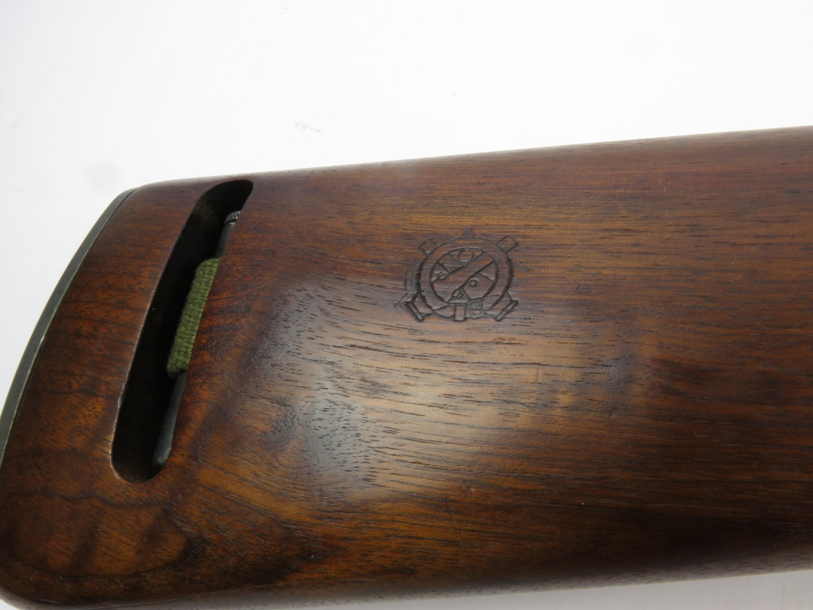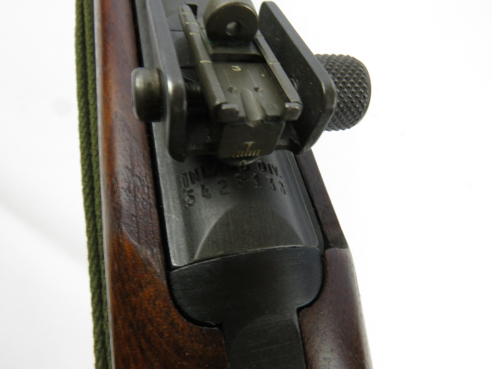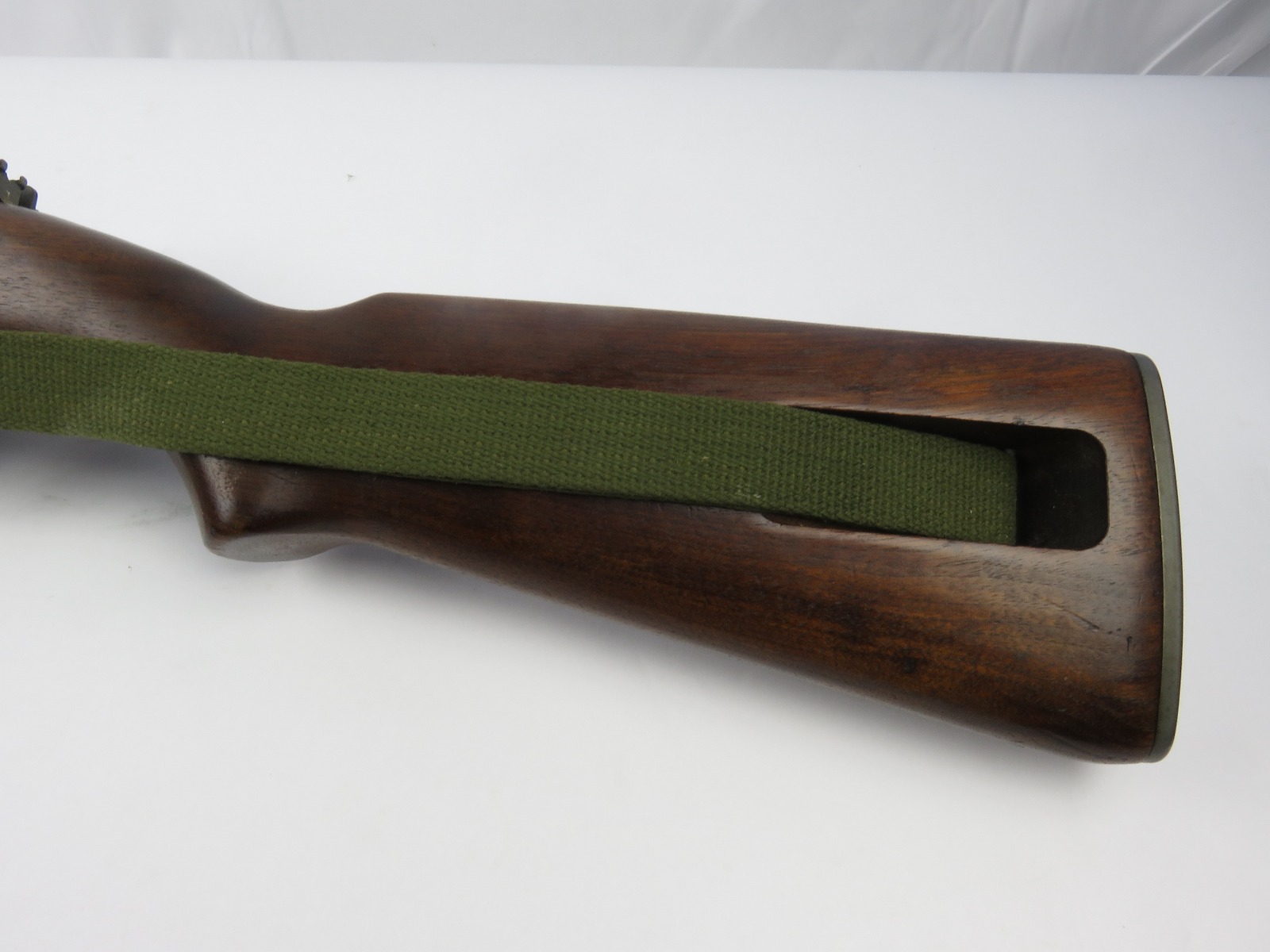 7/31/17 – This is an original, late WW2 production M1 Carbine Rifle. The rifle is in excellent original condition with very nice metal and wood. The bore is beautiful and shiny, we rate at a 10 out of 10! The barrel is maker stamped and dated 1944. There is a small amount very light brown patina on the barrel. The metal on and around the receiver is excellent as well. The rear sight is a correct late war adjustable sight. The wood is excellent with no signs of sanding. The interior of the strap well has a maker stamp, and the reverse side of the stock has a strong cartouche. This looks like a slight double stamp if you look closely. The shoulder strap is period correct and original as well. Guaranteed original and authentic.