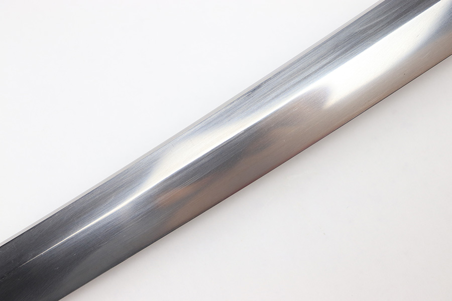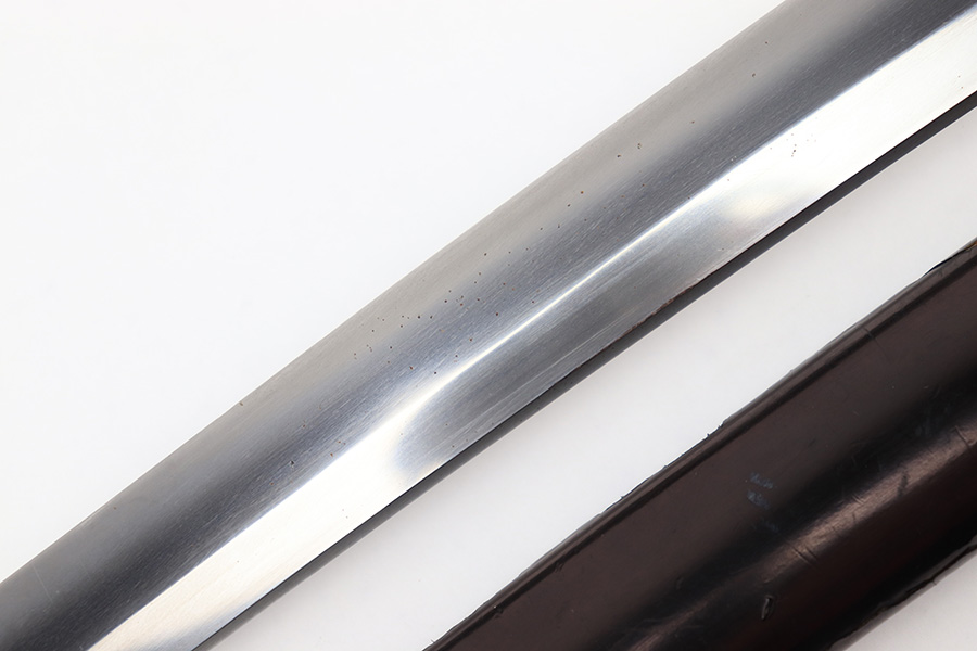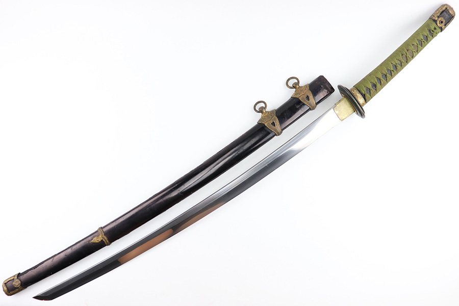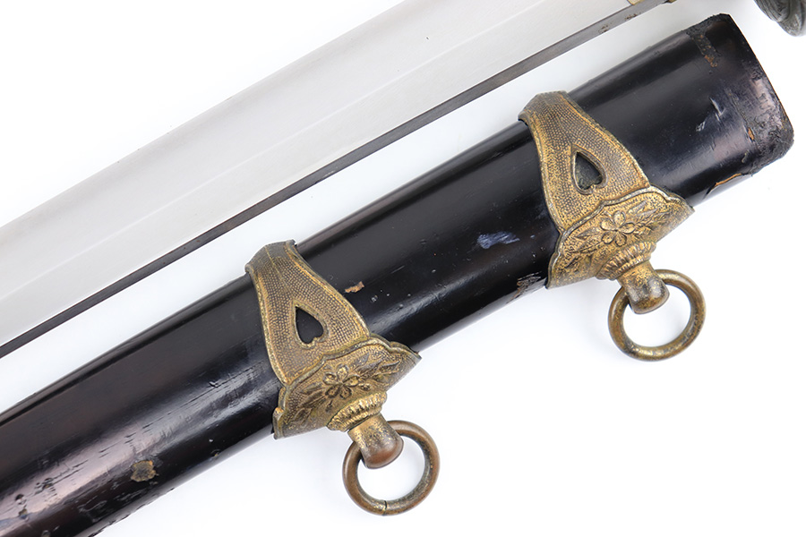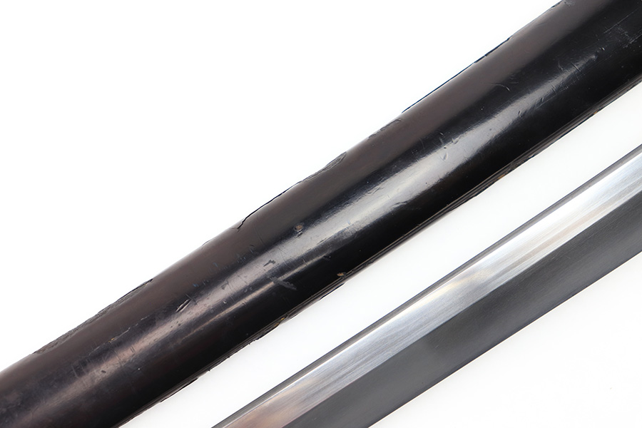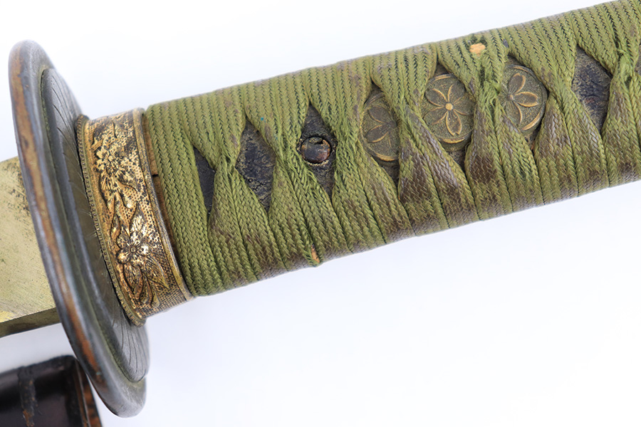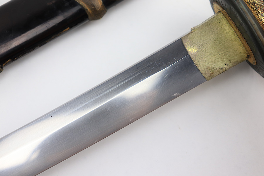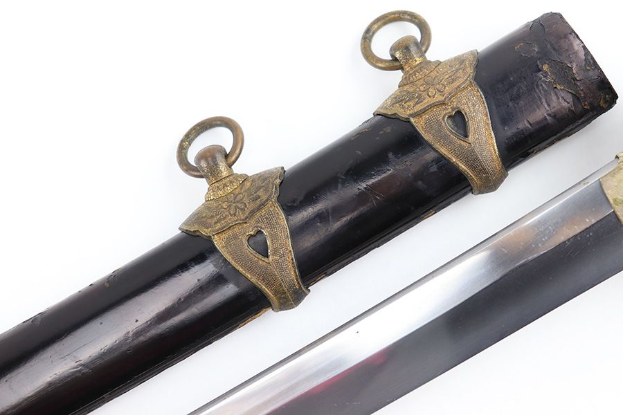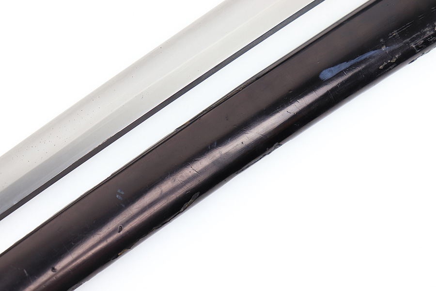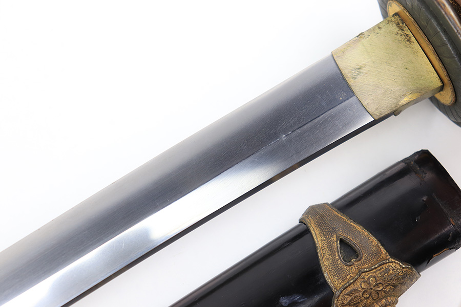 8/4/23 – This is a late WW2 production Naval Officer T97 Sword. The sword blade is naval arsenal stamped on the tang, indicating the blade as factory-made. The blade is in very good condition with some light signs of polishing throughout and a uniform tempered edge. There are a few light surface scratches throughout the blade, but this is mild overall. The fittings are standard late war style, and the handle has normal signs of handling and aging. The scabbard is cracking and slightly chipped at the mouth and along the spine, with small areas of surface black lacquered finish chipped off. The scabbard is still intact however and fits nicely.