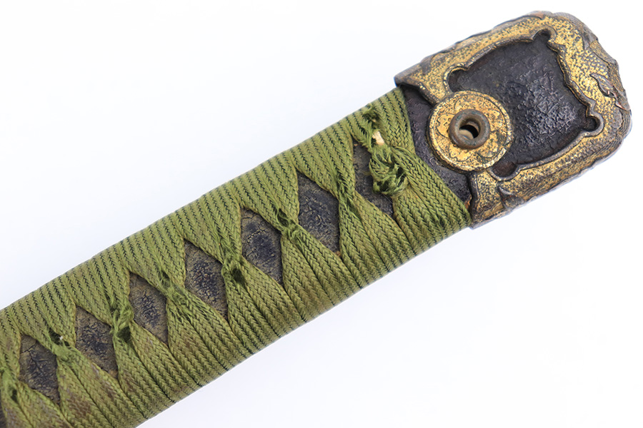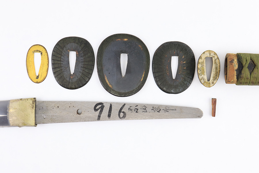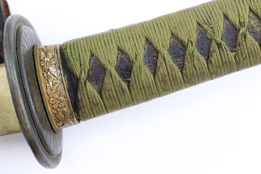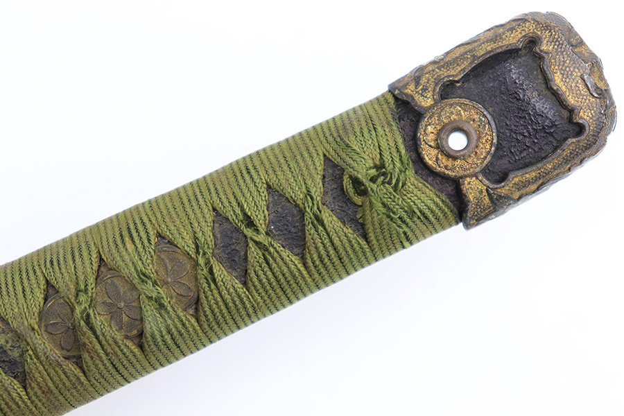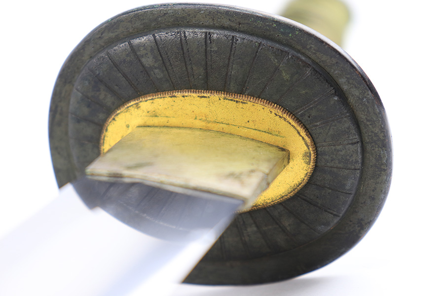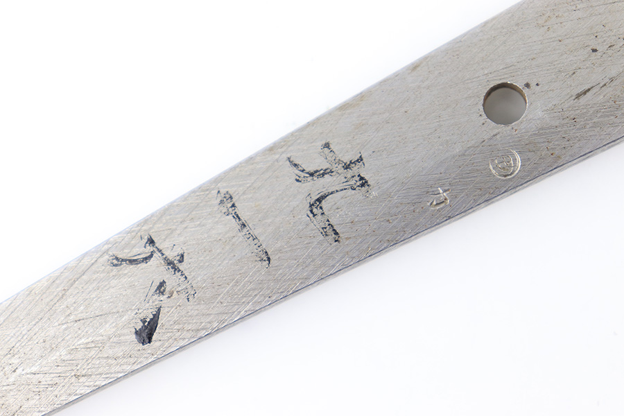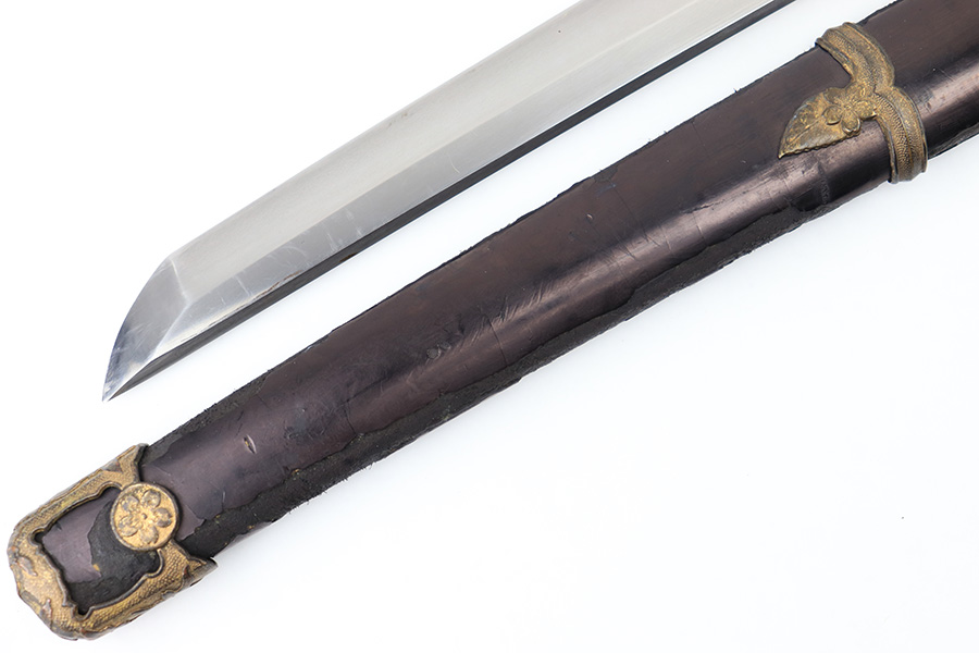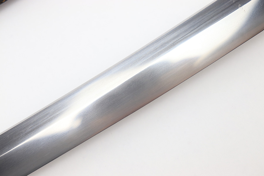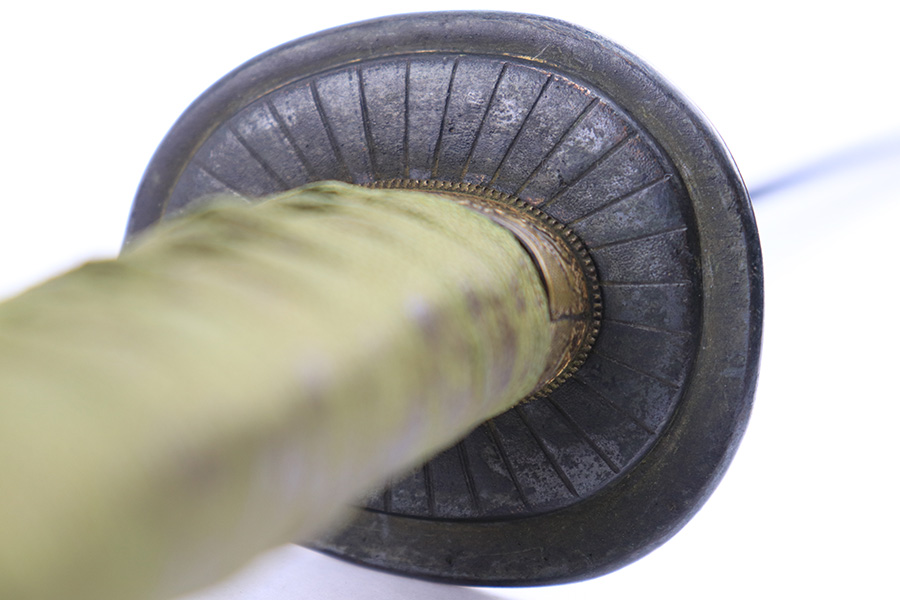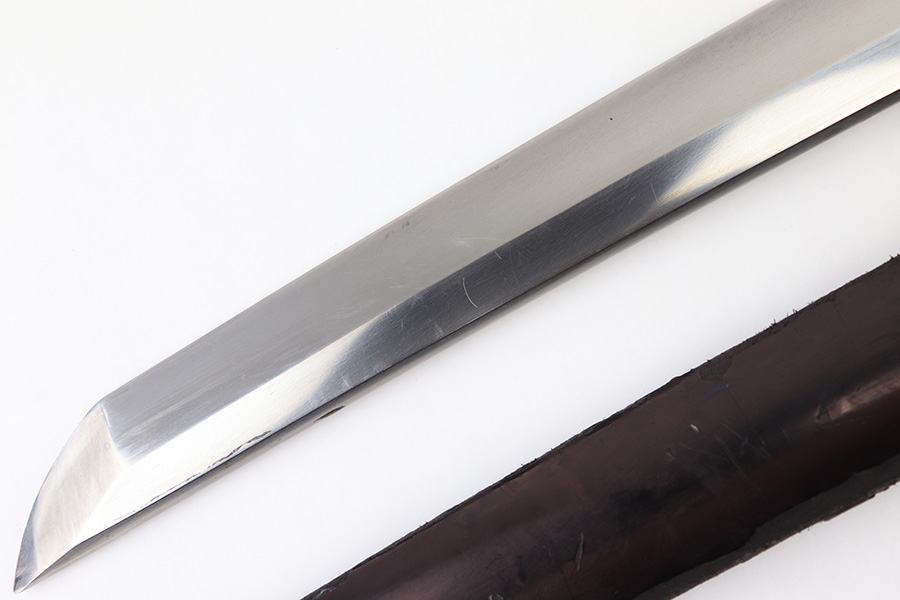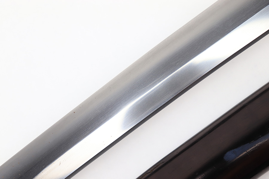8/4/23 – This is a late WW2 production Naval Officer T97 Sword. The sword blade is naval arsenal stamped on the tang, indicating the blade as factory-made. The blade is in very good condition with some light signs of polishing throughout and a uniform tempered edge. There are a few light surface scratches throughout the blade, but this is mild overall. The fittings are standard late war style, and the handle has normal signs of handling and aging. The scabbard is cracking and slightly chipped at the mouth and along the spine, with small areas of surface black lacquered finish chipped off. The scabbard is still intact however and fits nicely.