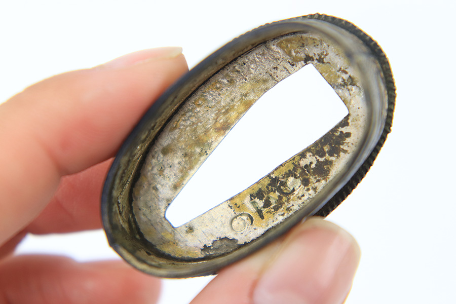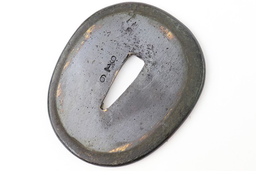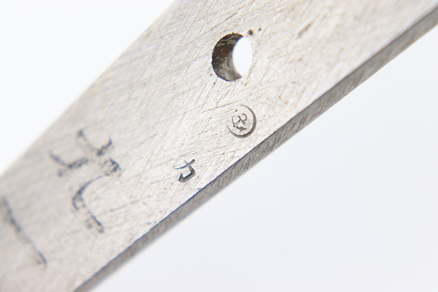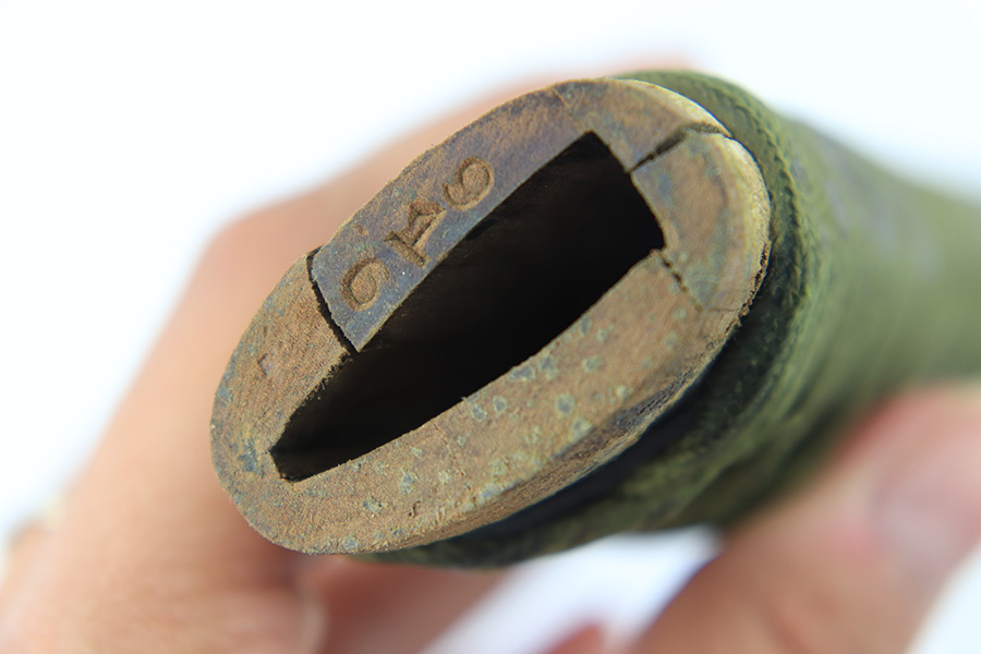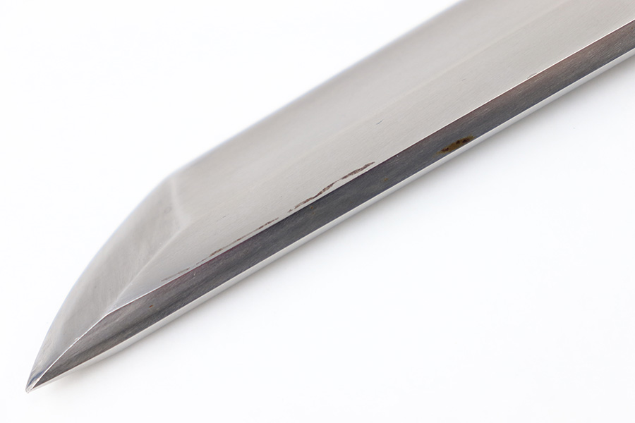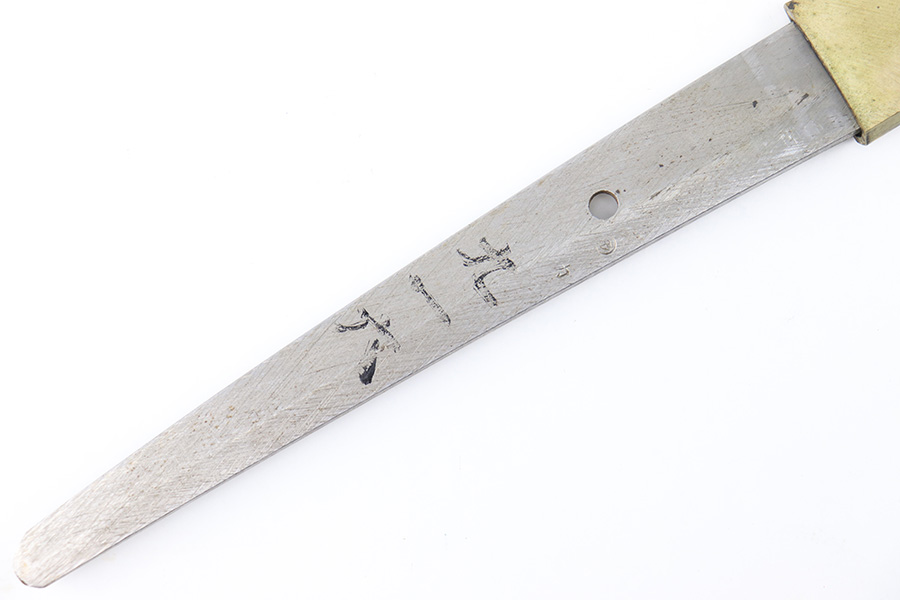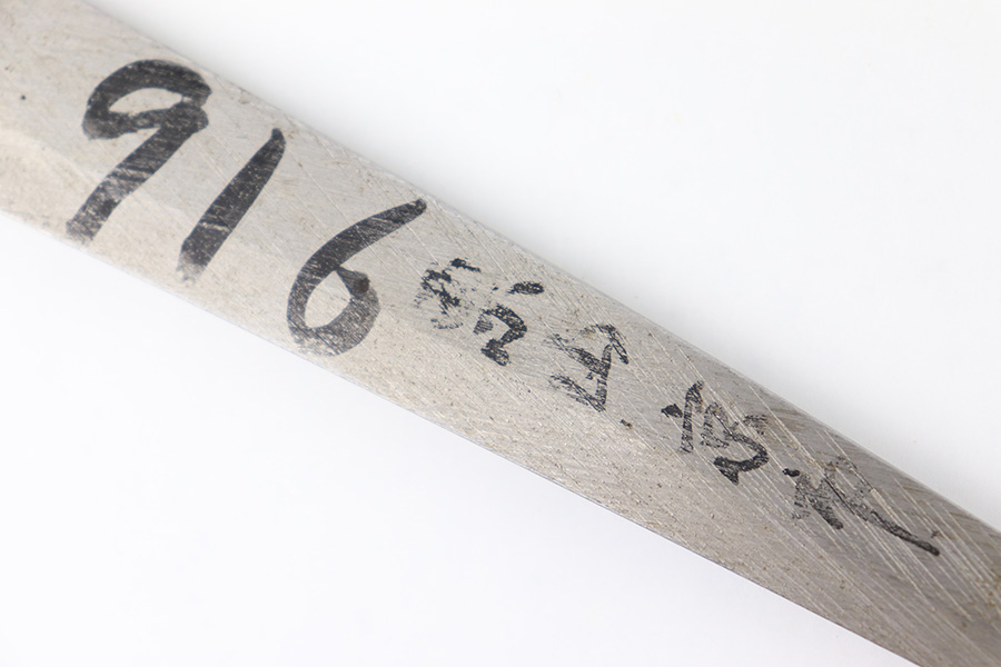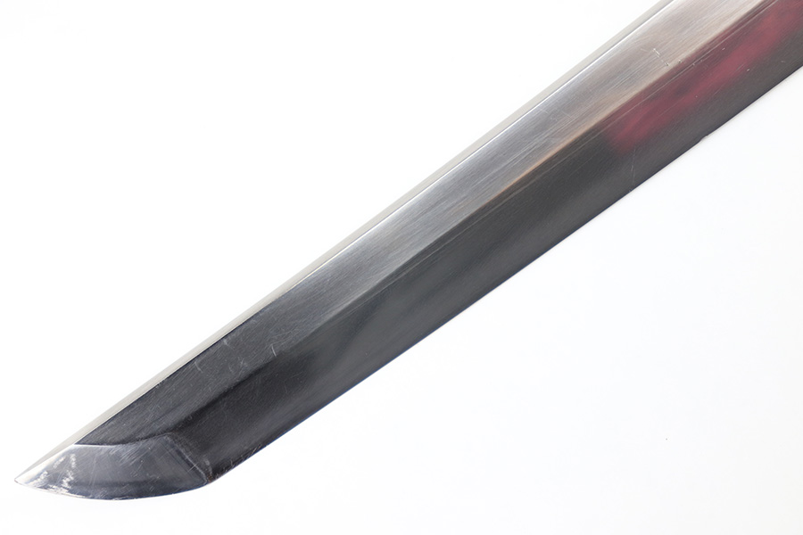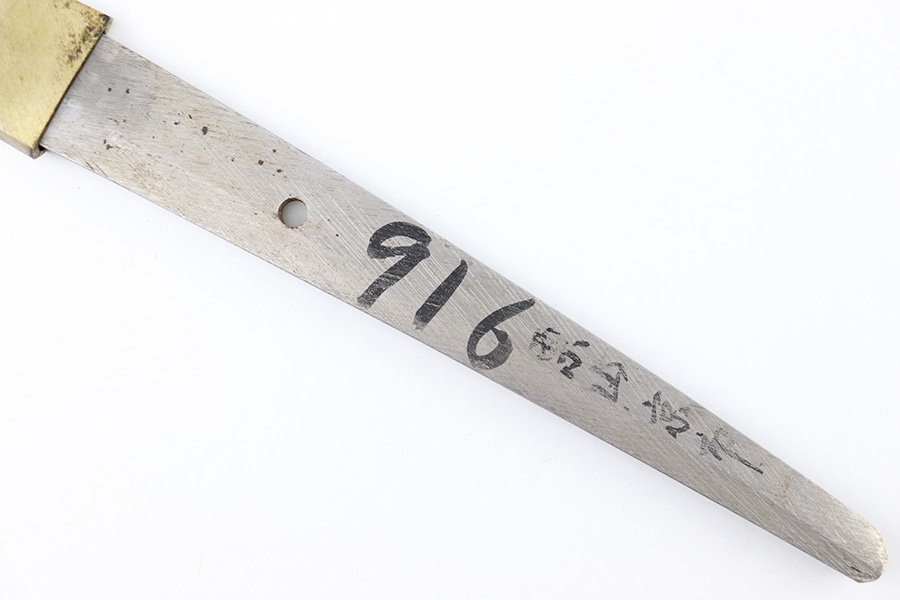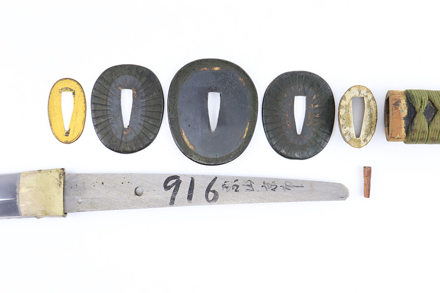 8/4/23 – This is a late WW2 production Naval Officer T97 Sword. The sword blade is naval arsenal stamped on the tang, indicating the blade as factory-made. The blade is in very good condition with some light signs of polishing throughout and a uniform tempered edge. There are a few light surface scratches throughout the blade, but this is mild overall. The fittings are standard late war style, and the handle has normal signs of handling and aging. The scabbard is cracking and slightly chipped at the mouth and along the spine, with small areas of surface black lacquered finish chipped off. The scabbard is still intact however and fits nicely.
