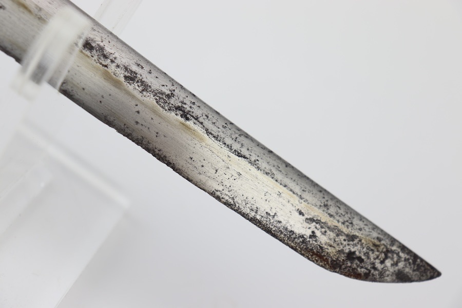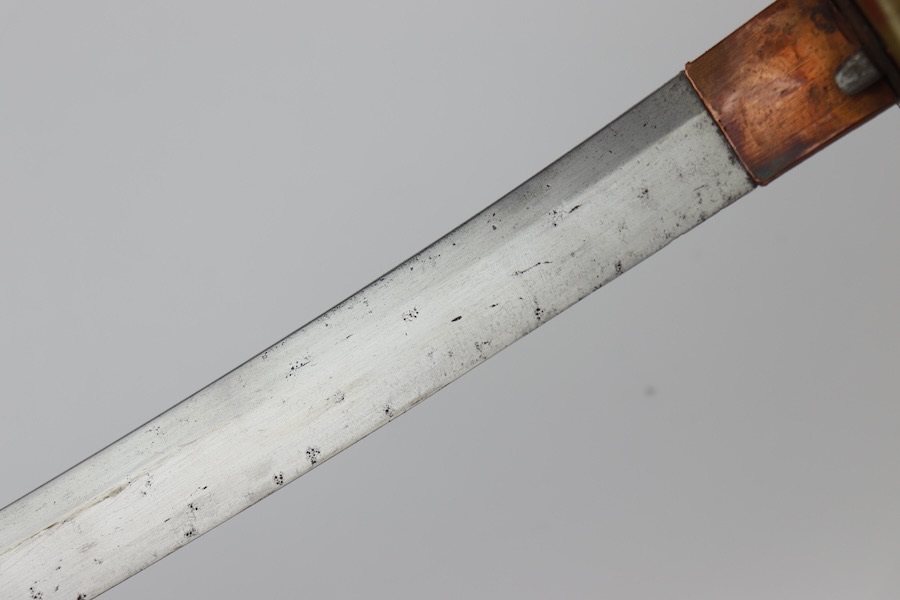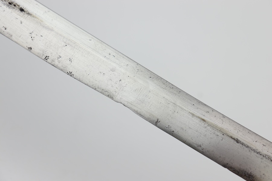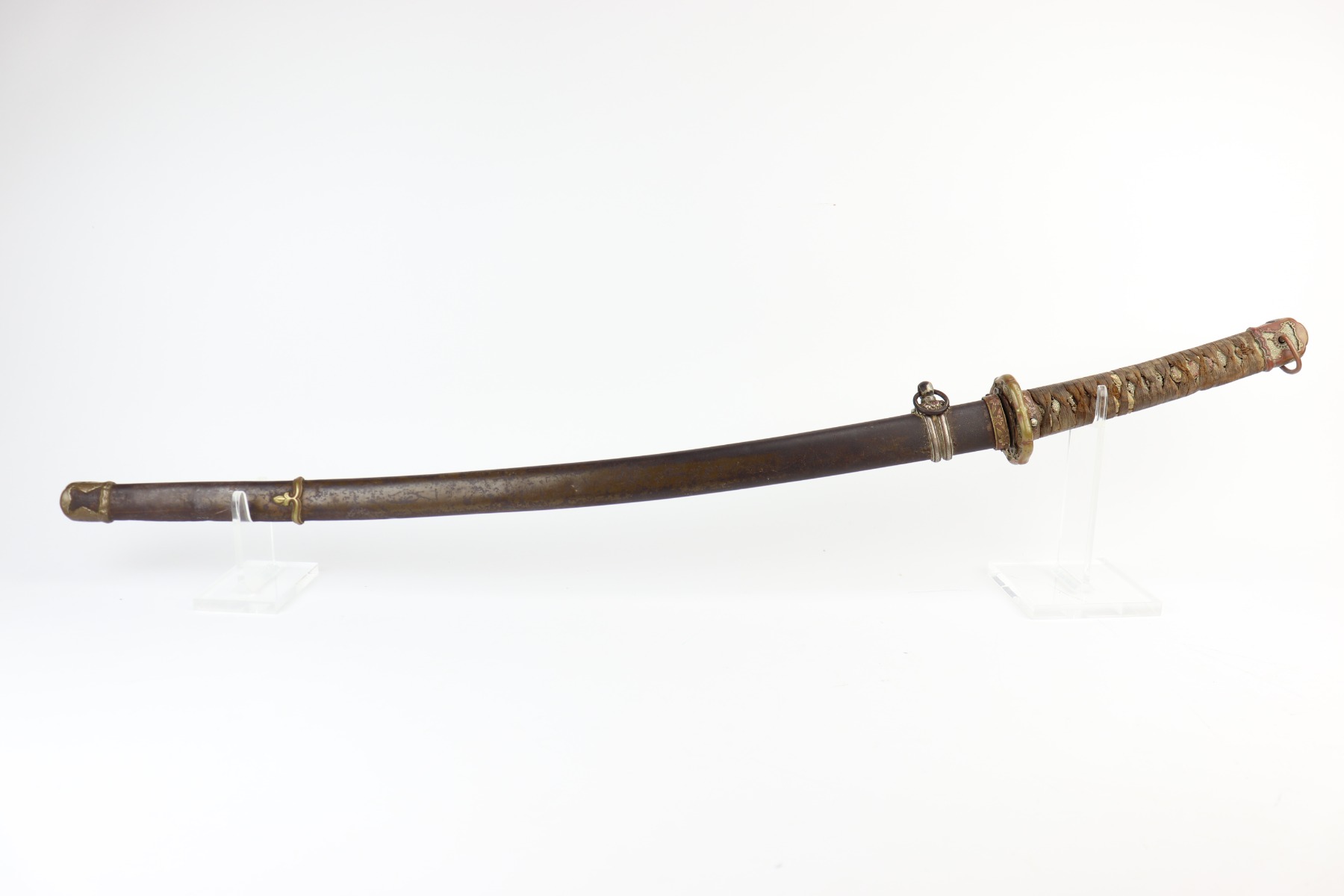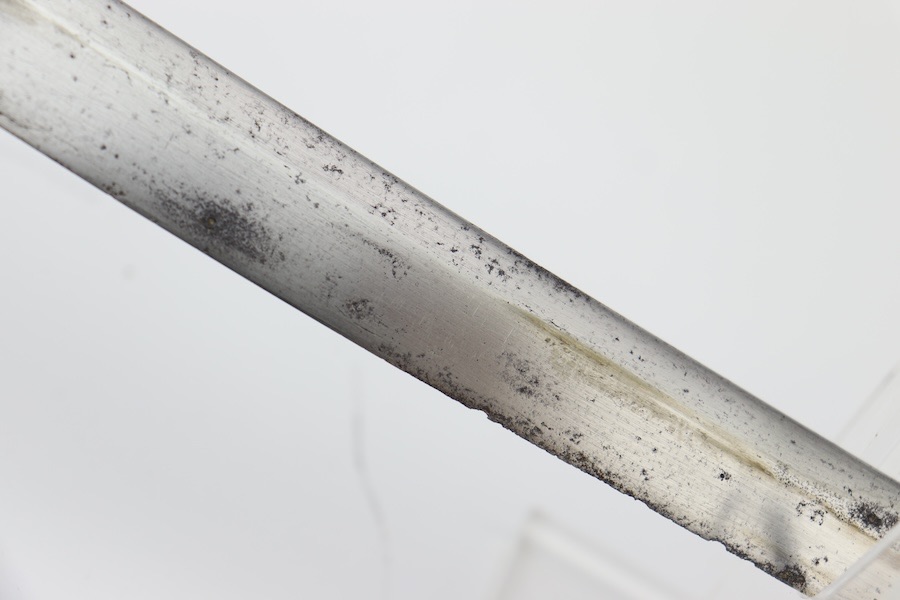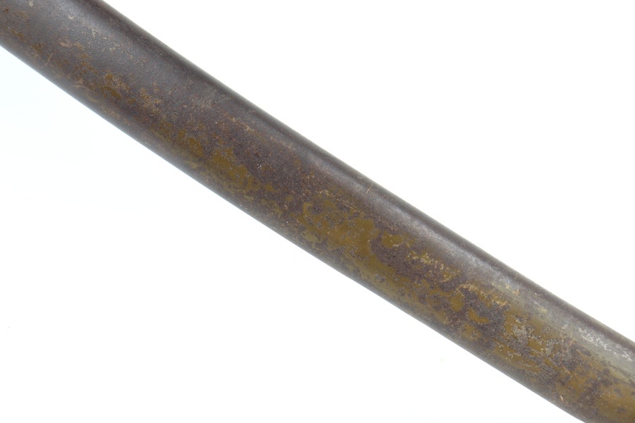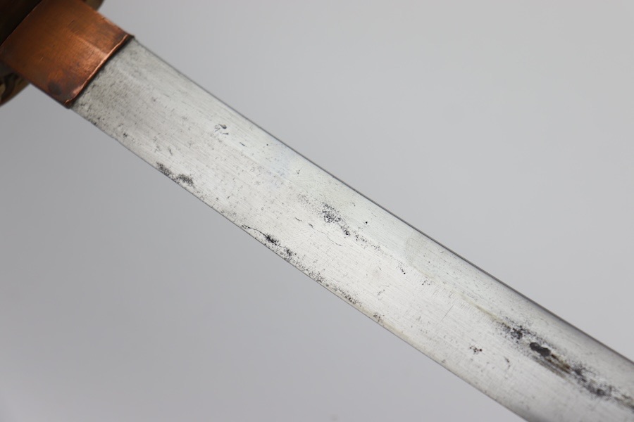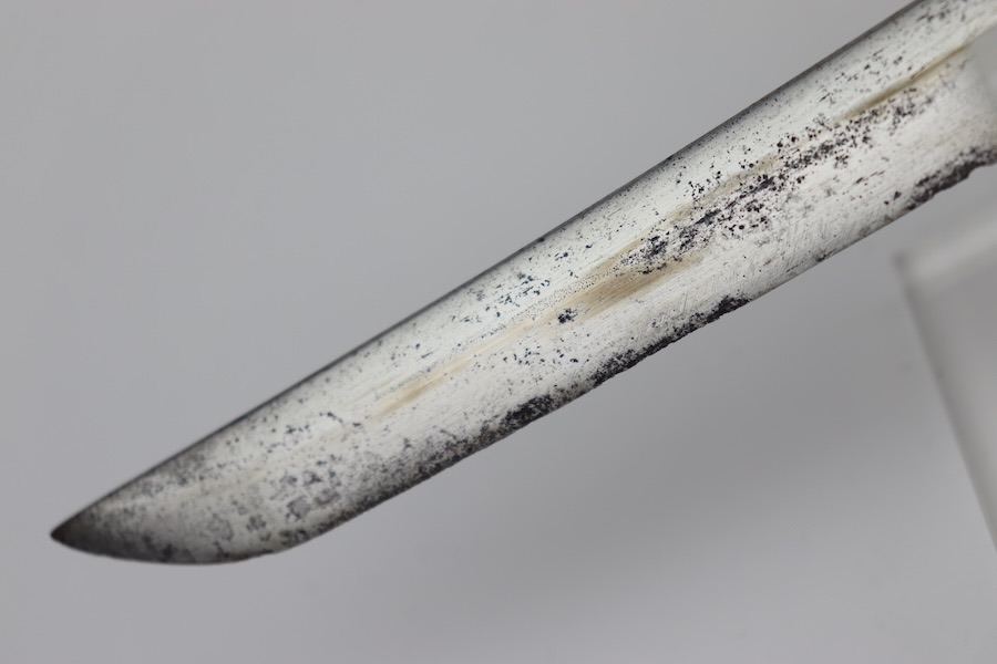 12/27/23 – This is a great condition, late WW2 production NCO Japanese sword. The sword comes with a metal scabbard that has a wooden insert. The scabbard does have a few dents and some mild surface rust. The blade itself has a fair bit of patina and pitting on the right side. The edge has a couple of chips with no signs of sharpening. The cross guard and handle have a bit of wiggle but are still firmly attached. Overall a very cool piece of history.