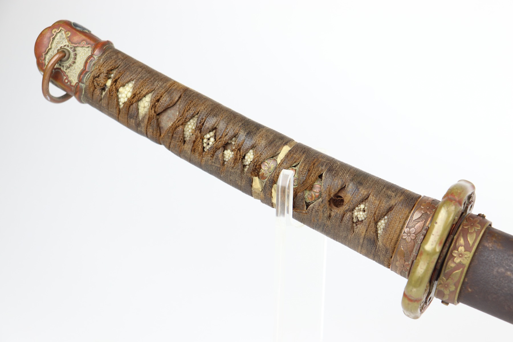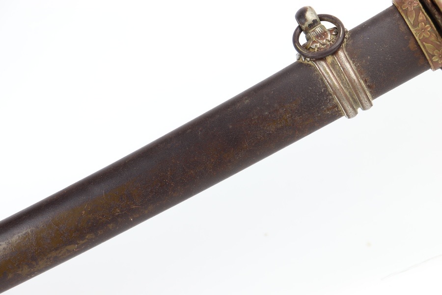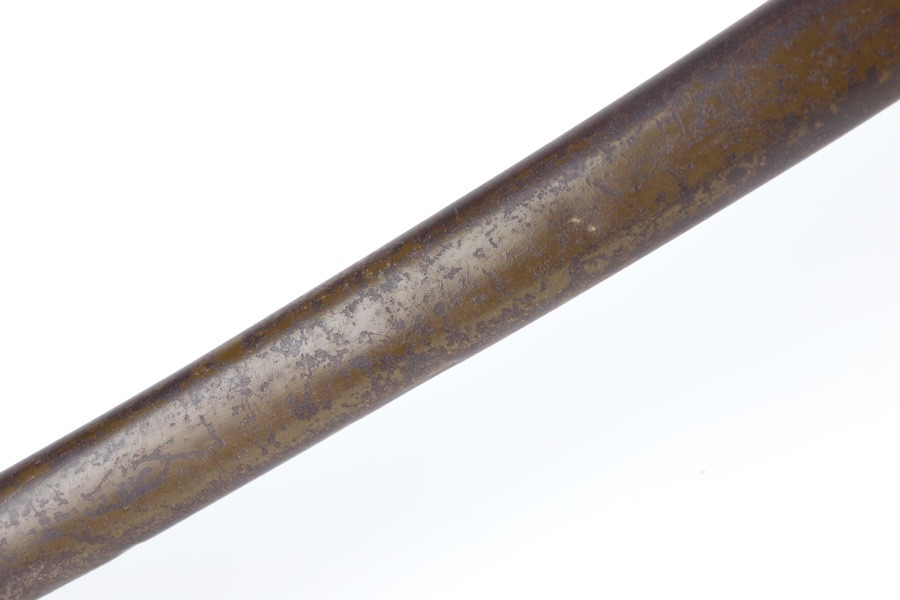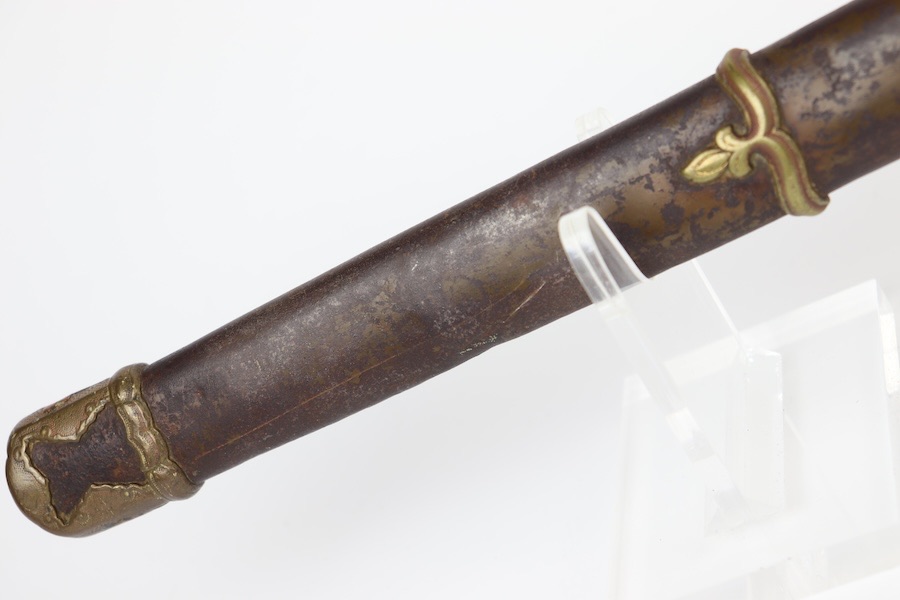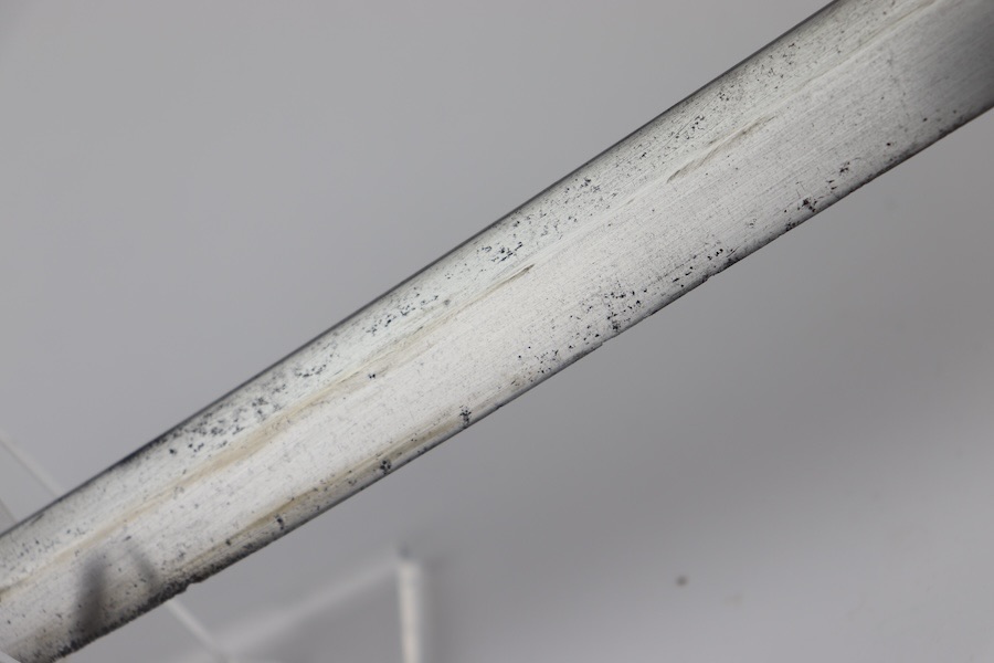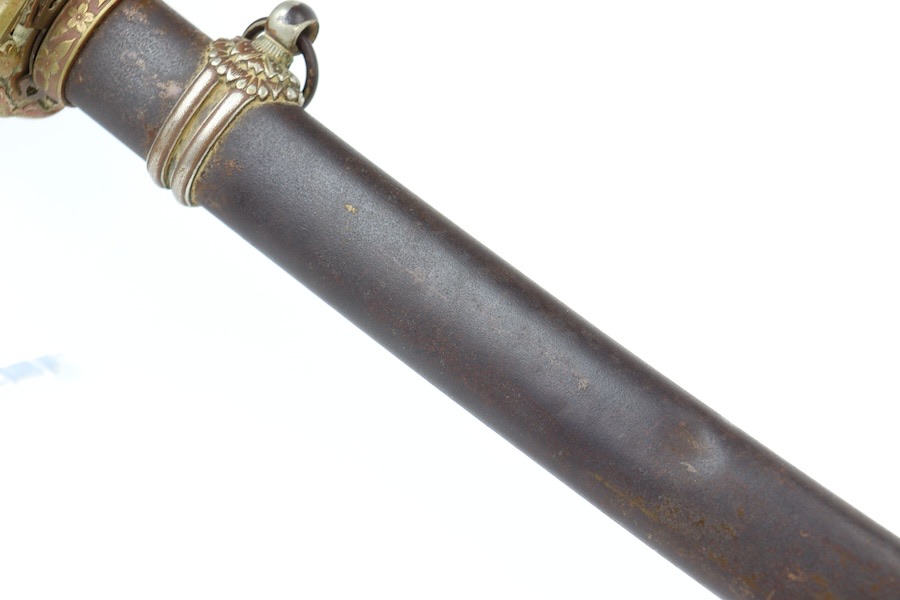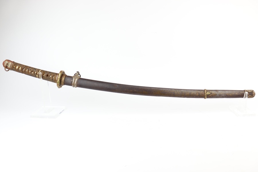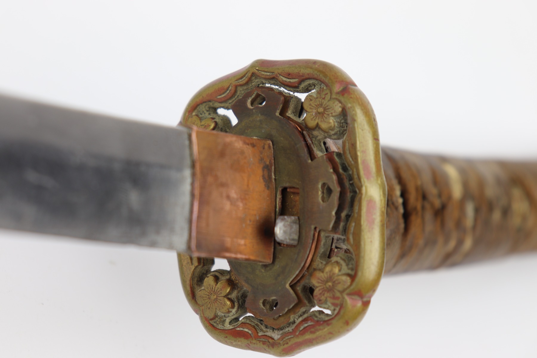 12/27/23 – This is a great condition, late WW2 production NCO Japanese sword. The sword comes with a metal scabbard that has a wooden insert. The scabbard does have a few dents and some mild surface rust. The blade itself has a fair bit of patina and pitting on the right side. The edge has a couple of chips with no signs of sharpening. The cross guard and handle have a bit of wiggle but are still firmly attached. Overall a very cool piece of history.