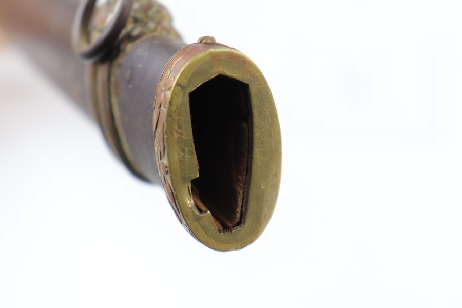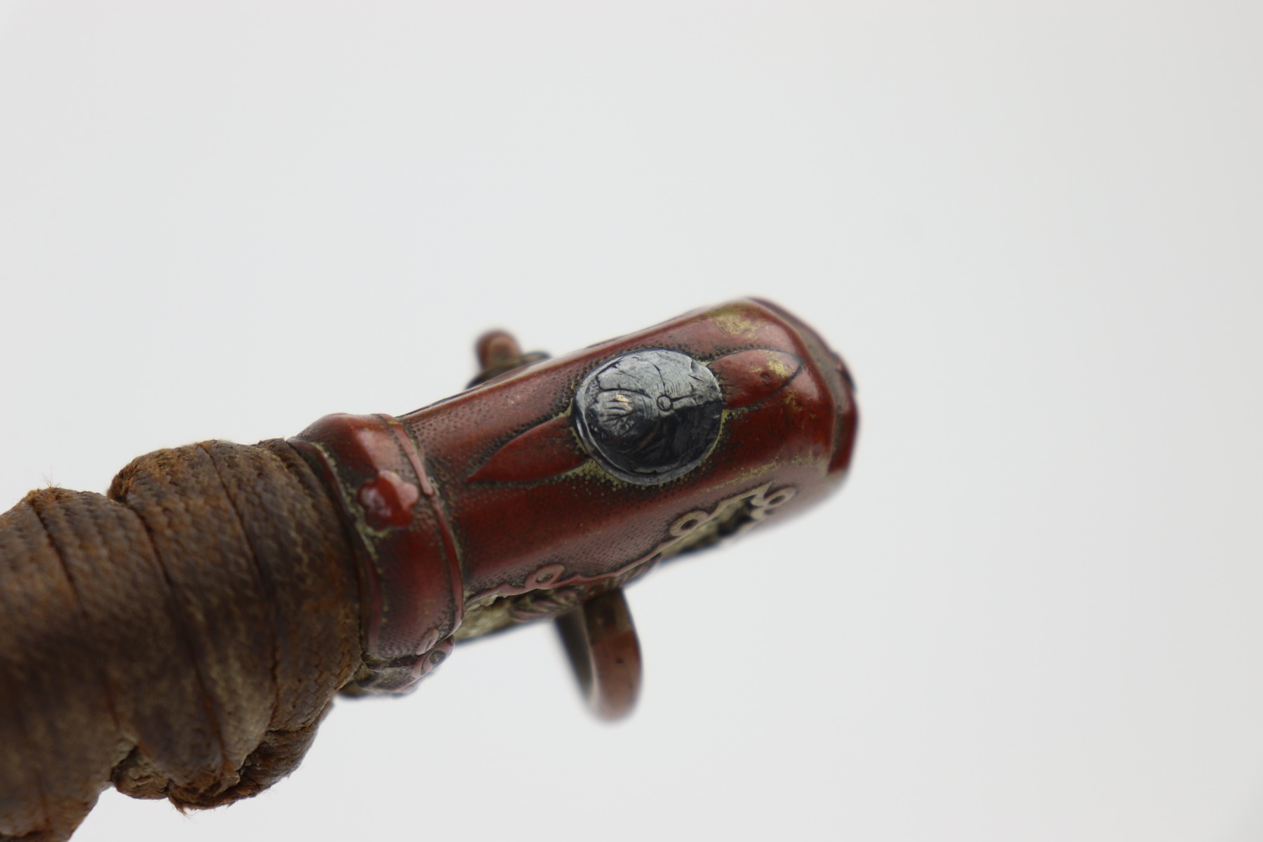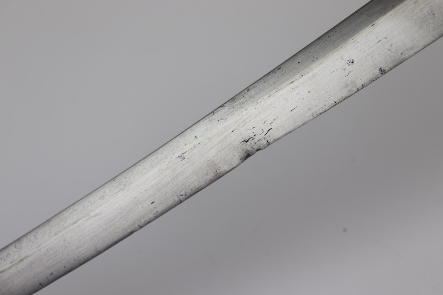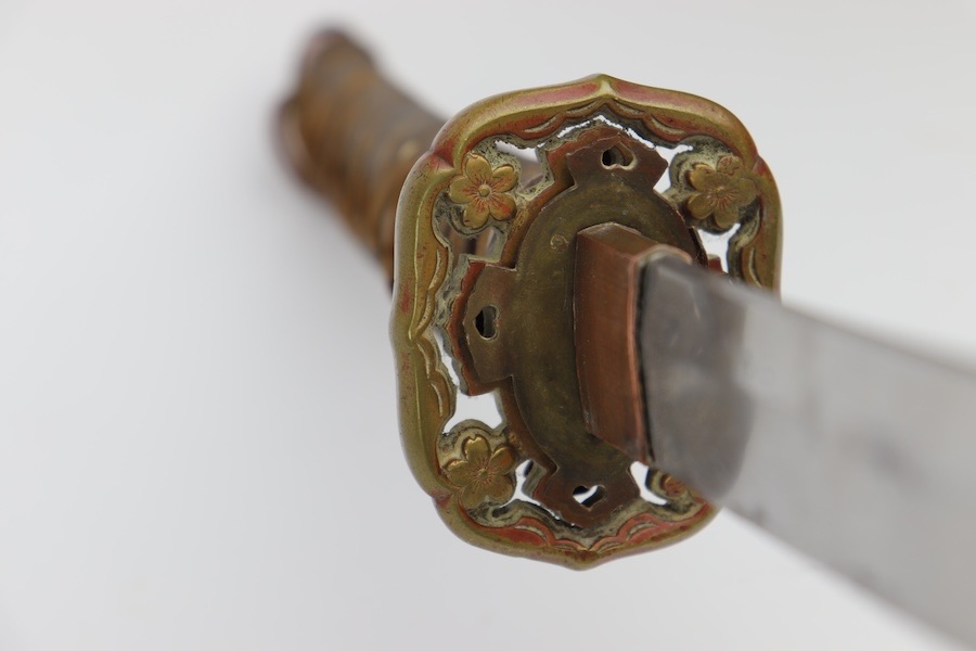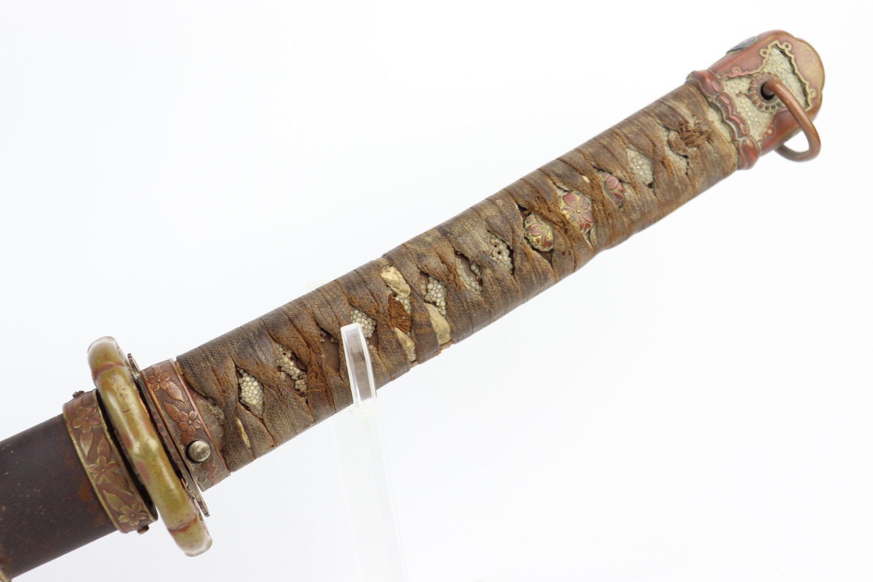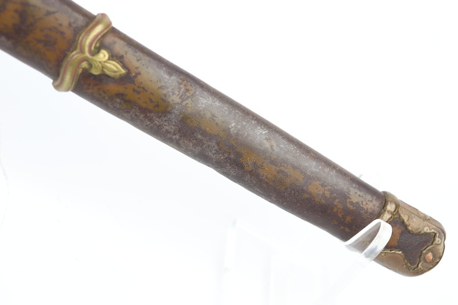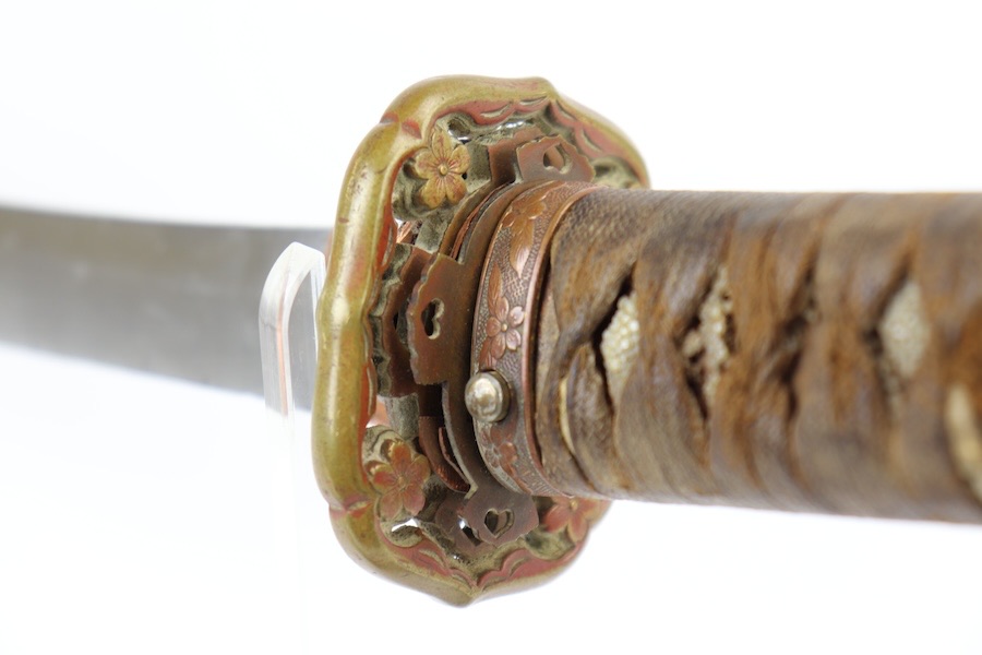 12/27/23 – This is a great condition, late WW2 production NCO Japanese sword. The sword comes with a metal scabbard that has a wooden insert. The scabbard does have a few dents and some mild surface rust. The blade itself has a fair bit of patina and pitting on the right side. The edge has a couple of chips with no signs of sharpening. The cross guard and handle have a bit of wiggle but are still firmly attached. Overall a very cool piece of history.