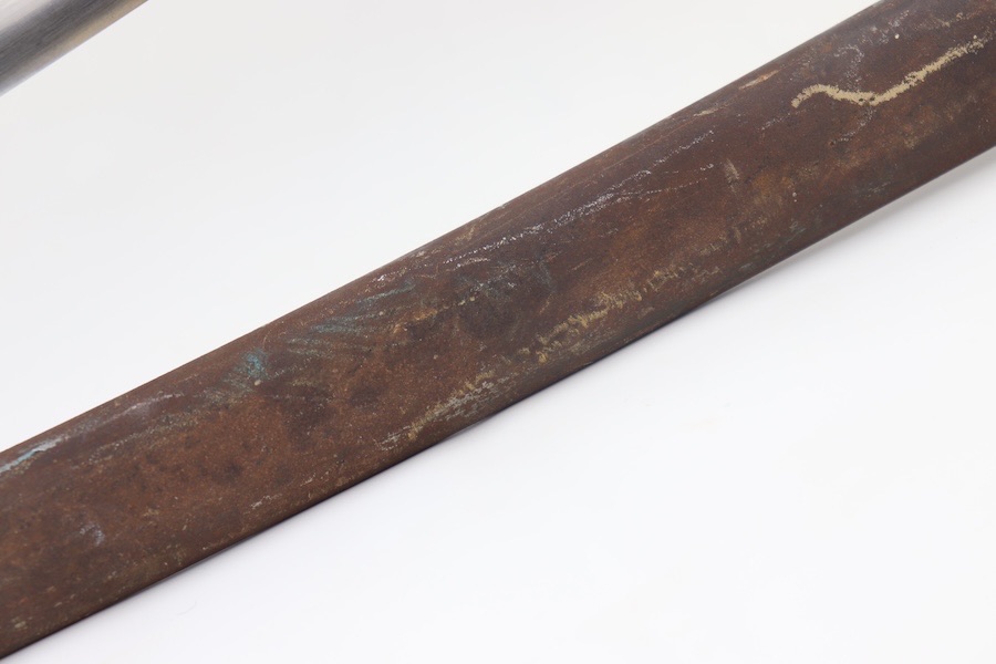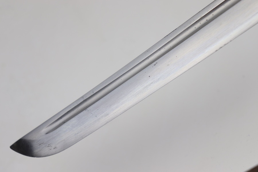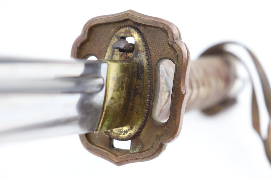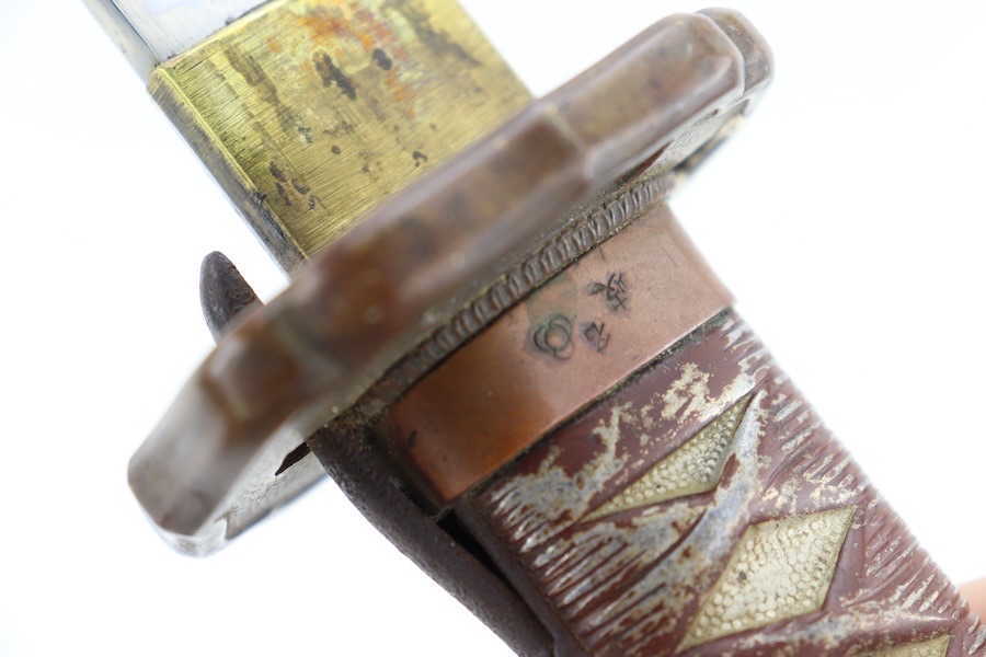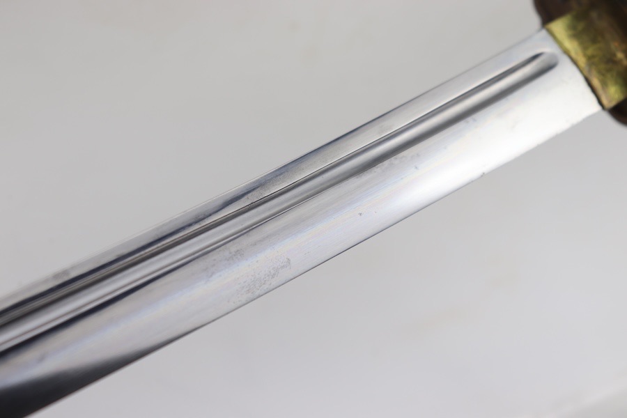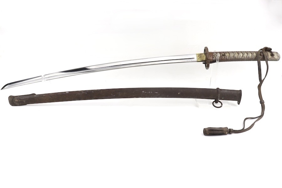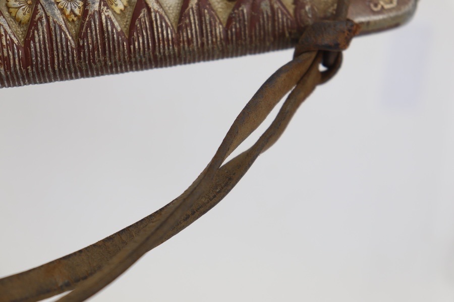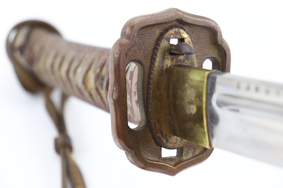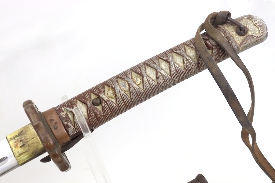 2/27/24 – This is a stunning Late WW2 NCO Japanese officer, Katana, with a leather portapee and scabbard. The sword has the lightest spots of patina here and there, with no amount of heavy corrosion on the blade. The edge has no knicks and has no evidence of sharpening. A serial/batch number on the right side of the blades reads 66873. The scabbard does not match the serial number on the blade and is quite difficult to distinguish. Attached to the pommel is a very nice leather portapee not commonly seen on these swords. The scabbard has no original paint left but is free from dents or cracks.