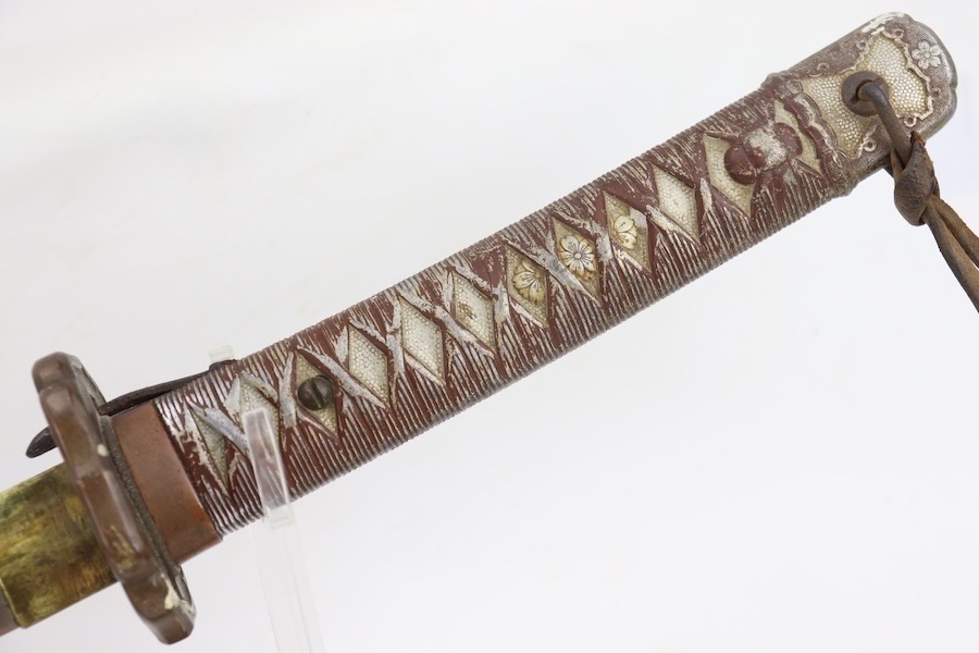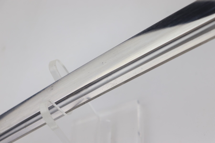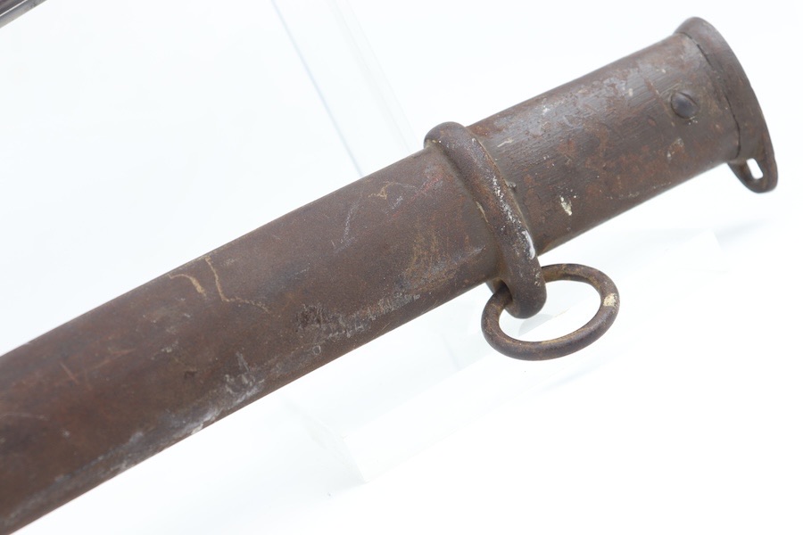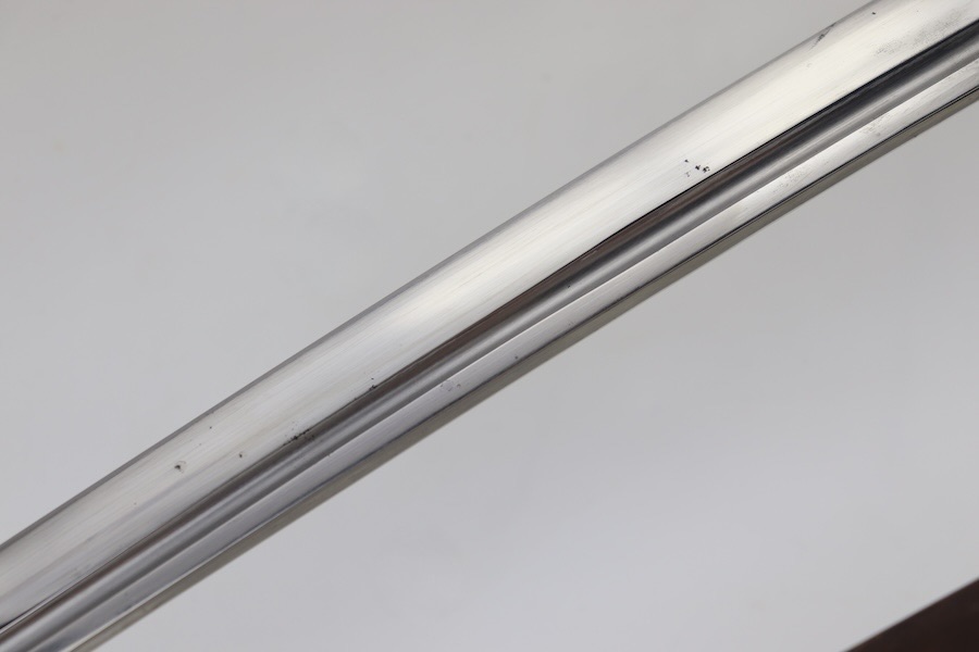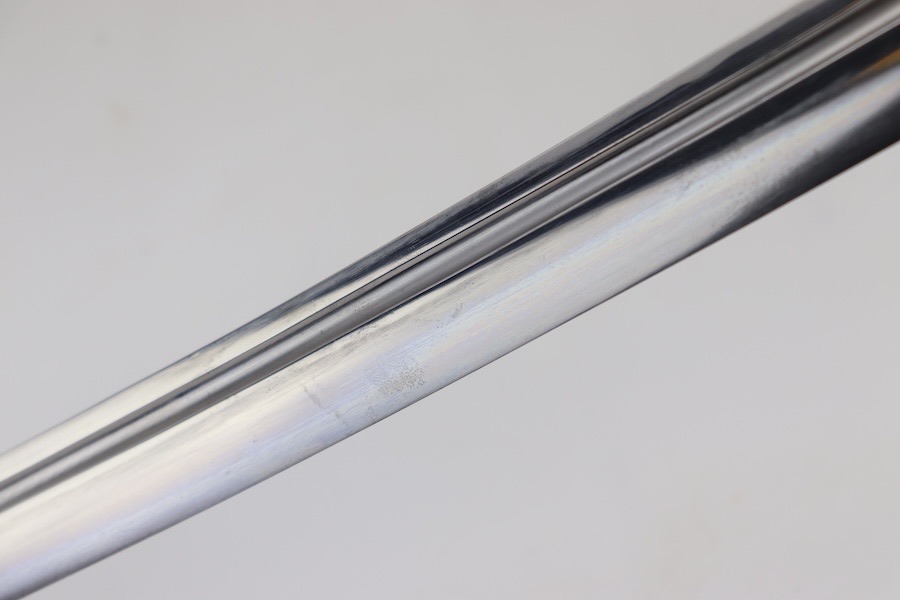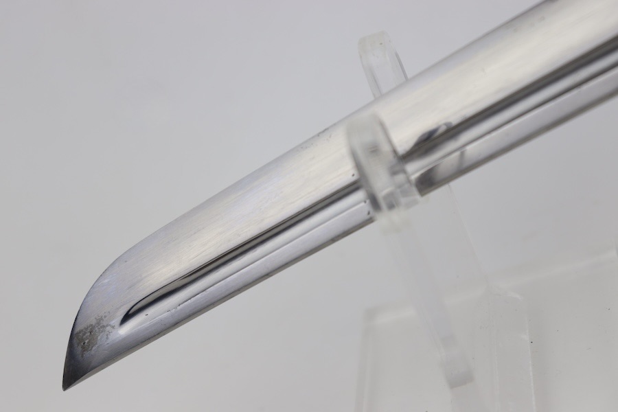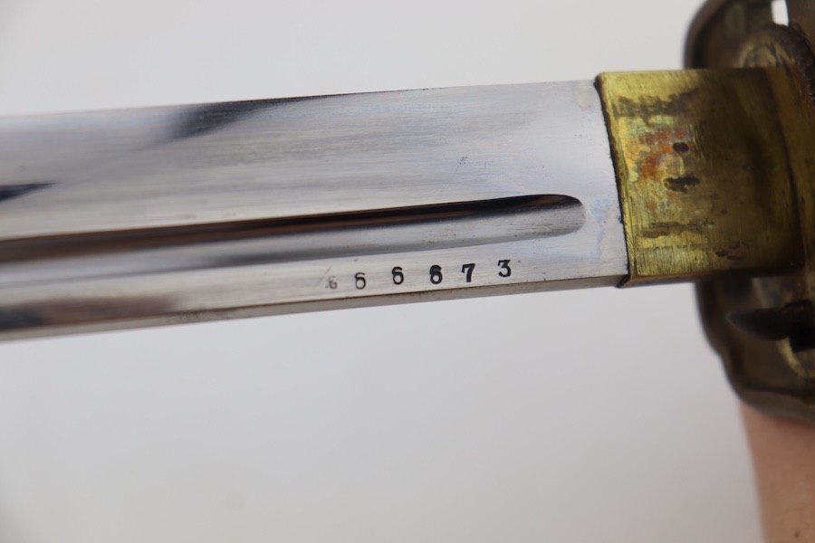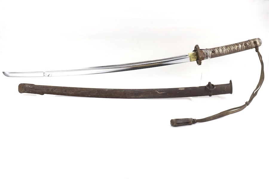 2/27/24 – This is a stunning Late WW2 NCO Japanese officer, Katana, with a leather portapee and scabbard. The sword has the lightest spots of patina here and there, with no amount of heavy corrosion on the blade. The edge has no knicks and has no evidence of sharpening. A serial/batch number on the right side of the blades reads 66873. The scabbard does not match the serial number on the blade and is quite difficult to distinguish. Attached to the pommel is a very nice leather portapee not commonly seen on these swords. The scabbard has no original paint left but is free from dents or cracks.