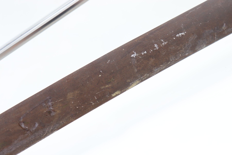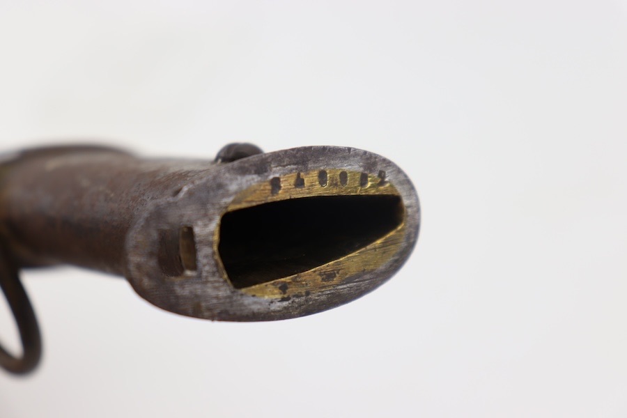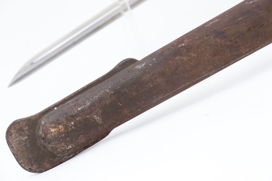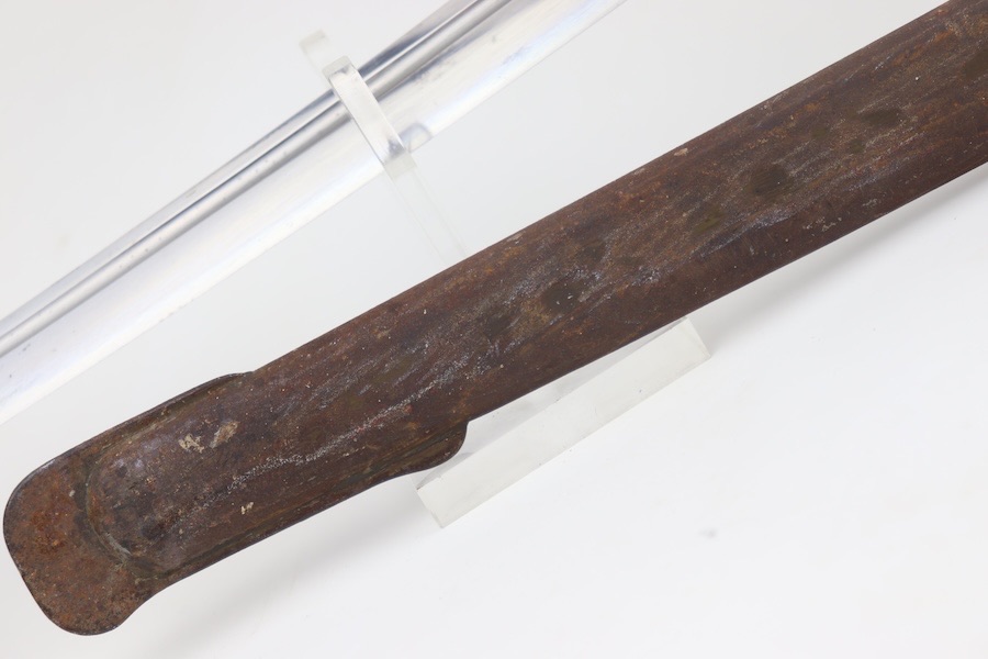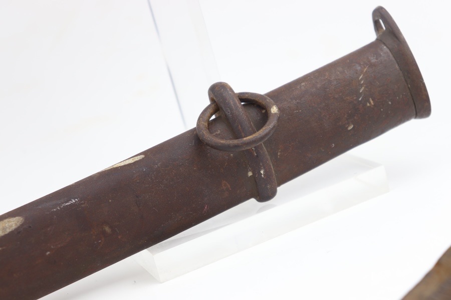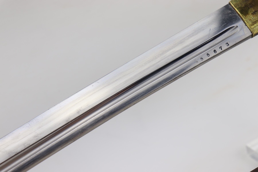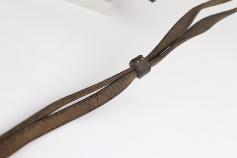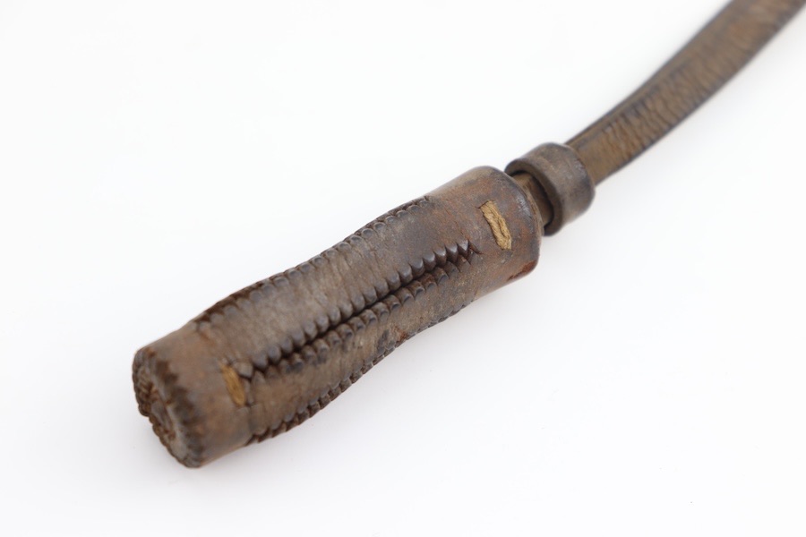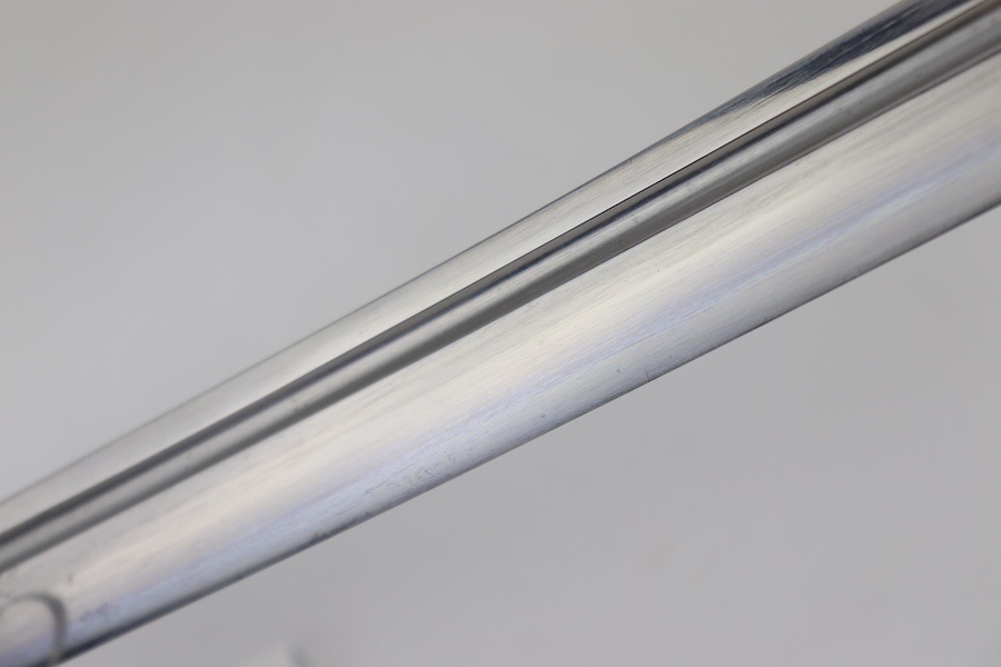2/27/24 – This is a stunning Late WW2 NCO Japanese officer, Katana, with a leather portapee and scabbard. The sword has the lightest spots of patina here and there, with no amount of heavy corrosion on the blade. The edge has no knicks and has no evidence of sharpening. A serial/batch number on the right side of the blades reads 66873. The scabbard does not match the serial number on the blade and is quite difficult to distinguish. Attached to the pommel is a very nice leather portapee not commonly seen on these swords. The scabbard has no original paint left but is free from dents or cracks.