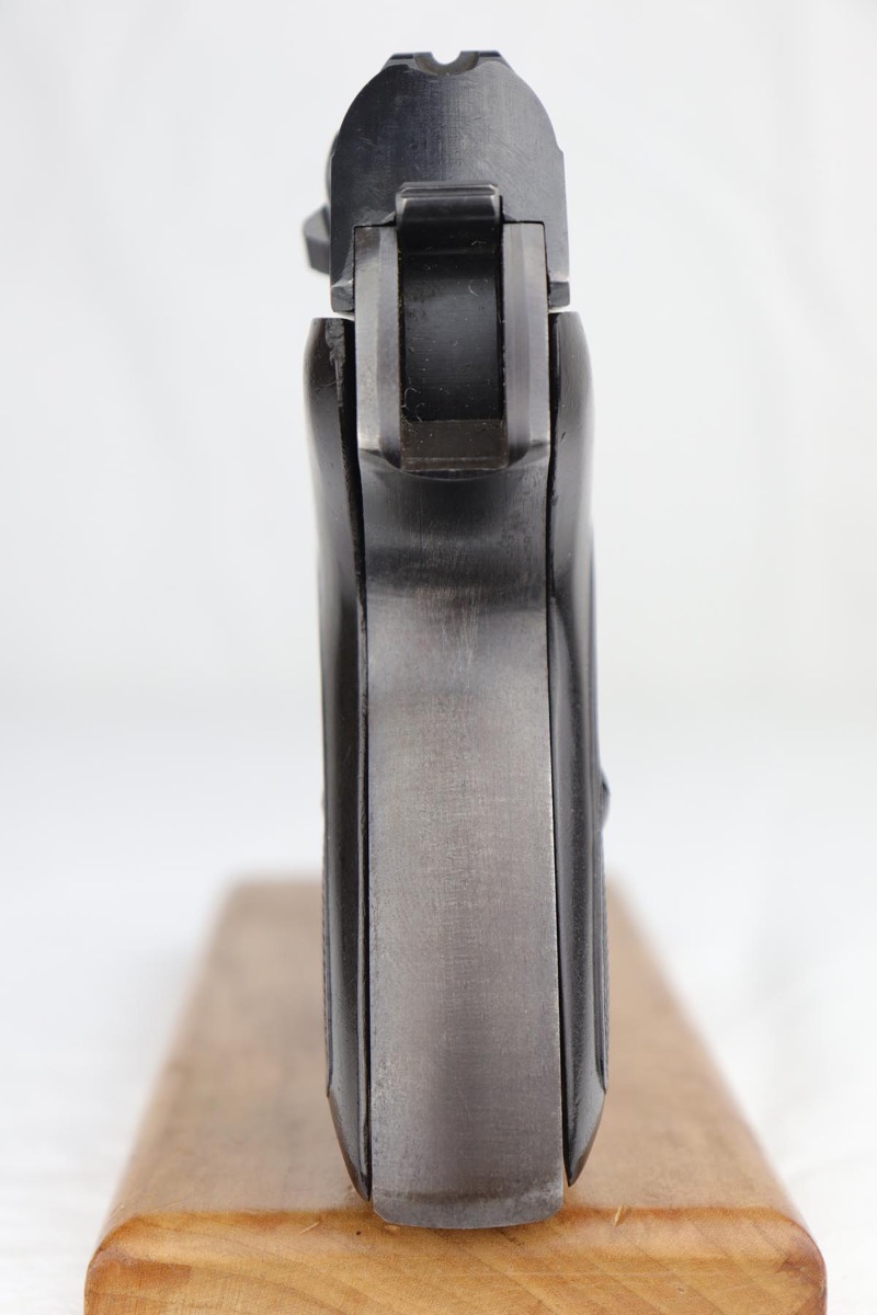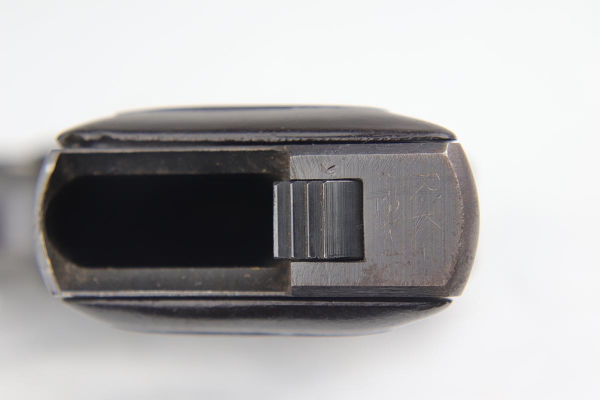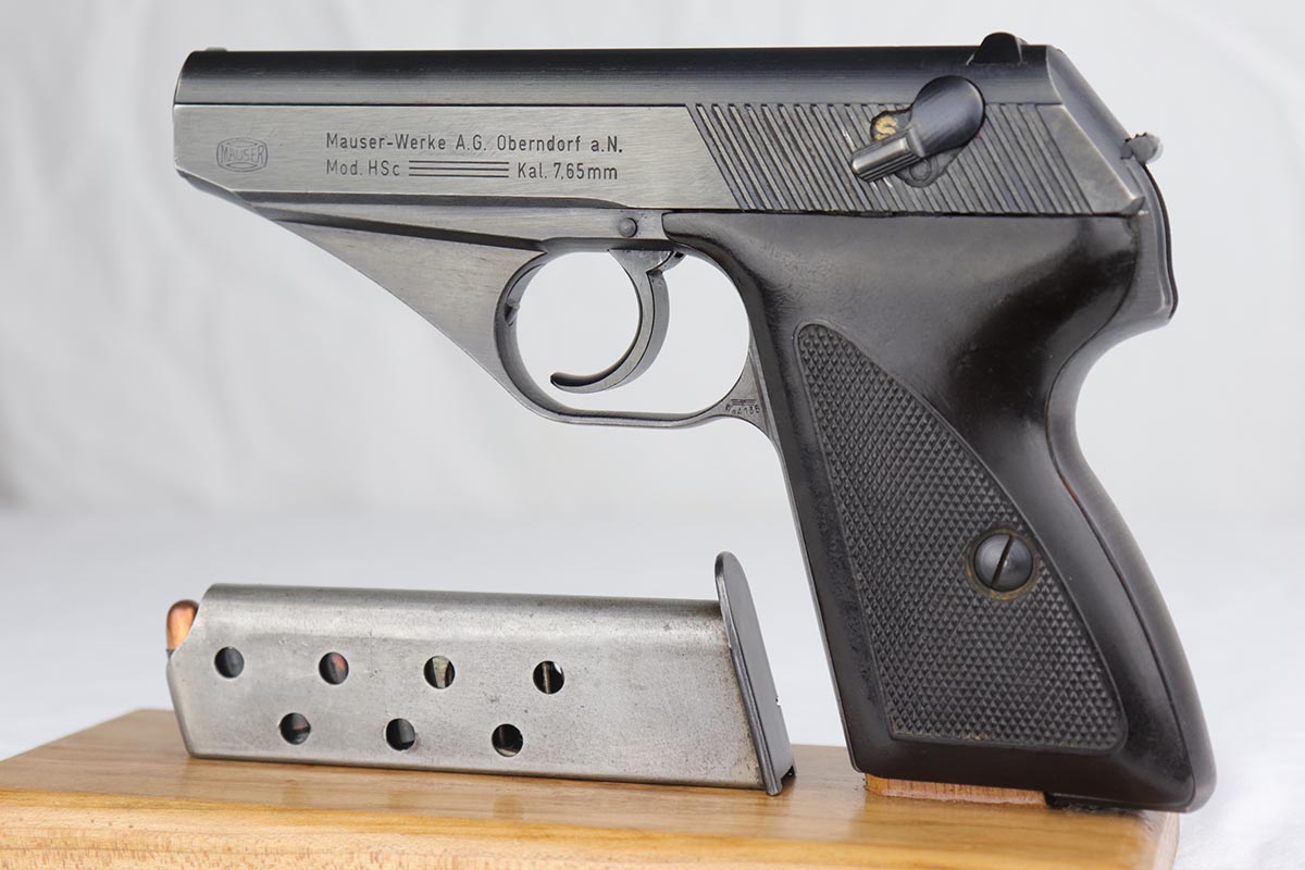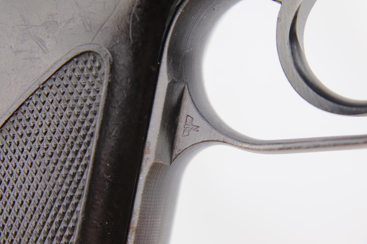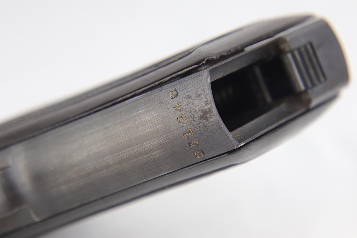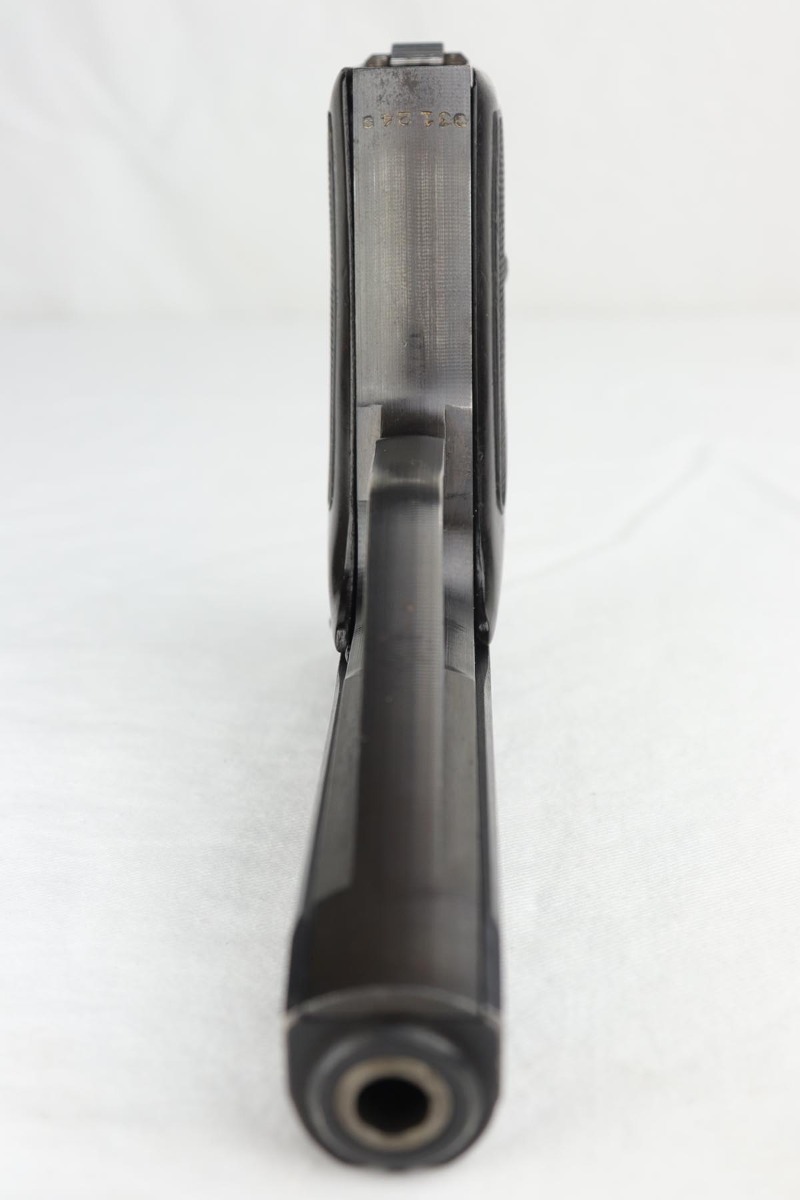 1/9/19 – This is a late WW2 production Mauser HSc pistol. The pistol has a late war dull blued finish that’s in about 96-97% condition. Almost all of the wear on this gun is on the front and back straps. The front strap has some thinning and a small area of dark patina / beginning signs of rust. The back strap has thinning as well with light brown patina throughout. Comes with late war bakelite grips. There’s very minor chewing on the base of the left panel near the front strap (front corner of the base). The bore is 9/10 with very light frosting but overall excellent. Beautiful late war example. Guaranteed original and authentic.